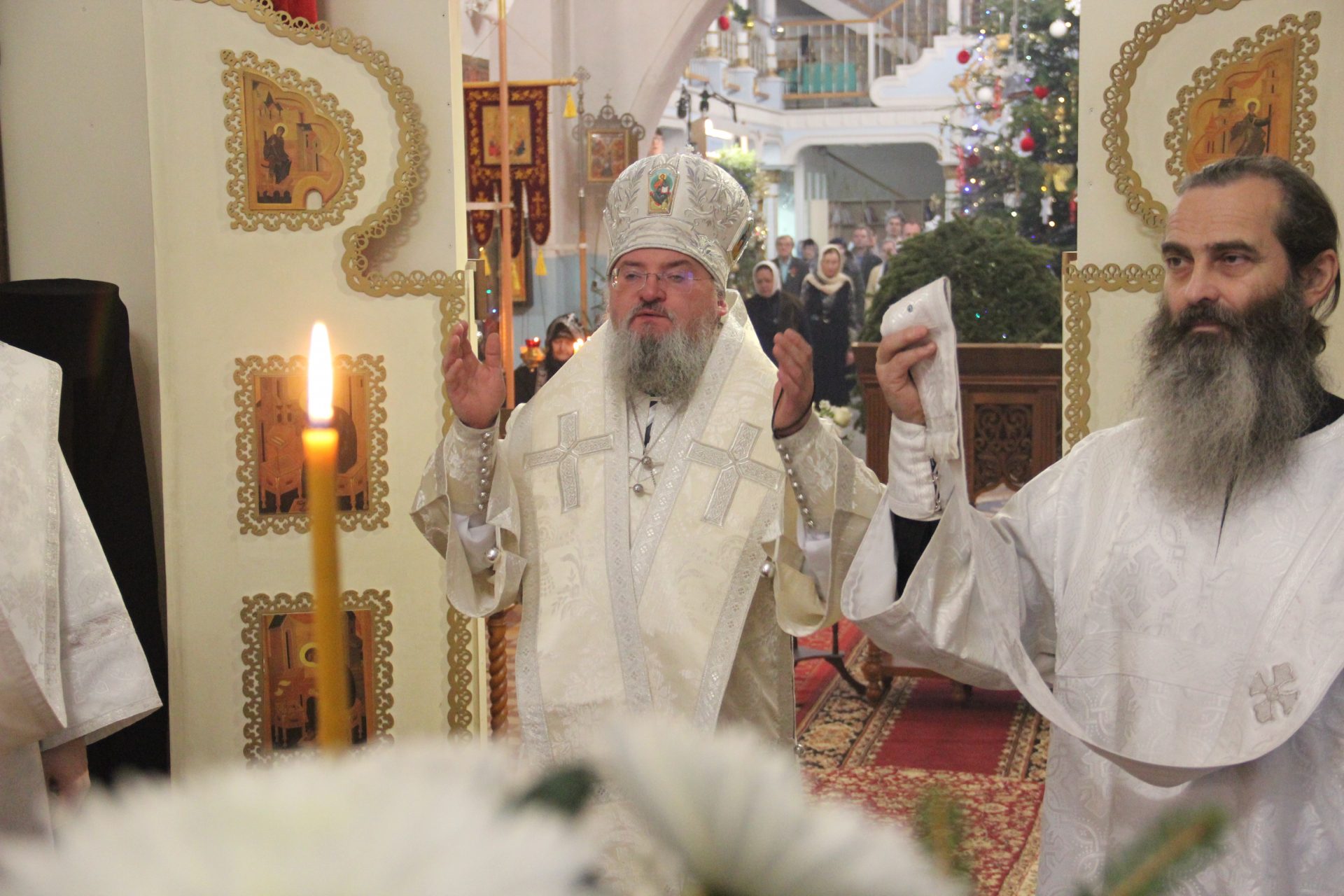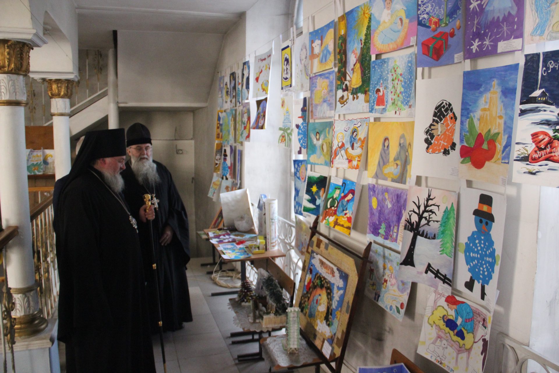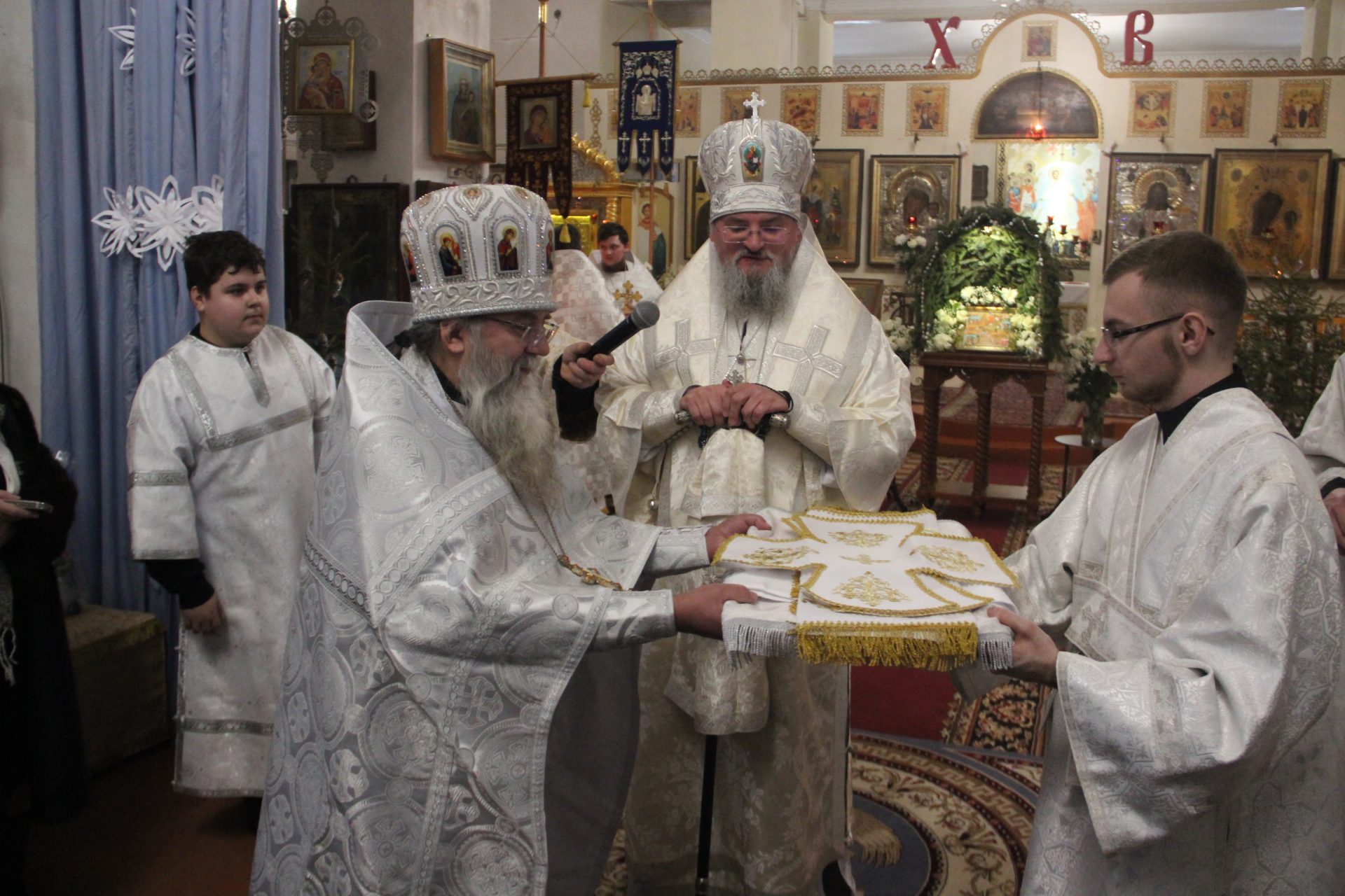 Владыка передал в дар собору комплект покровов на Евхаристические сосуды и закладку в Святое Евангелие. Юные прихожане поздравили архипастыря со светлым праздником Рождества Христова.