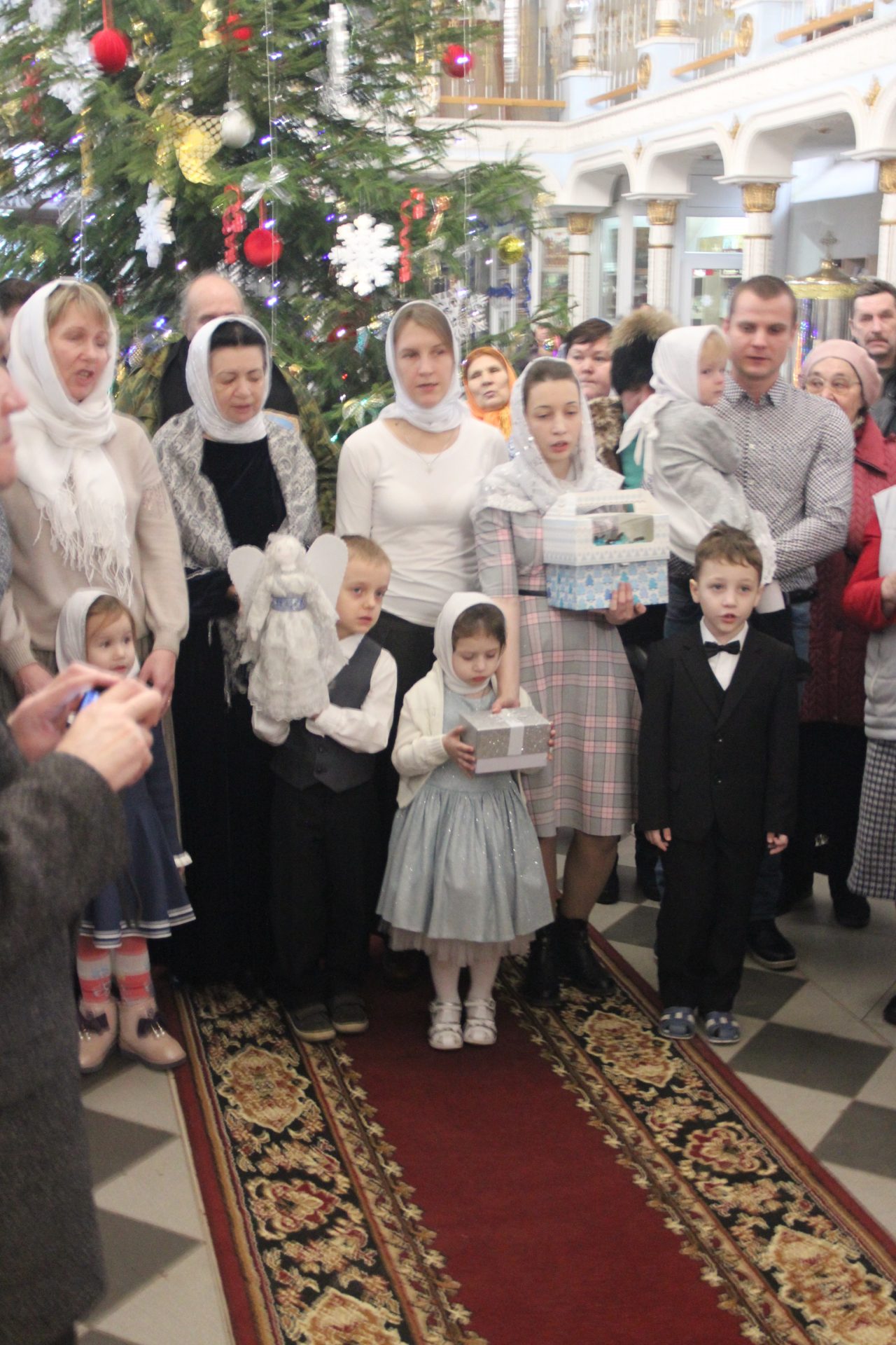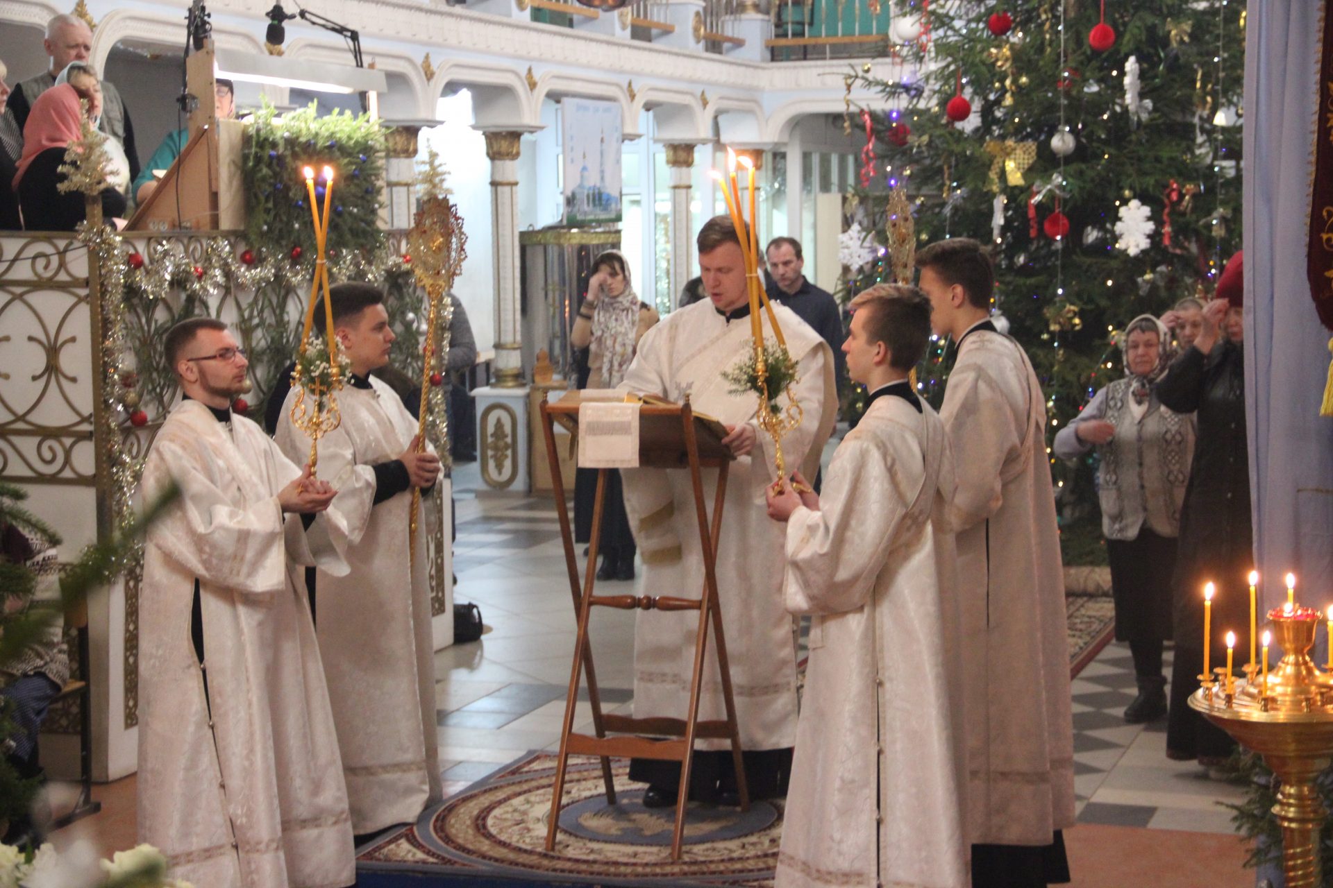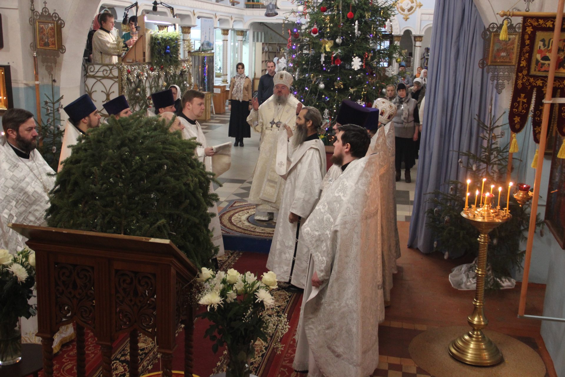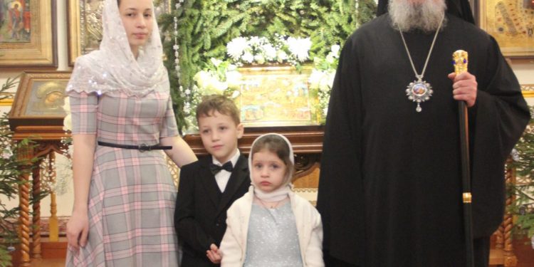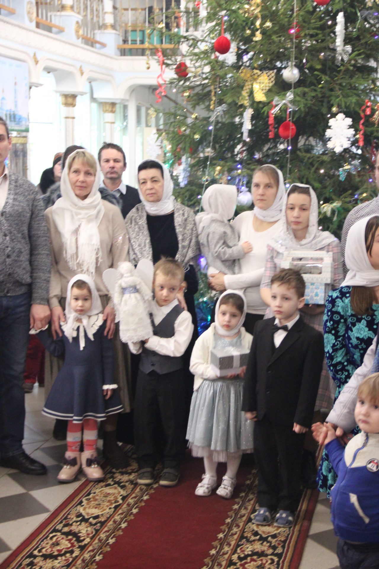 Владыка передал в дар собору комплект покровов на Евхаристические сосуды и закладку в Святое Евангелие. Юные прихожане поздравили архипастыря со светлым праздником Рождества Христова.