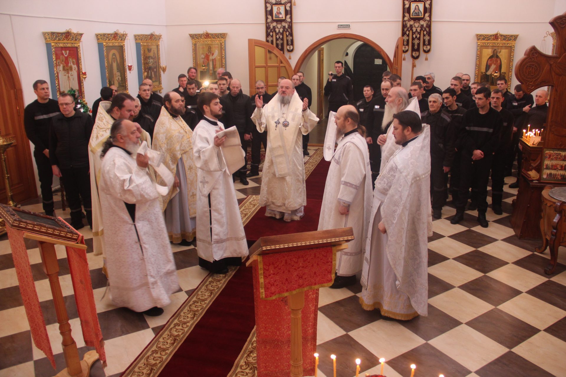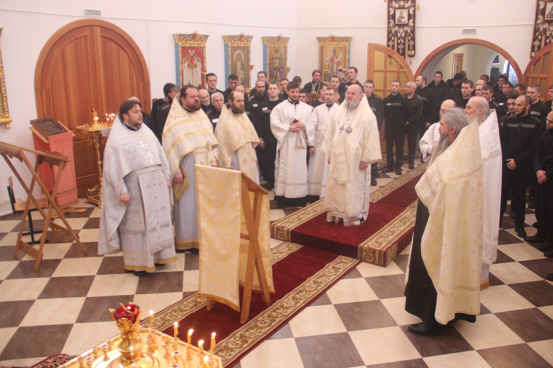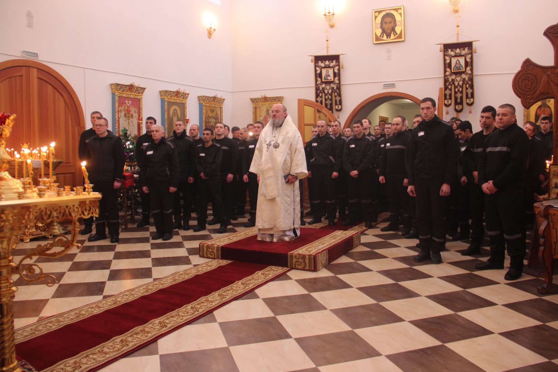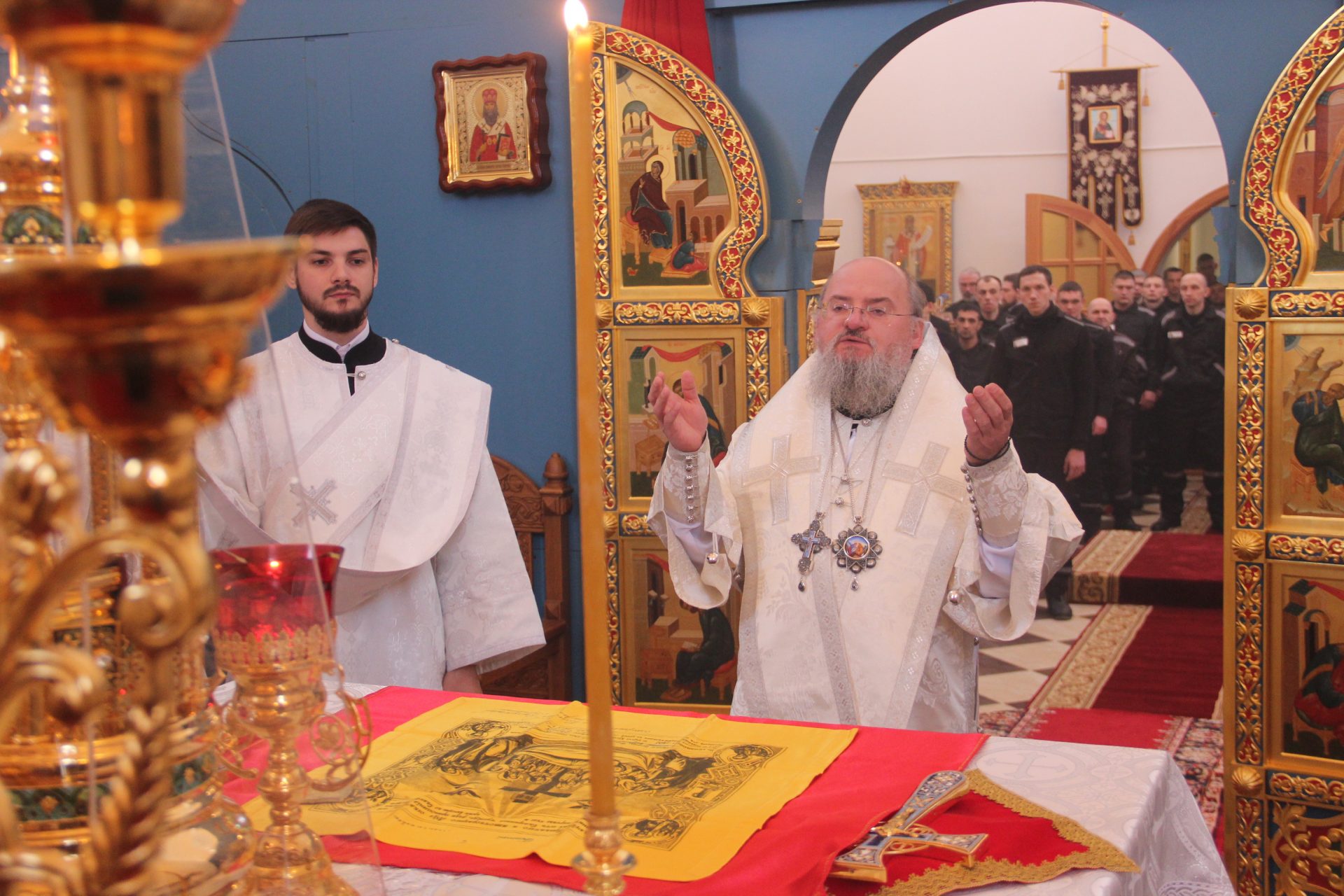Архипастырю сослужили: протоиерей Дмитрий Сахаров – глава отдела по работе с исправительными учреждениями Козельской епархии, протоиерей Сергий Сычев, протоиерей Антоний Хатунцев, диакон Евгений Васильев, иеросхимонах Серафим, иеромонах Силуан – насельники монастыря Оптина Пустынь, окормляющие осужденных.