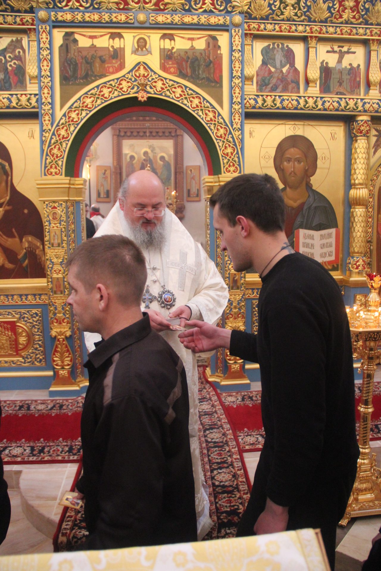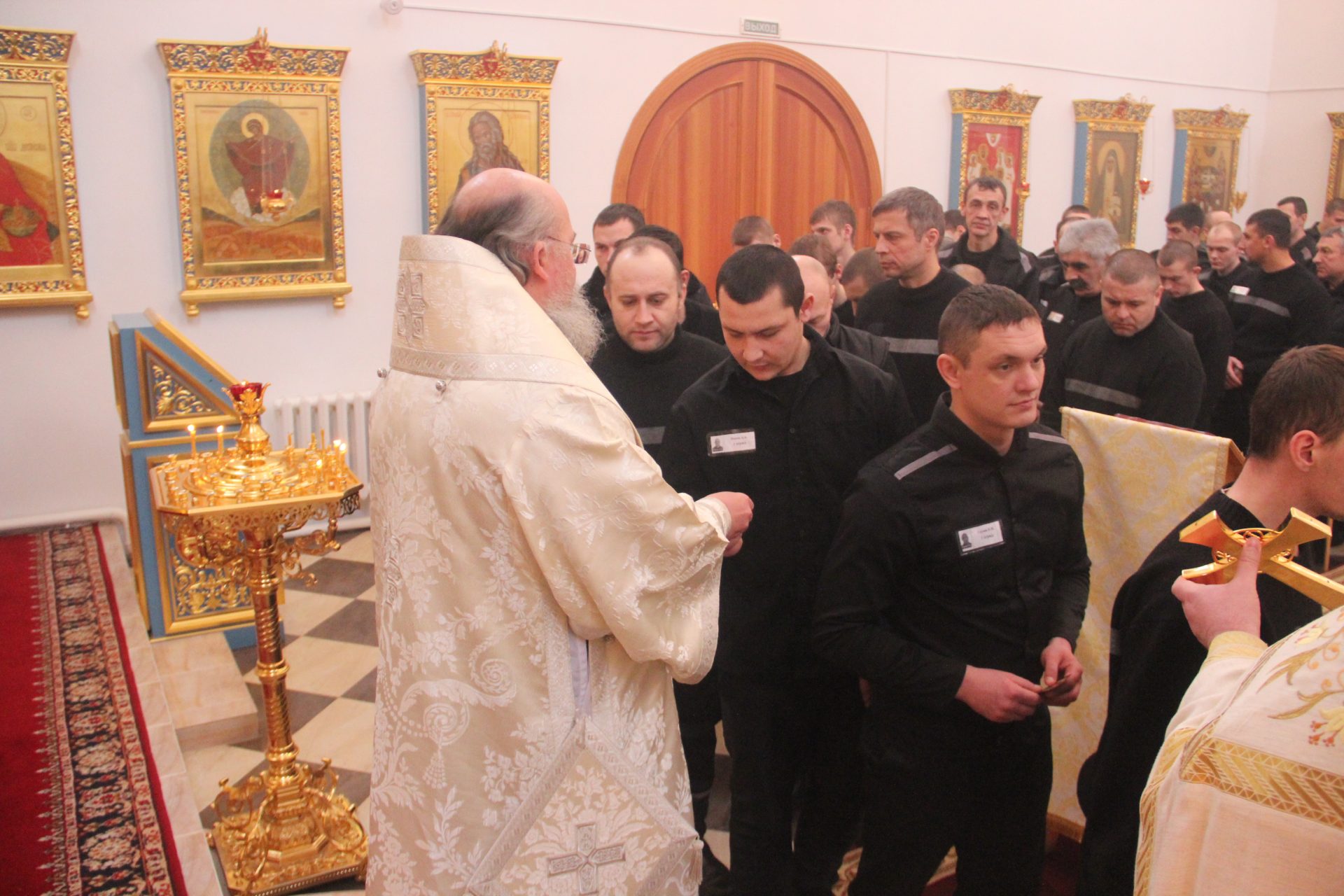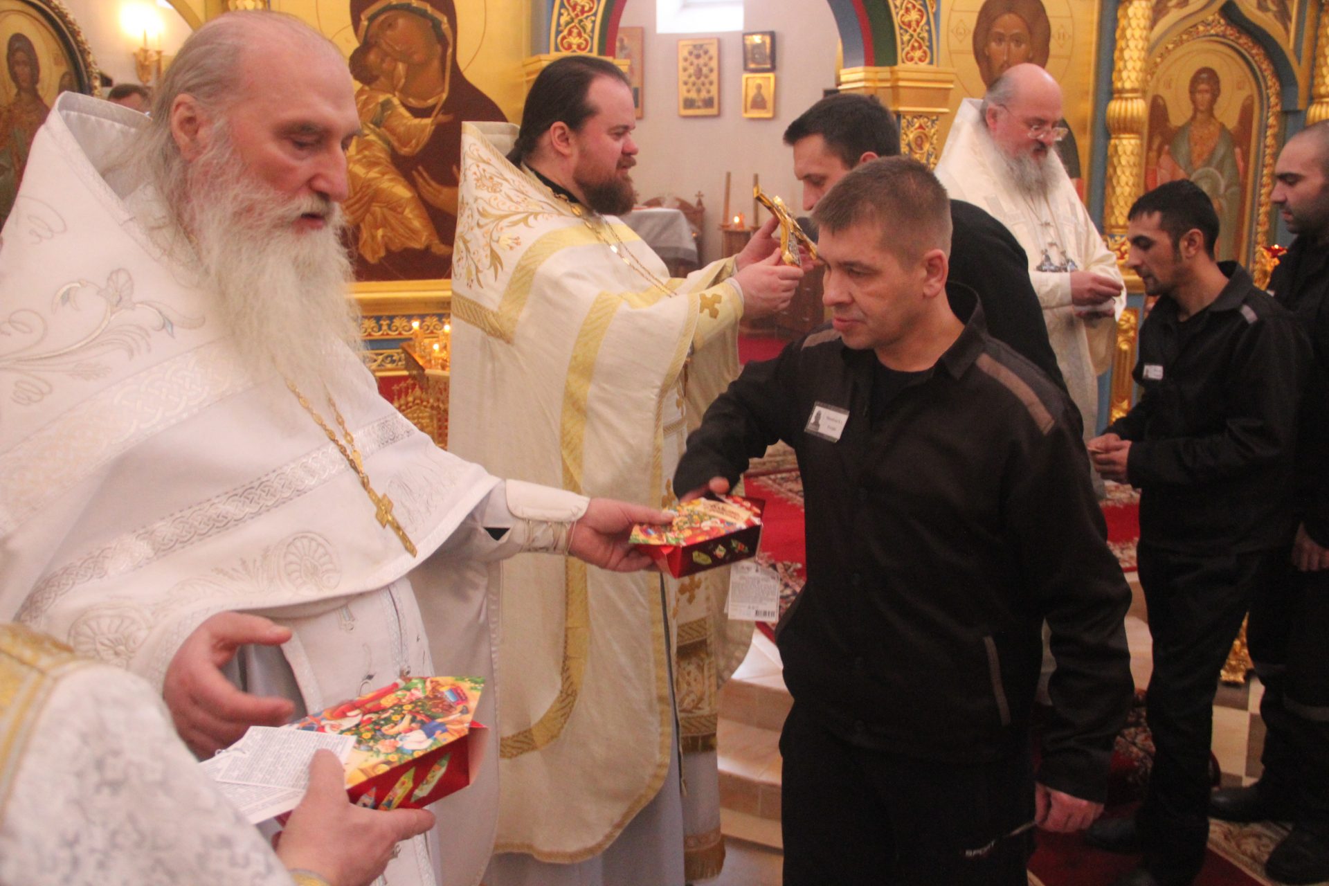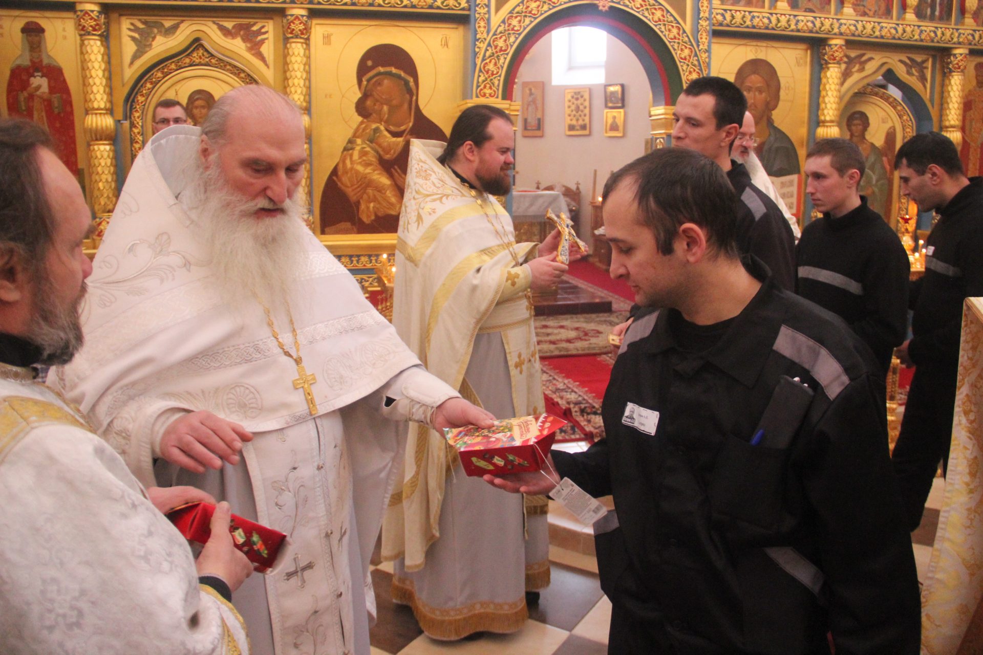 В завершении богослужения владыка поздравил молящихся с праздником и произнес проповедь. Всем присутствующим были розданы небольшие иконки и сладкие подарки. Встреча с заключенными завершилась общим чаепитием.