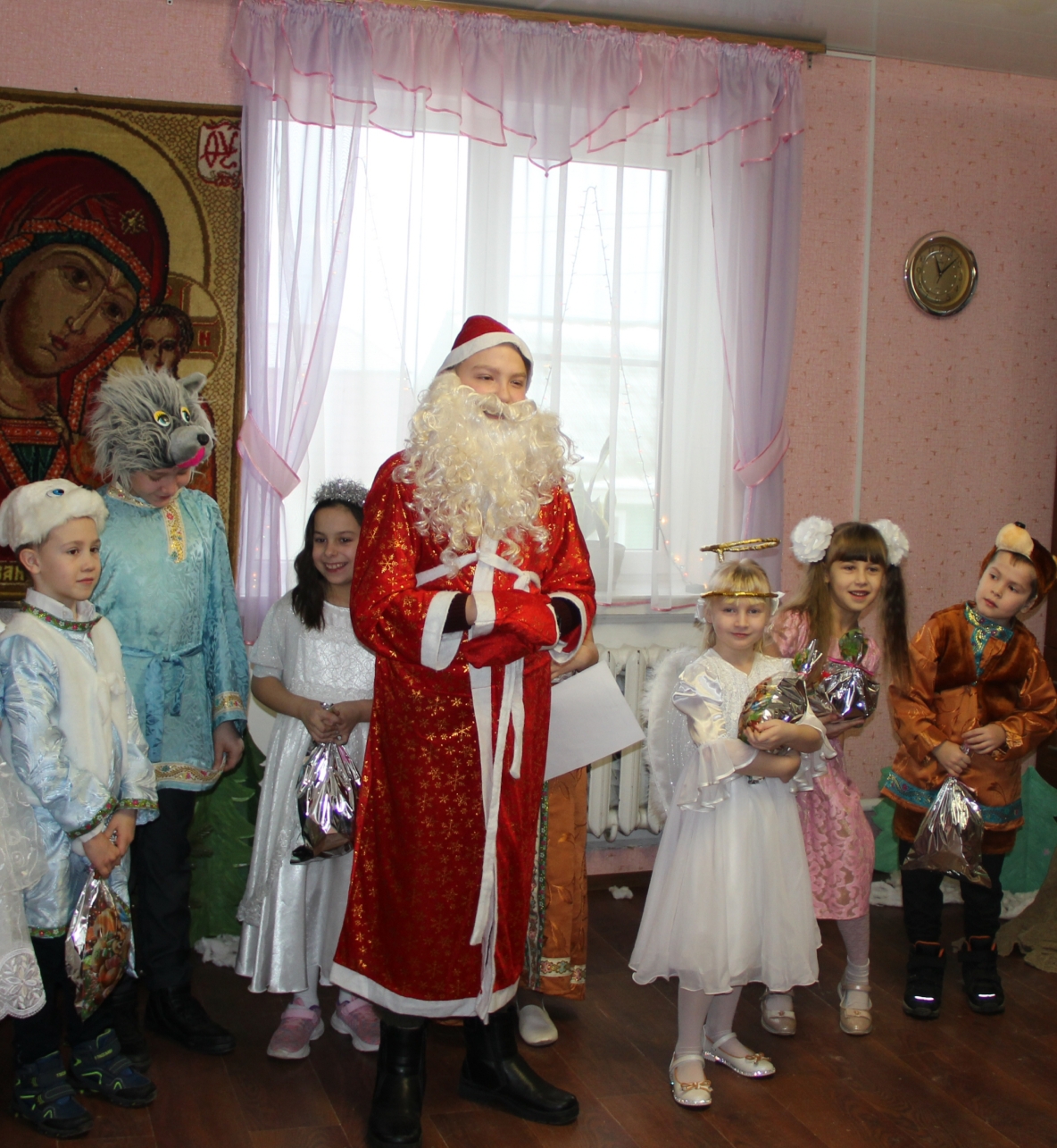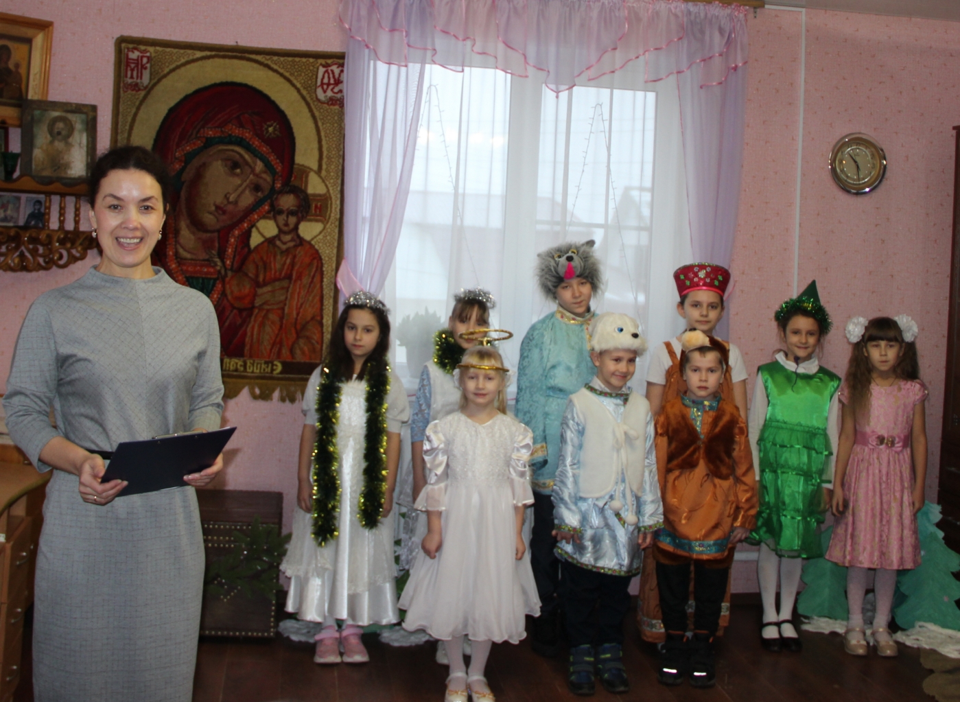 12 января рождественский утренник прошел в средней группе Воскресной школы. Преподаватель школы Казакова М.В. поздравила гостей с праздником Рождества Христова. Затем ребята представили рождественский спектакль «Три колоска». Под руководством преподавателя музыки Некрасовой Л.Е. были исполнены праздничные песнопения и колядки. По окончании утренника дети получили сладкие подарки. Праздничными колядками дети поздравили и настоятеля храма.