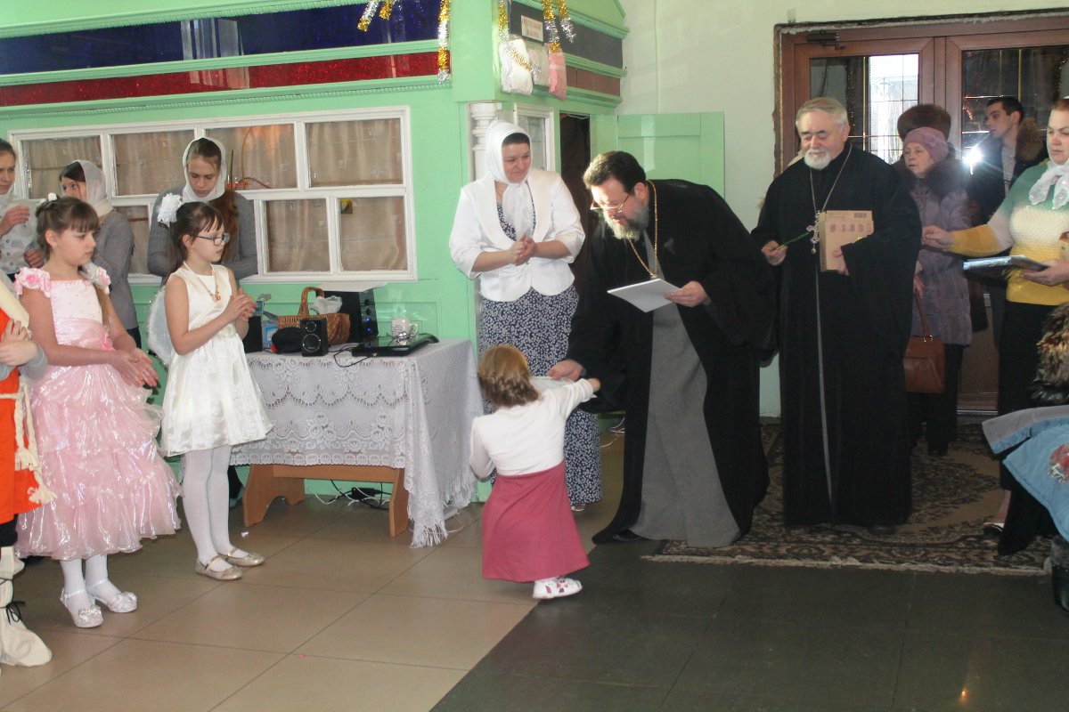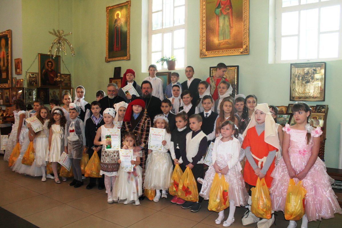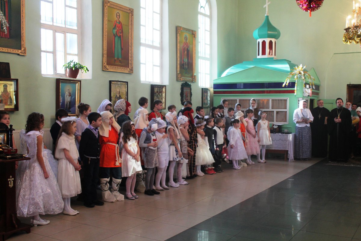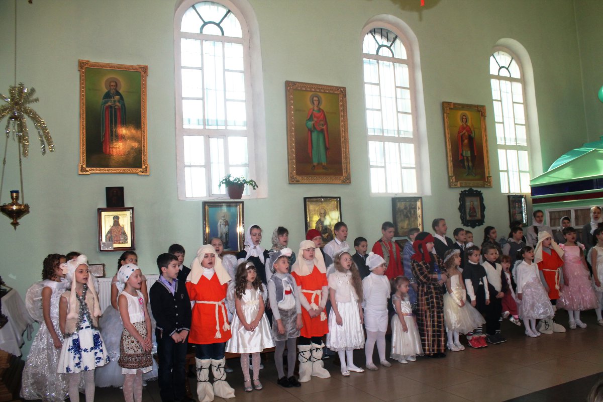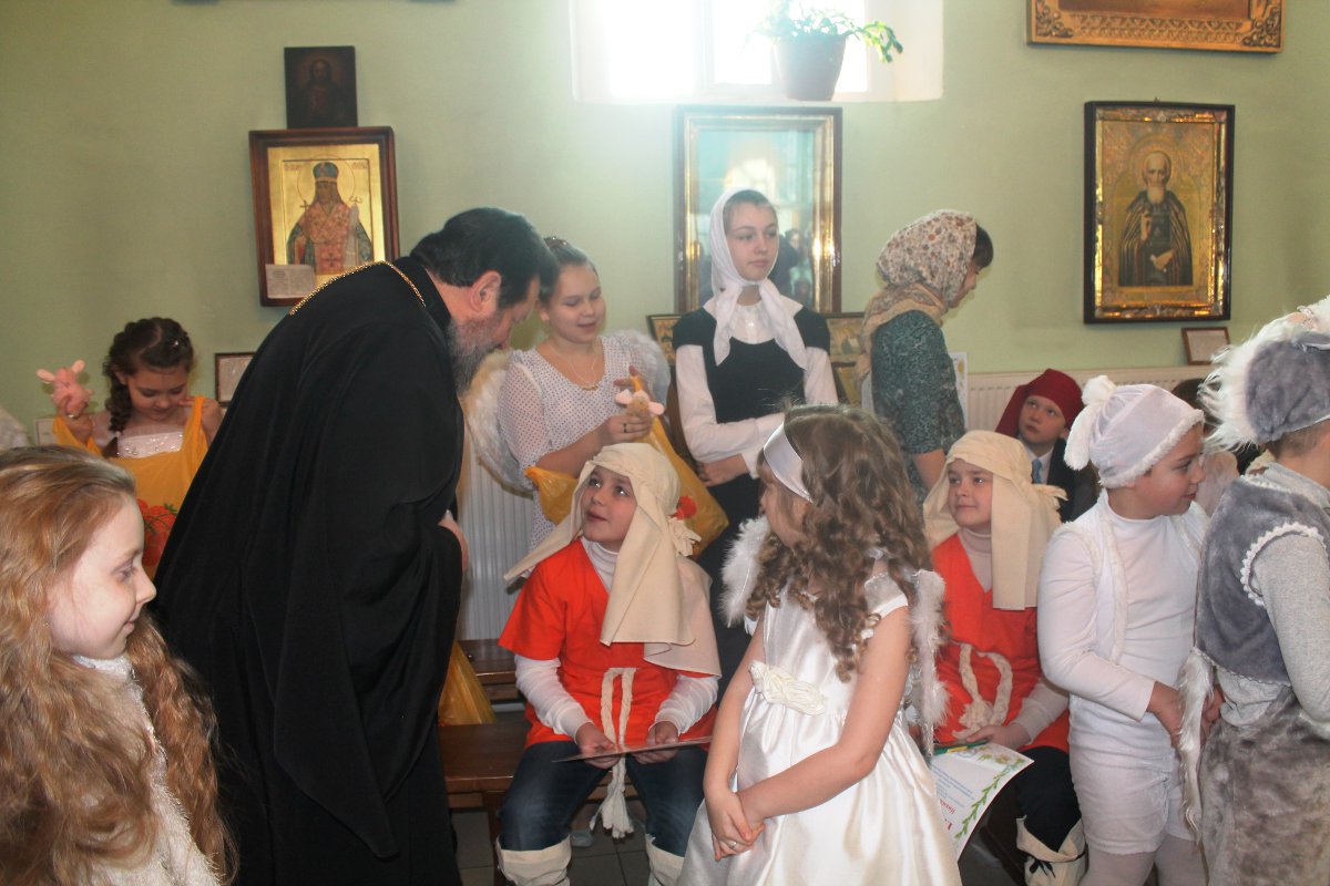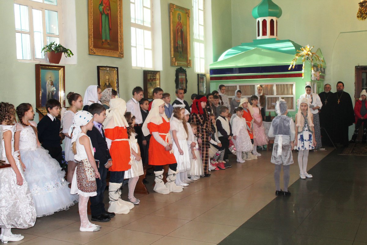 В исполнении учащихся школы, звучали церковные песнопения и песни, посвященные Рождеству Христову. После представления со словами поздравления к детям, родителям и ко всем присутствующим обратился настоятель храма протоиерей Василий Биляк. Батюшка вручил детям грамоты от имени епископа Никиты, за участие в I епархиальной выставке, так же о.Василий вручил благодарственное письмо руководителю воскресной школы Клячиной Т.И.  На празднике так же присутствовали дети и воспитатели из ДРЦ «Чайка», прихожане храма, а так же жители города с детьми.