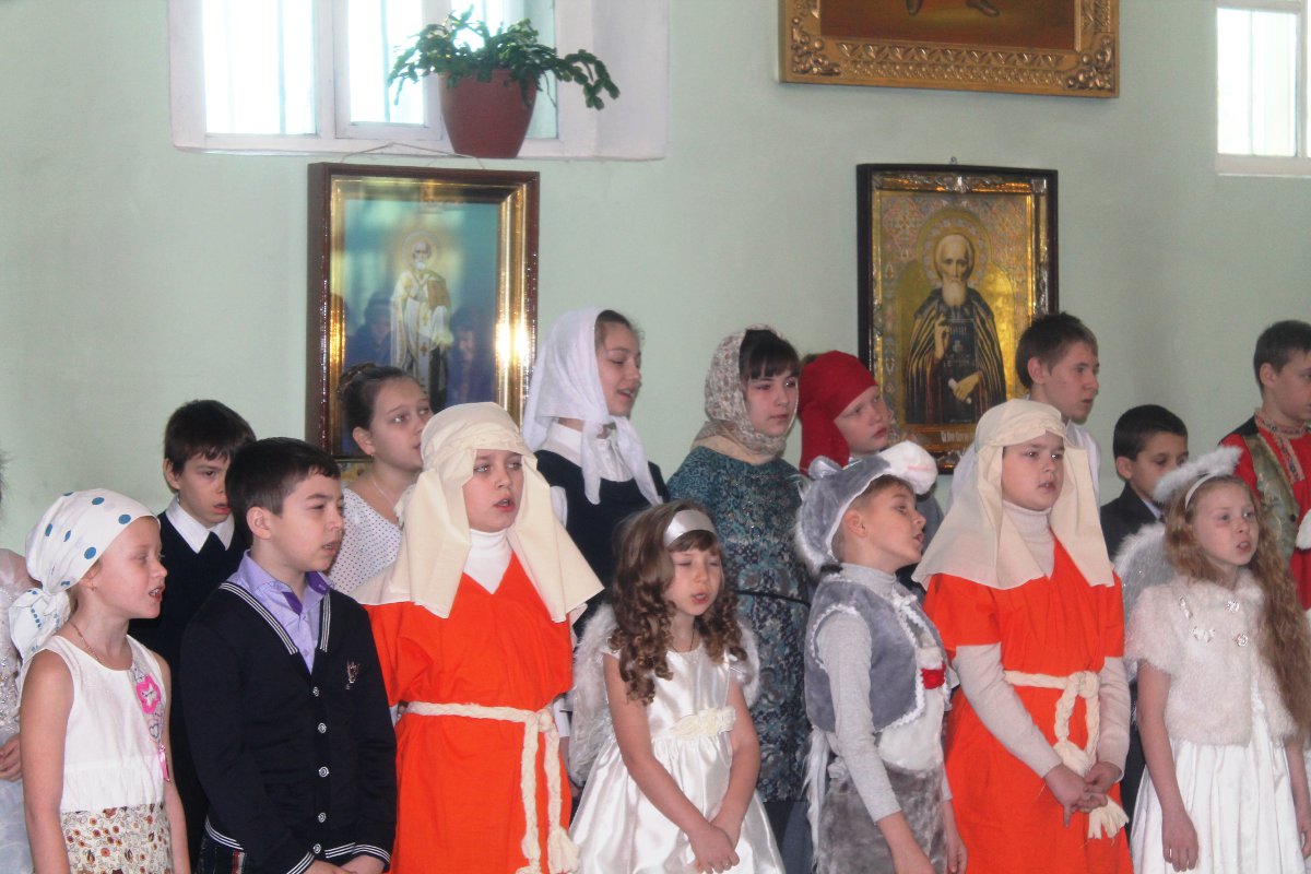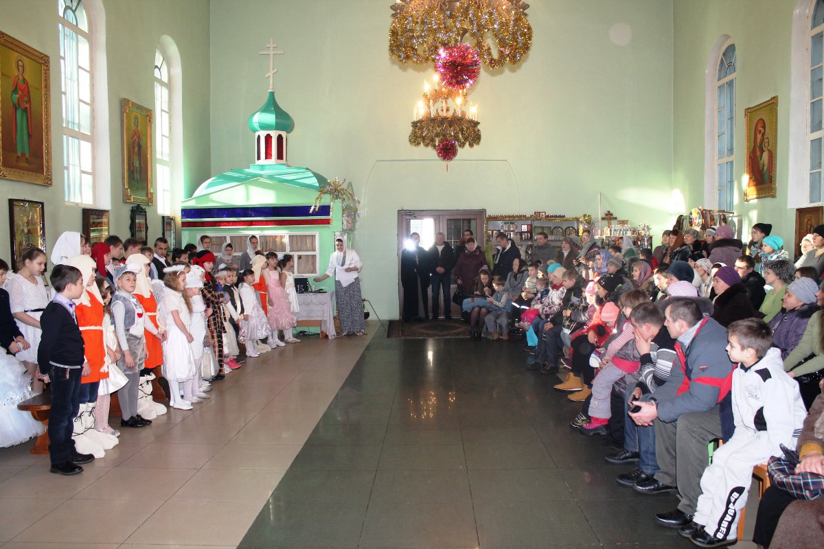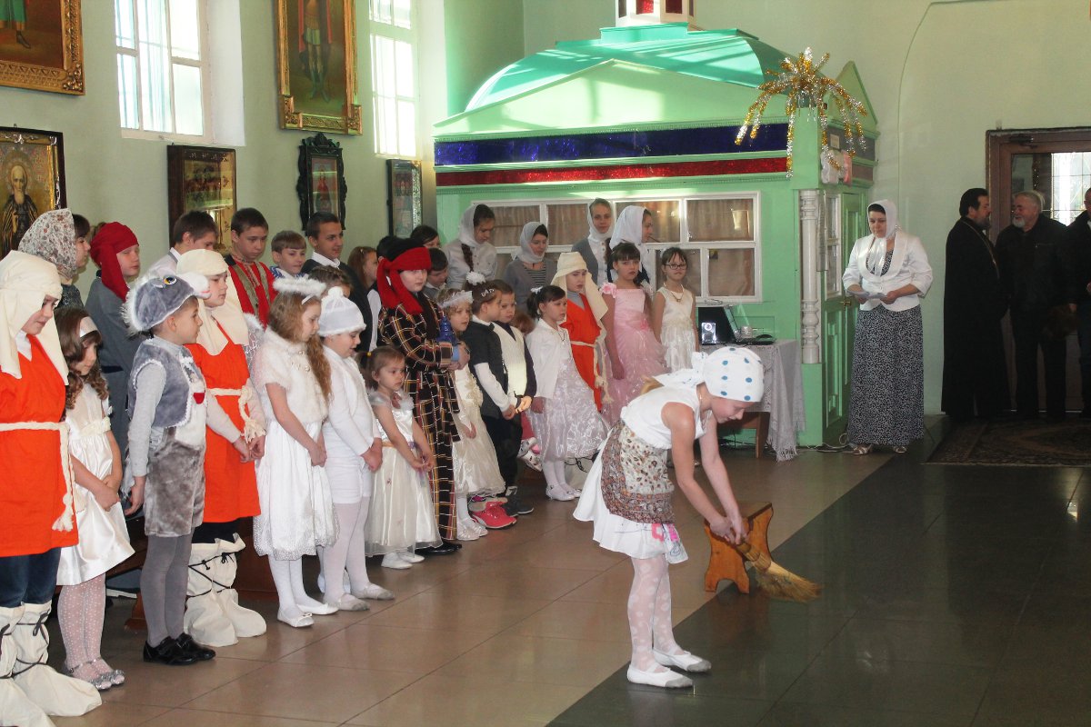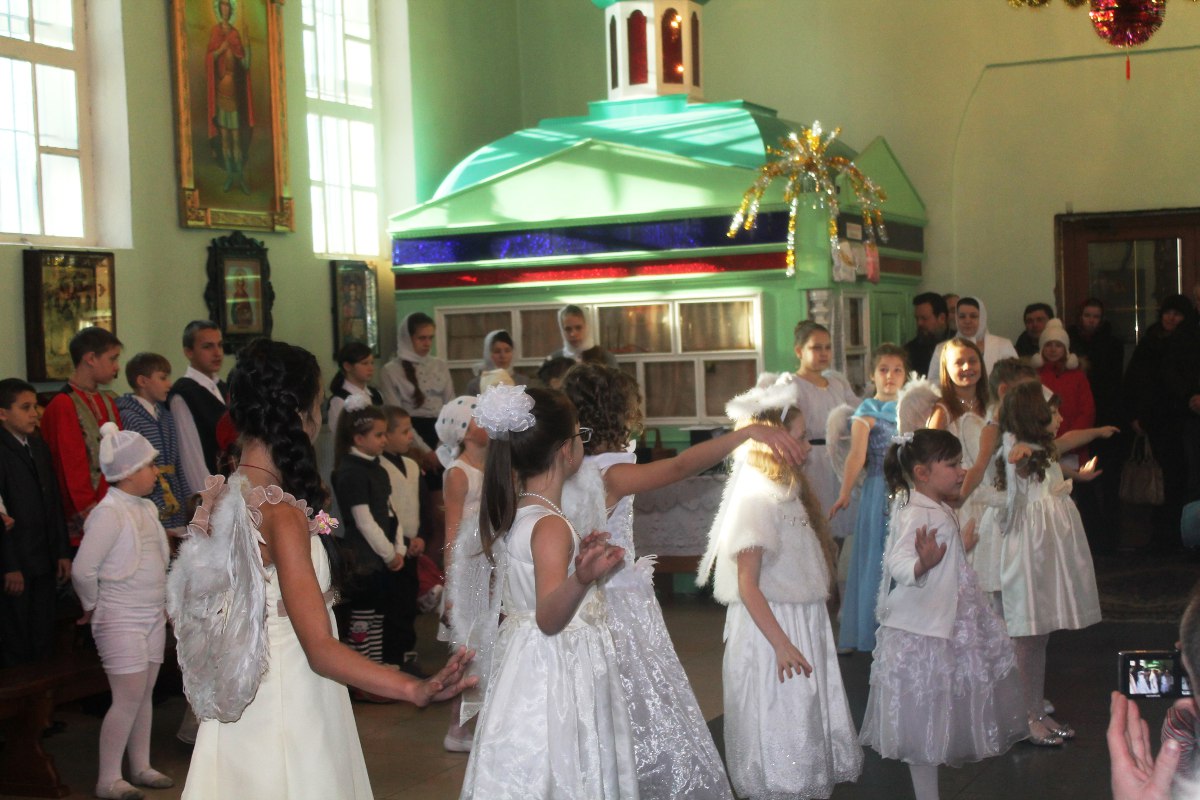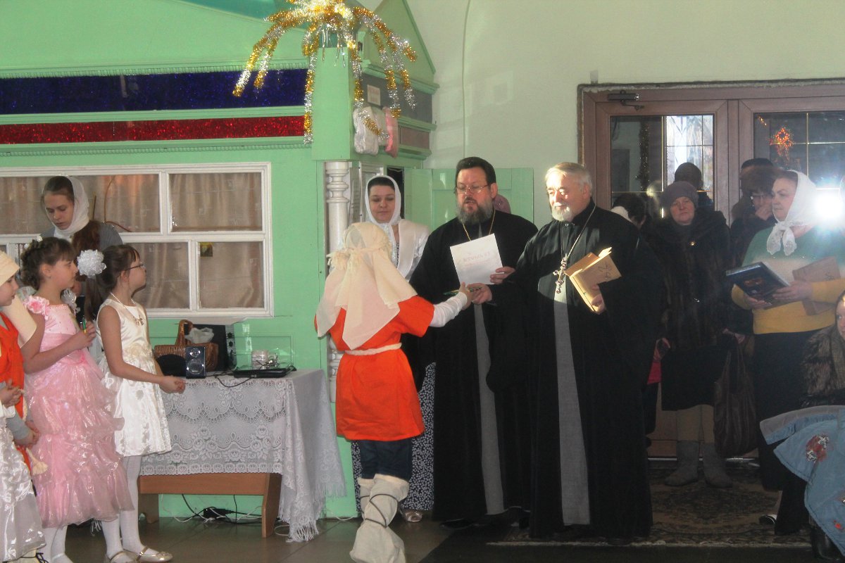 В исполнении учащихся школы, звучали церковные песнопения и песни, посвященные Рождеству Христову. После представления со словами поздравления к детям, родителям и ко всем присутствующим обратился настоятель храма протоиерей Василий Биляк. Батюшка вручил детям грамоты от имени епископа Никиты, за участие в I епархиальной выставке, так же о.Василий вручил благодарственное письмо руководителю воскресной школы Клячиной Т.И.  На празднике так же присутствовали дети и воспитатели из ДРЦ «Чайка», прихожане храма, а так же жители города с детьми.