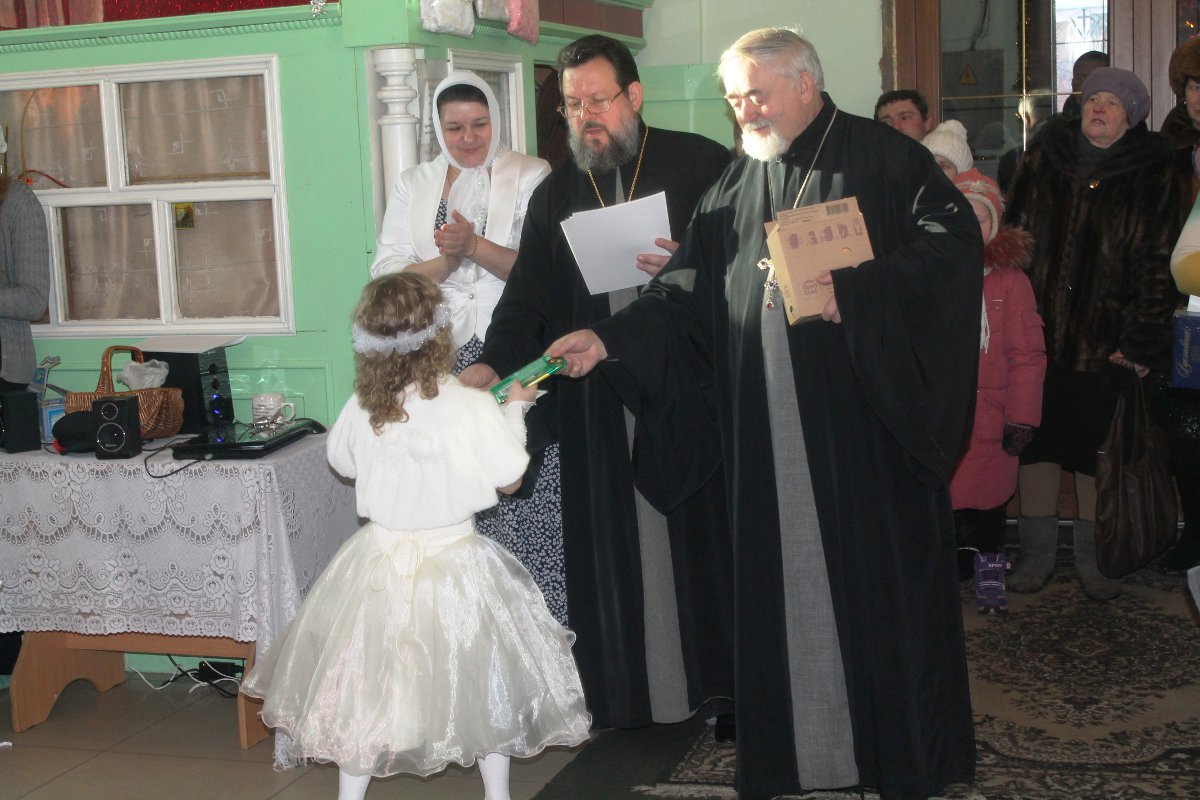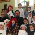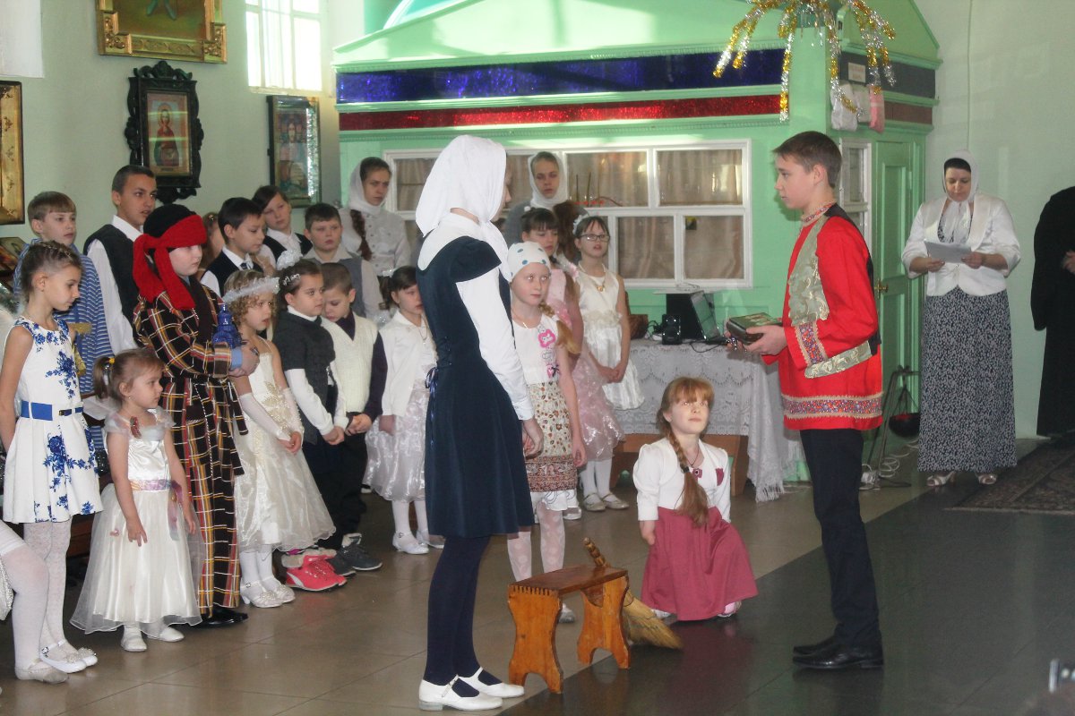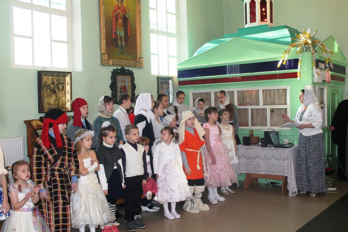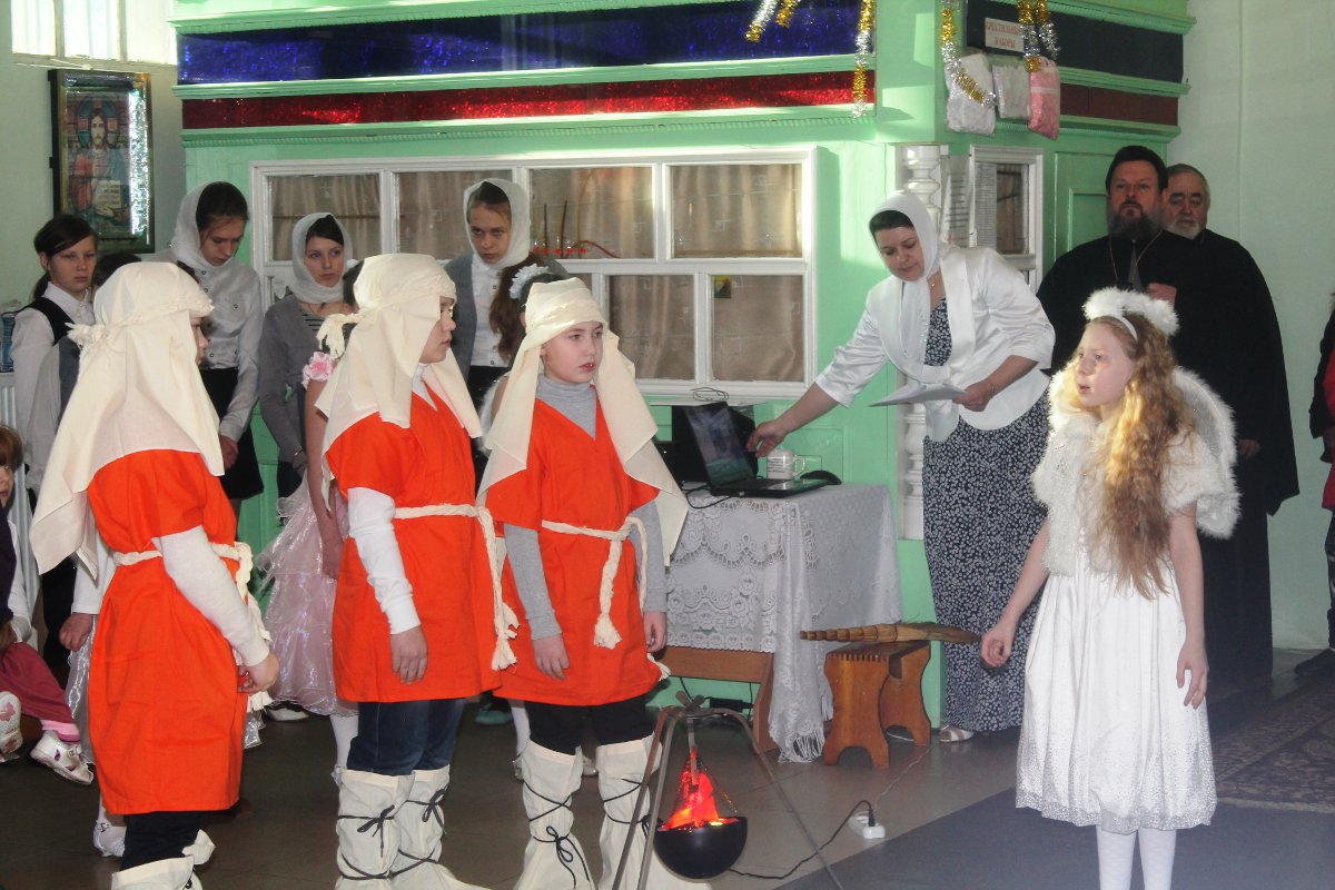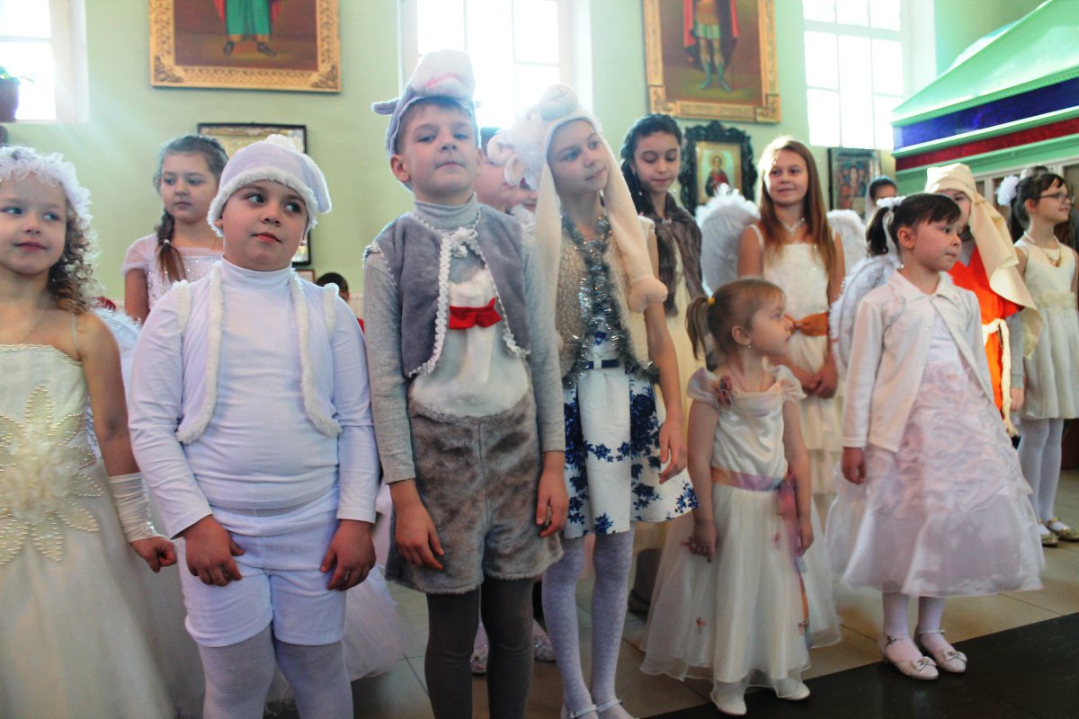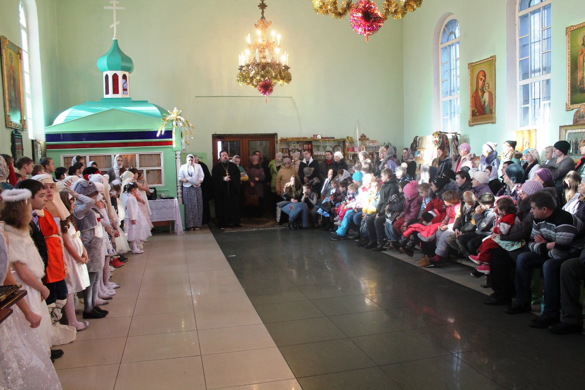В исполнении учащихся школы, звучали церковные песнопения и песни, посвященные Рождеству Христову. После представления со словами поздравления к детям, родителям и ко всем присутствующим обратился настоятель храма протоиерей Василий Биляк. Батюшка вручил детям грамоты от имени епископа Никиты, за участие в I епархиальной выставке, так же о.Василий вручил благодарственное письмо руководителю воскресной школы Клячиной Т.И.  На празднике так же присутствовали дети и воспитатели из ДРЦ «Чайка», прихожане храма, а так же жители города с детьми.