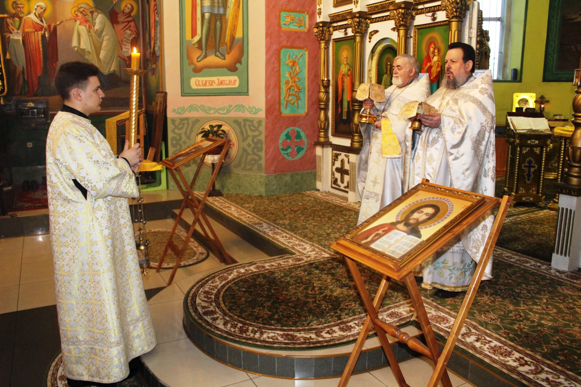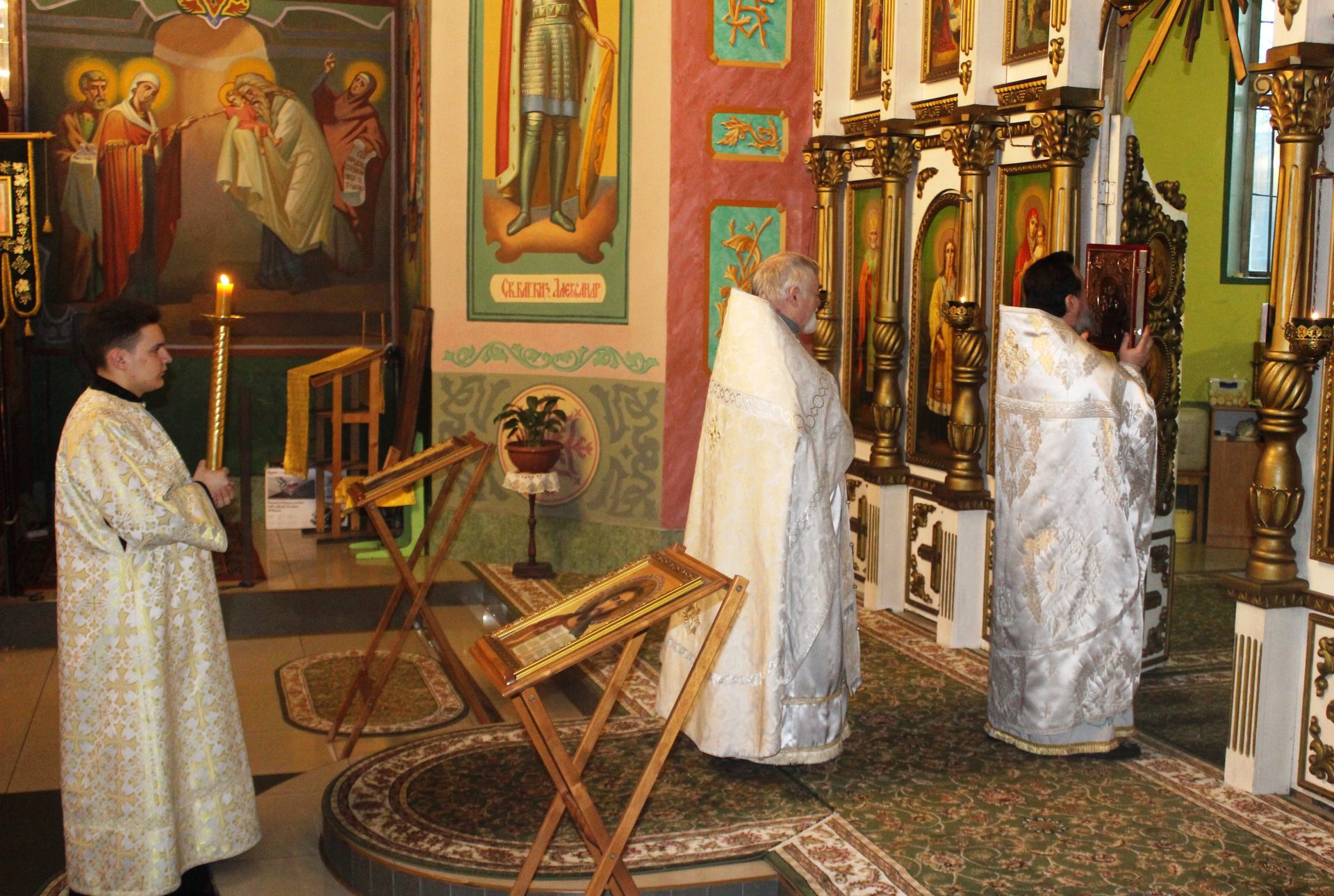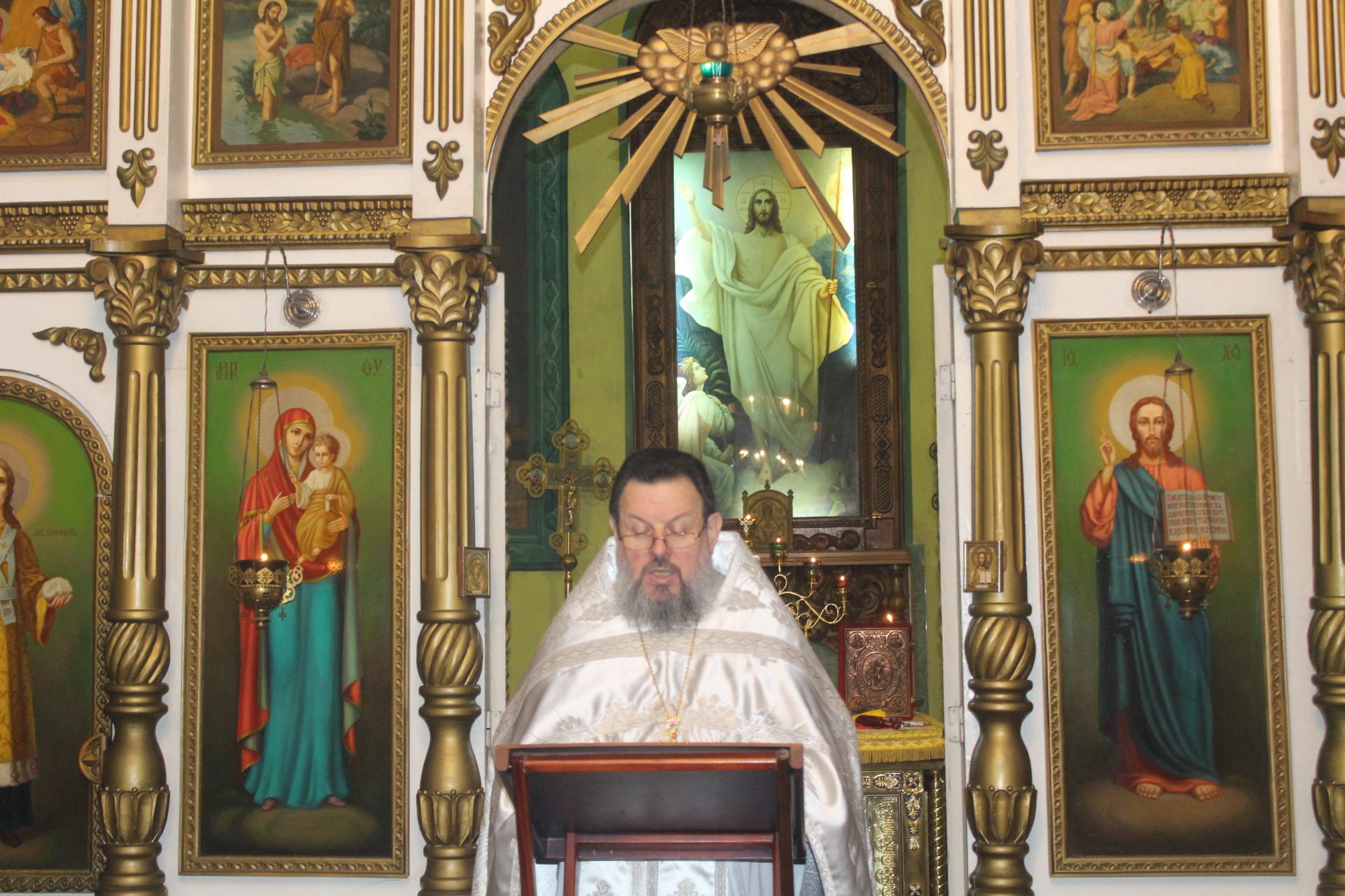 В завершении богослужения, протоиерей Василий обратился к молящимся с проповедью. «В этот день состоялась встреча Младенца Христа с праведным старцем Симеоном, который, водимый Святым Духом, пришел в Церковь, когда туда был принесен Спаситель. И вот этот радостный день настал, праведный Симеон лицом к лицу встретил Бога в образе Младенца Христа. Он трепетно принял на свои старческие руки сего небесного и, вместе с тем, земного Младенца, это сорокадневное крохотное Создание, к Которому он обратил свое моление: Ныне отпущаеши раба Твоего, Владыко, по глаголу Твоему с миром, ибо увидели очи мои Спасение Твое…Теперь Симеон мог с миром отойти в вечность, в область усопших, и принести туда радостную весть, что узрел на земле Бога, пришедшего плотию, узрел спасительный Свет, который будет на падение для неверующих и на восстание верующих в Него.Первая встреча для нас происходит во Святом Крещении, когда мы принесены в храм, любовью ближних отданы Богу.  Своими родителями мы были поставлены перед Господом и посвящены Ему на служение. Встречей с Господом в нашей жизни является каждое Причащение Его Божественной Плоти и Крови, поскольку в этом Таинстве мы соединяемся со Спасителем. Нам должно как можно чаще возобновлять в своей памяти то, что было обещано нами Господу во Святом Крещении, чтобы в нашей встрече с Господом по отшествии из мира сего не быть судимыми как напрасно принявшим благодать Святаго Духа.»