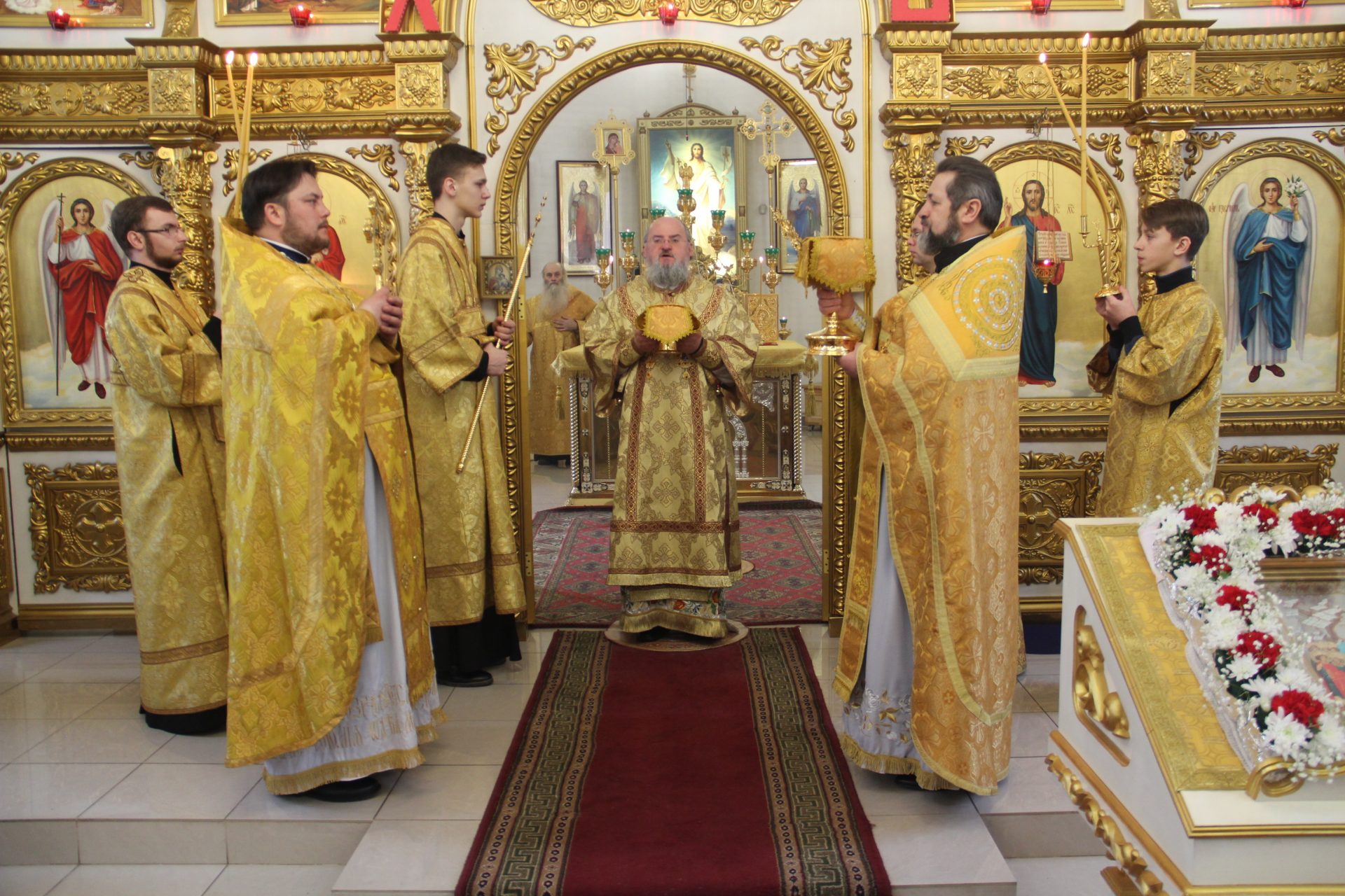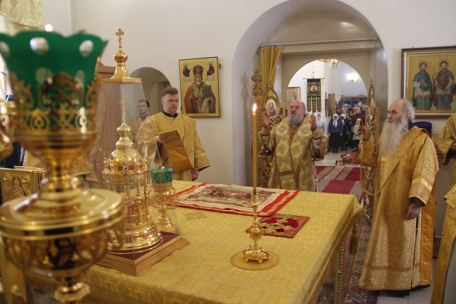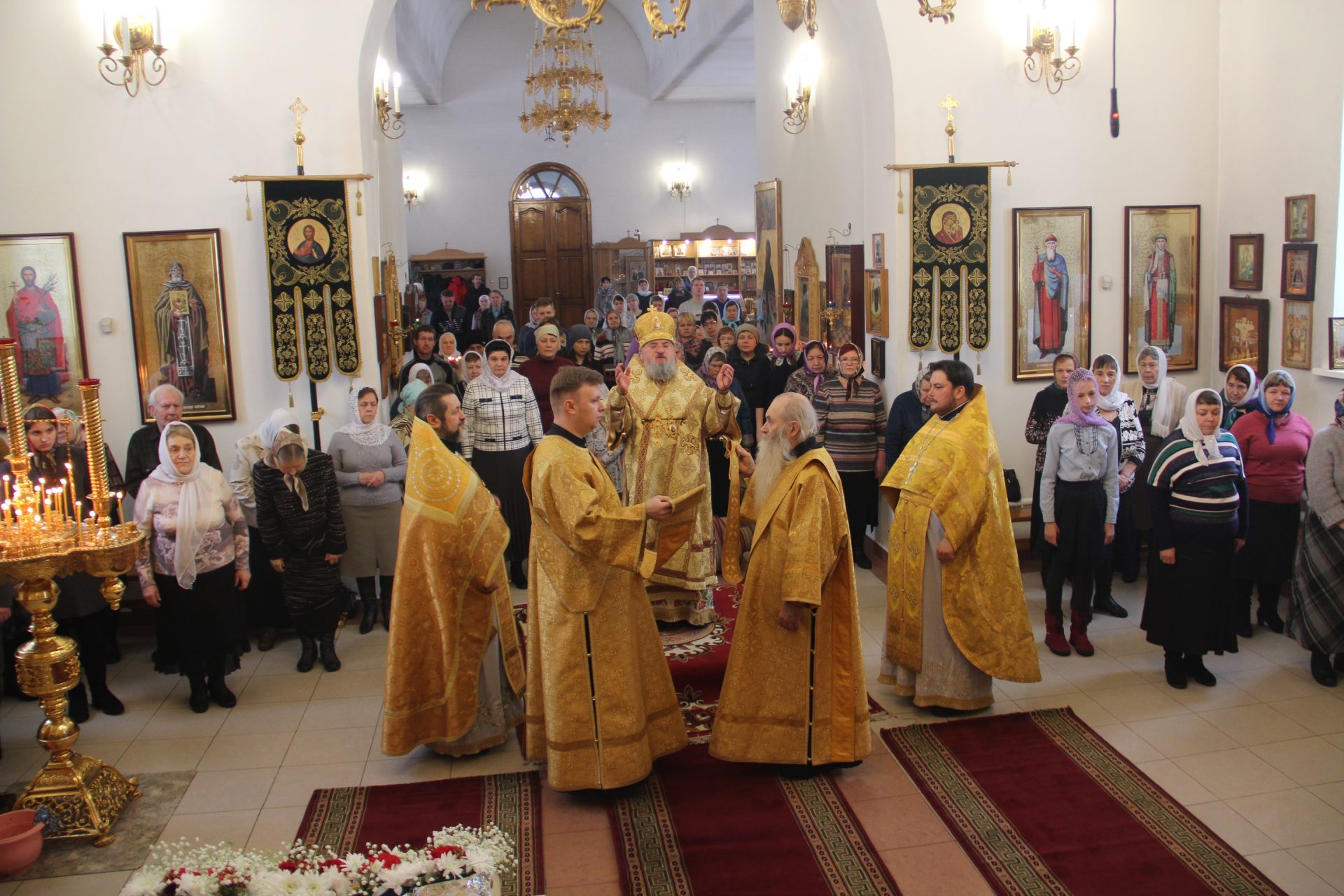 Архипастырю сослужили: благочинный округа, настоятель храма протоиерей Иоанн Староста, протоиерей Антоний Хатунцев, диакон Евгений Ковригин и иеродиакон Виталий (Павленко).