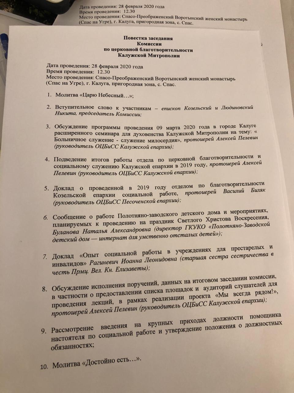 По итогам, было решено провести очередное заседание 30 апреля 2020 года в ГКУКО «Полотняно-Заводской детский дом — интернат для умственно отсталых детей», совершив в этот день Божественную Литургию в храме при интернате.