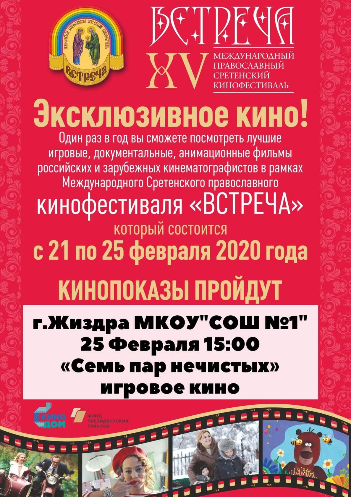 25 февраля в средней общеобразовательной школе № 1 города Жиздры в рамках XV Международного Сретенского православного кинофестиваля «ВСТРЕЧА» прошел кинопоказ фильма «Семь пар нечистых». На просмотр кинофильма были приглашены учащиеся 9 – 11 классов.  Кинофестиваль проводится во многих городах Калужской области и вызывает не поддельный интерес.