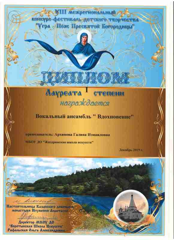 Наши юные музыканты уже не первый год участвуют в этом конкурсе, показывая достойные результаты. В этот раз лауреатом 1 степени с правом участия в гала-концерте стал вокальный ансамбль «Вдохновение» (Цыпляева Алина, Хохлов Денис, Елена, Николаев Николай, Аверкиева Надежда, Аверкиева Ирина, Черноярова Ирина) руководитель Г. И. Архипова. В исполнении ансамбля прозвучало церковное песнопение «Христос воскресе» на греческом, латинском и церковно-славянском.