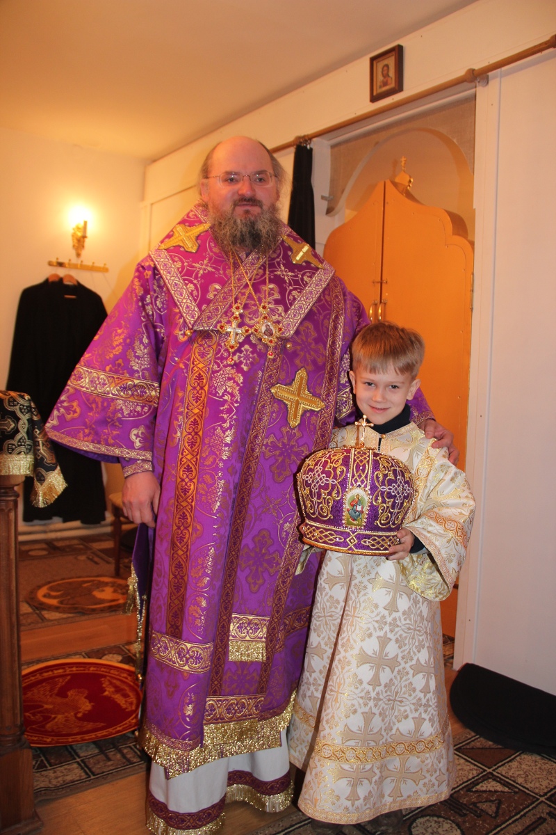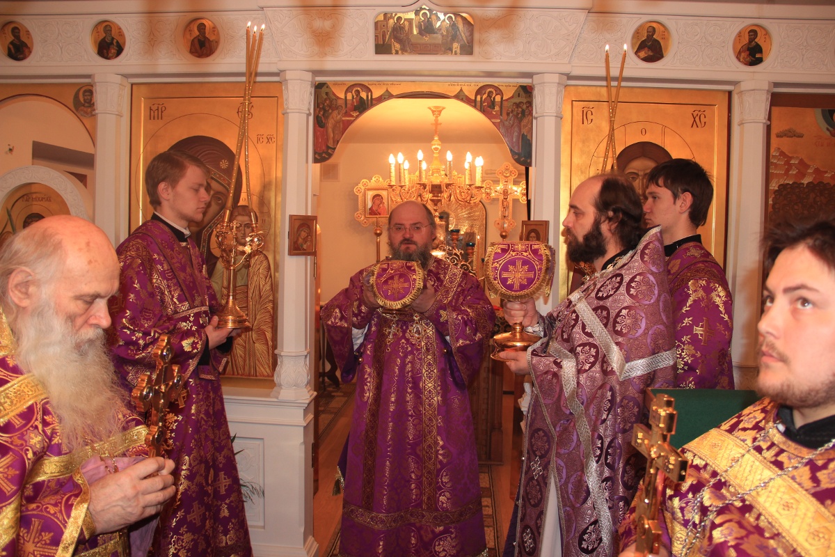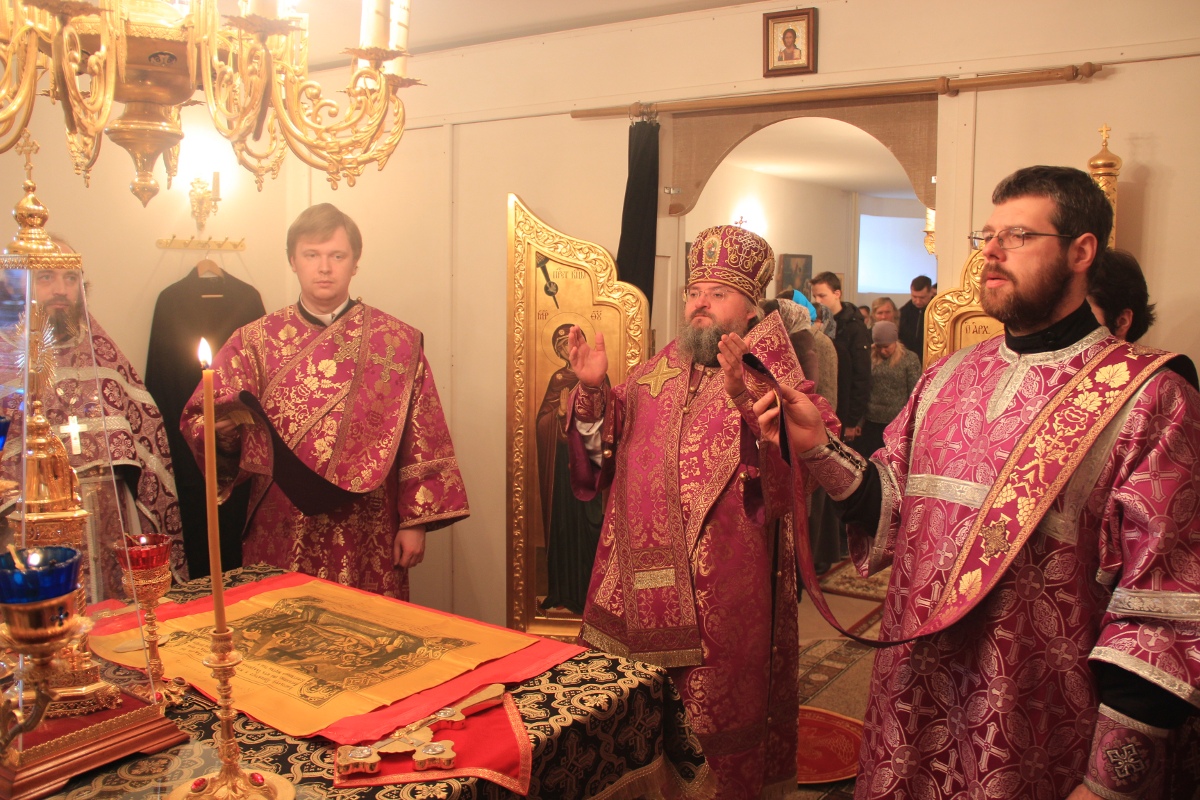 Его Преосвященству сослужили: протоиерей Дмитрий Сахаров, иерей Антоний Хатунцев, иерей Дионисий Куваев — настоятель храма, диакон Евгений Ковригин и диакон Алексий Боков. После отпуста литургии духовенство совершило славление праздника, а затем владыка обратился к молящимся с архипастырским словом.