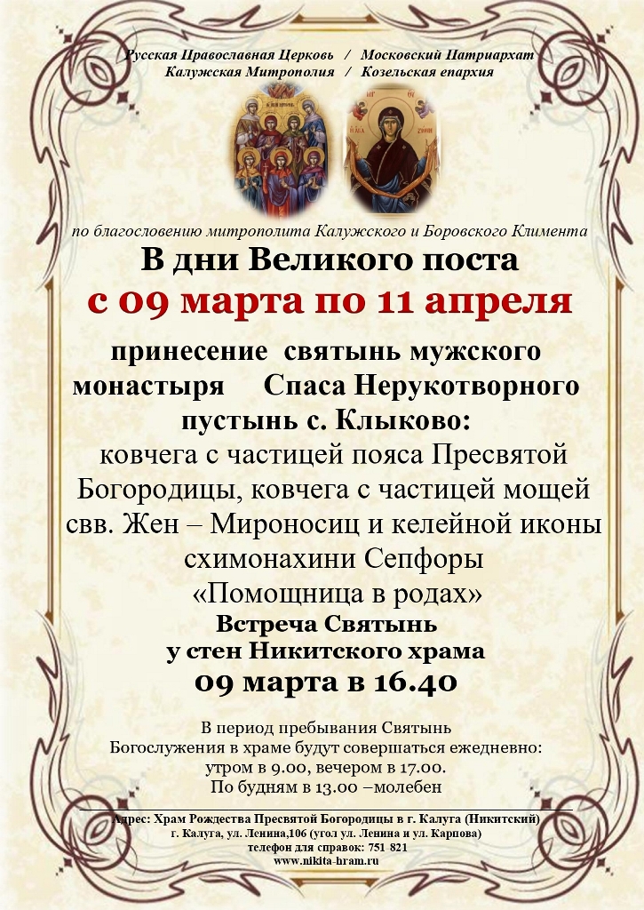 По благословению митрополита Калужского и Боровского Климента и епископа Козельского и Людиновского Никиты в дни Великого поста (с 9 марта по 11 апреля), в храм в честь Рождества Пресвятой Богородицы (Никитский) города Калуги будут принесены святыни мужского монастыря Спаса Нерукотворного пустынь села Клыково Козельской епархии: