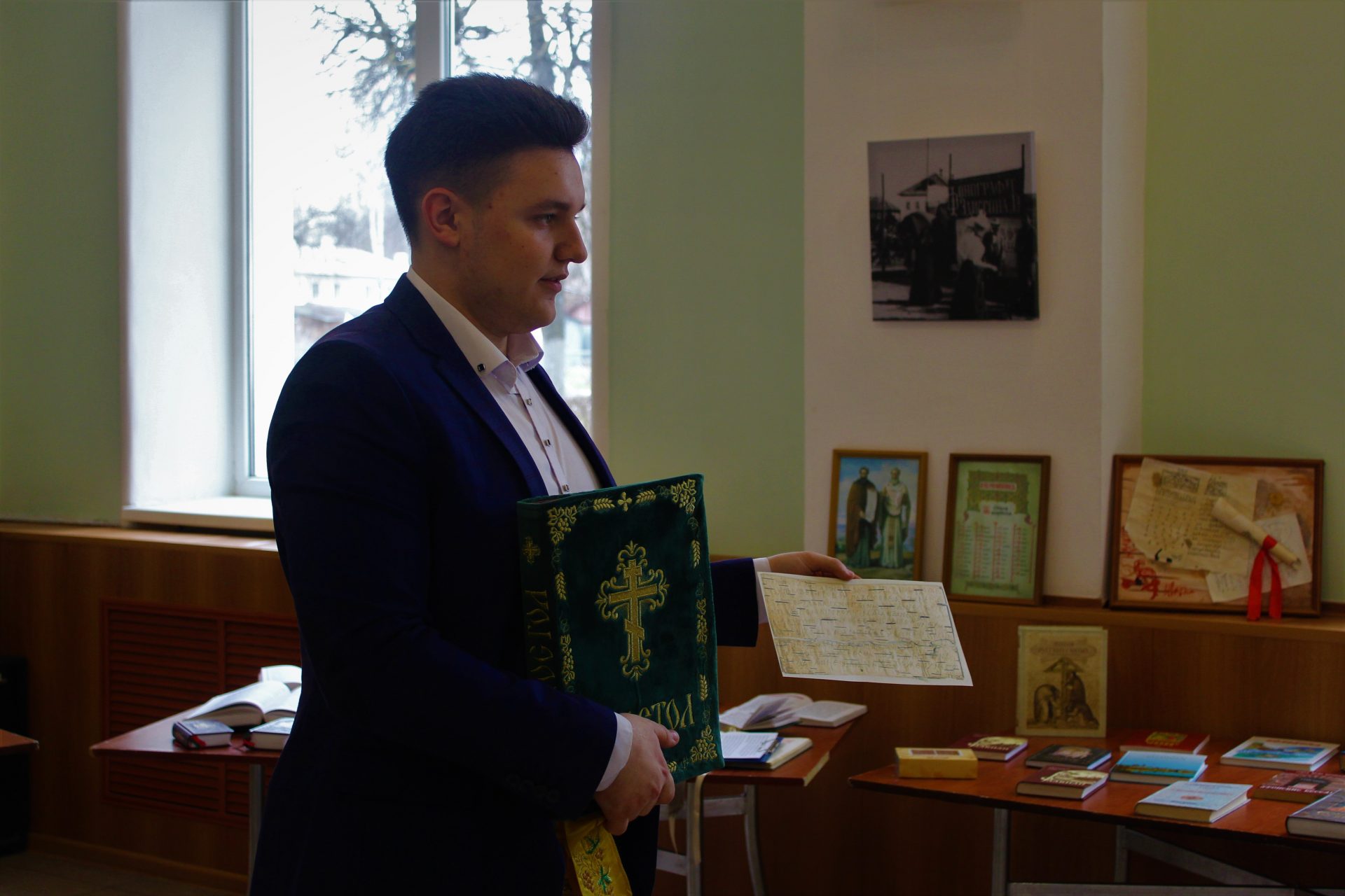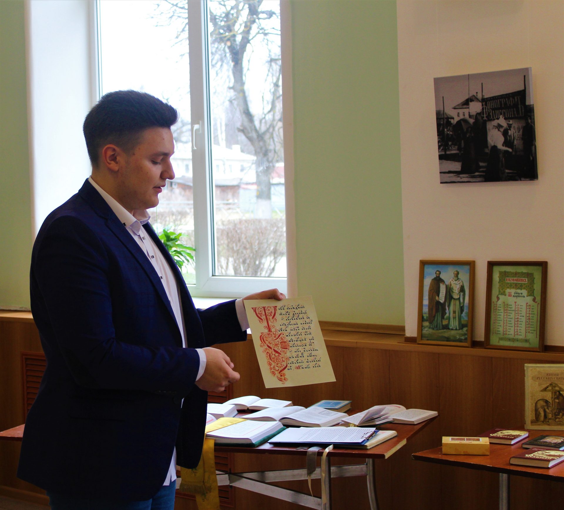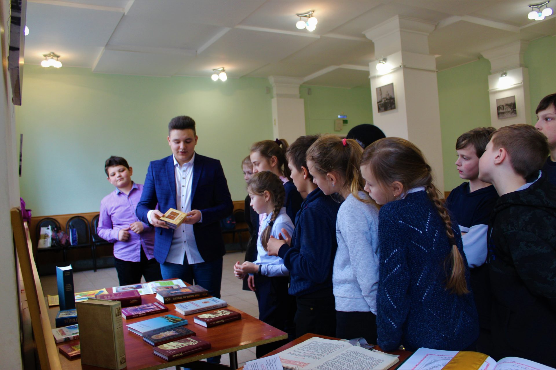 Методист по работе с молодежью Даниил Денисов рассказал об истории книги, о первых книгопечатниках. Первые книги были рукописными, богато украшенными и очень дорогими. Так же он рассказал о роли православной книги, о том, как нужно обращаться с книгой, особенно с православной, о значении духовной литературы в жизни православного человека и его духовном возрастании.