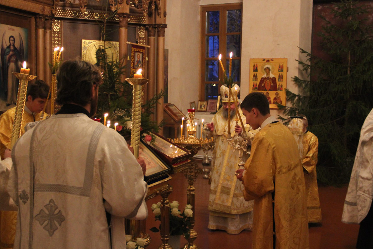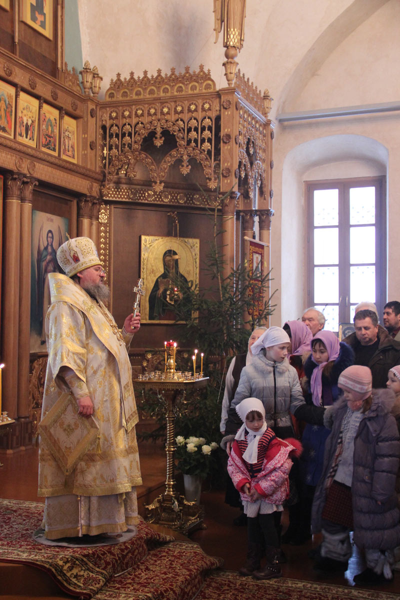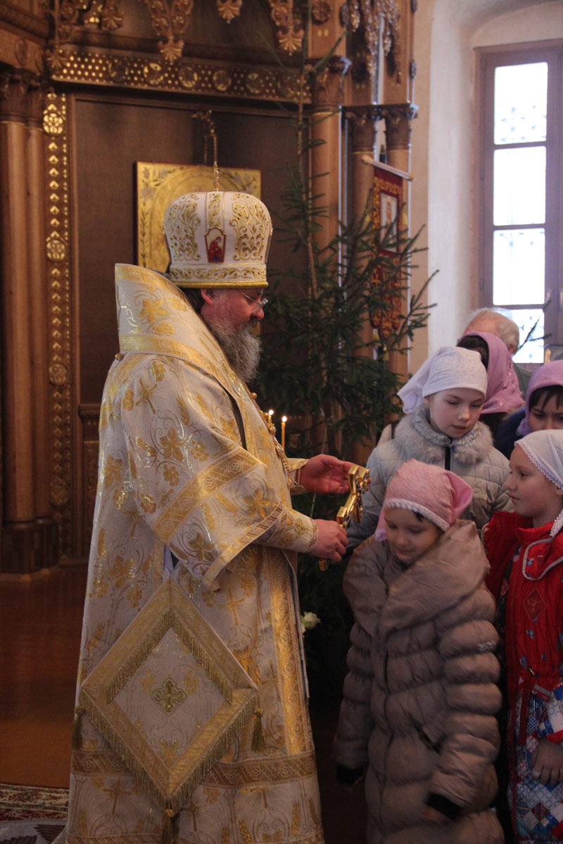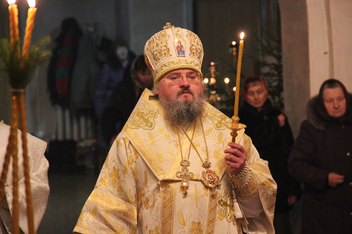 После отпуста литургии в центре храма пред праздничной иконой священнослужители совершили славление Рождества Христова, а затем владыка обратился к молящимся с проповедью.