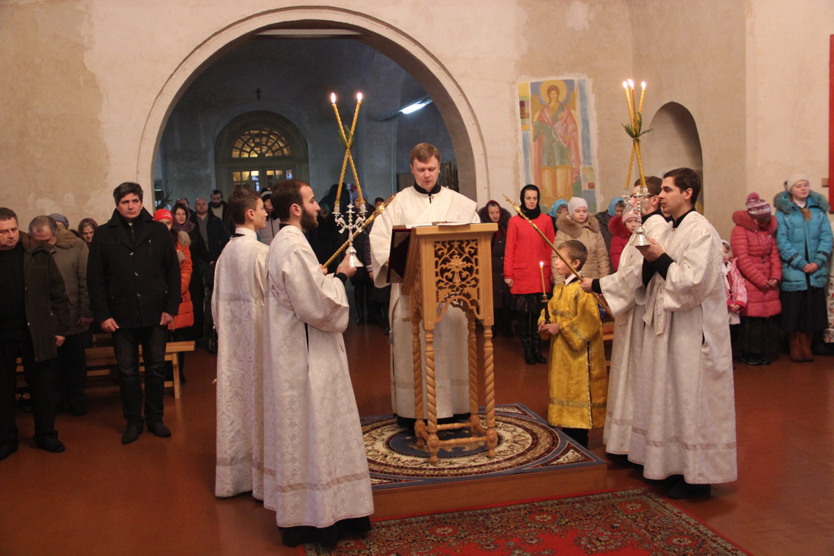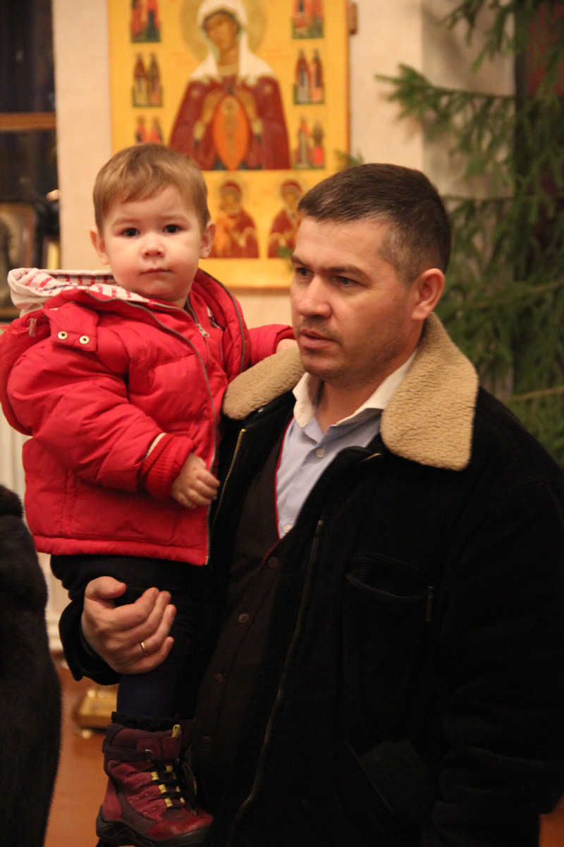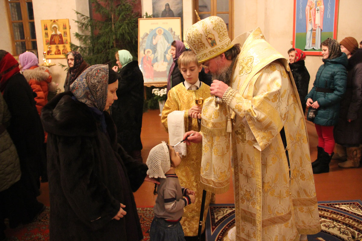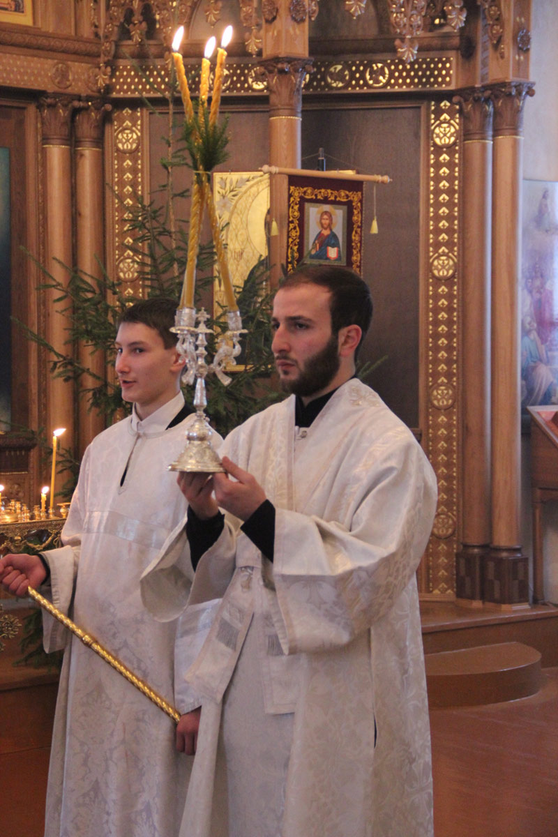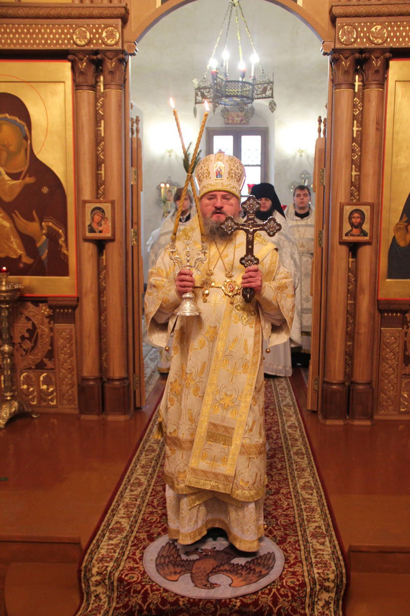 После отпуста литургии в центре храма пред праздничной иконой священнослужители совершили славление Рождества Христова, а затем владыка обратился к молящимся с проповедью.