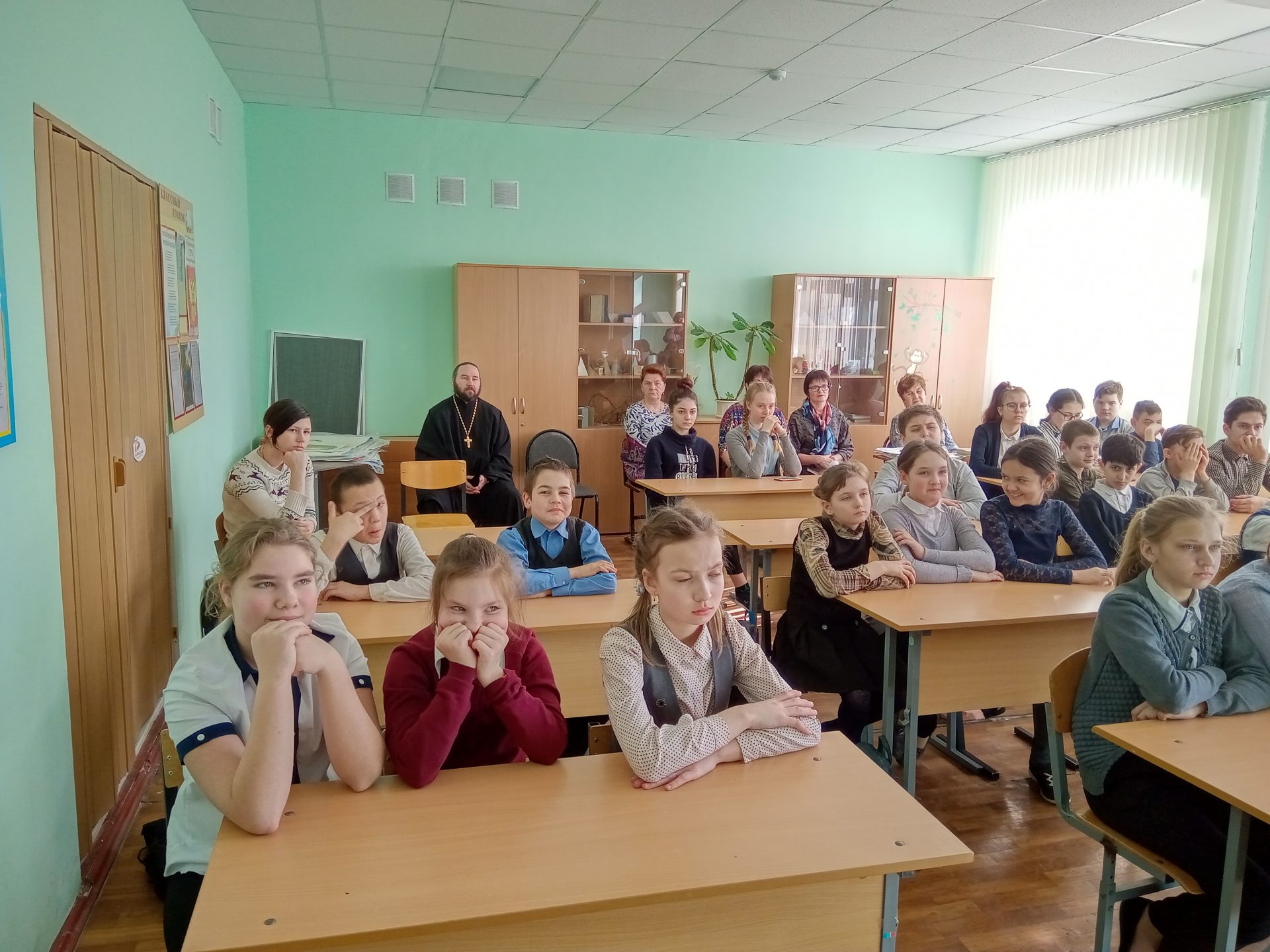Следом, уже в зареченской школе учениками 4-го и 5-го классов был дан открытый урок, посвящённый прославленным Церковью святым защитникам Отечества. Вспоминали Александра Невского, Феодора Ушакова, Илию Муромца и знакомились с их подвигами.