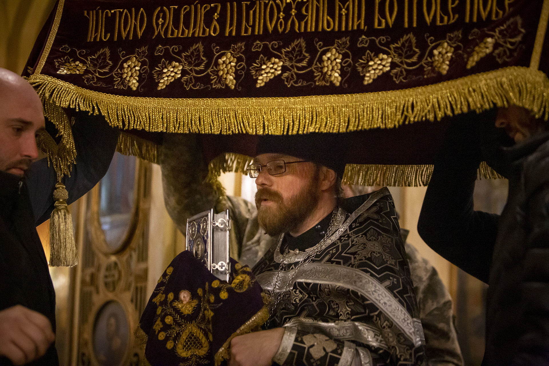 Да молчи́т вся́кая плоть челове́ча, и да стои́т со стра́хом и тре́петом, и ничто́же земно́е в себе́ да помышля́ет: Царь бо Ца́рствующих и Госпо́дь госпо́дствующих прихо́дит закла́тися и да́тися в снедь ве́рным. Предхо́дят же сему ли́цы А́нгельстии со вся́ким Нача́лом и Вла́стию, многоочи́тии Херуви́ми и шестокрила́тии Серафи́ми, ли́ца закрыва́юще и вопию́ще песнь: Аллилу́иа, Аллилу́иа, Аллилу́иа.