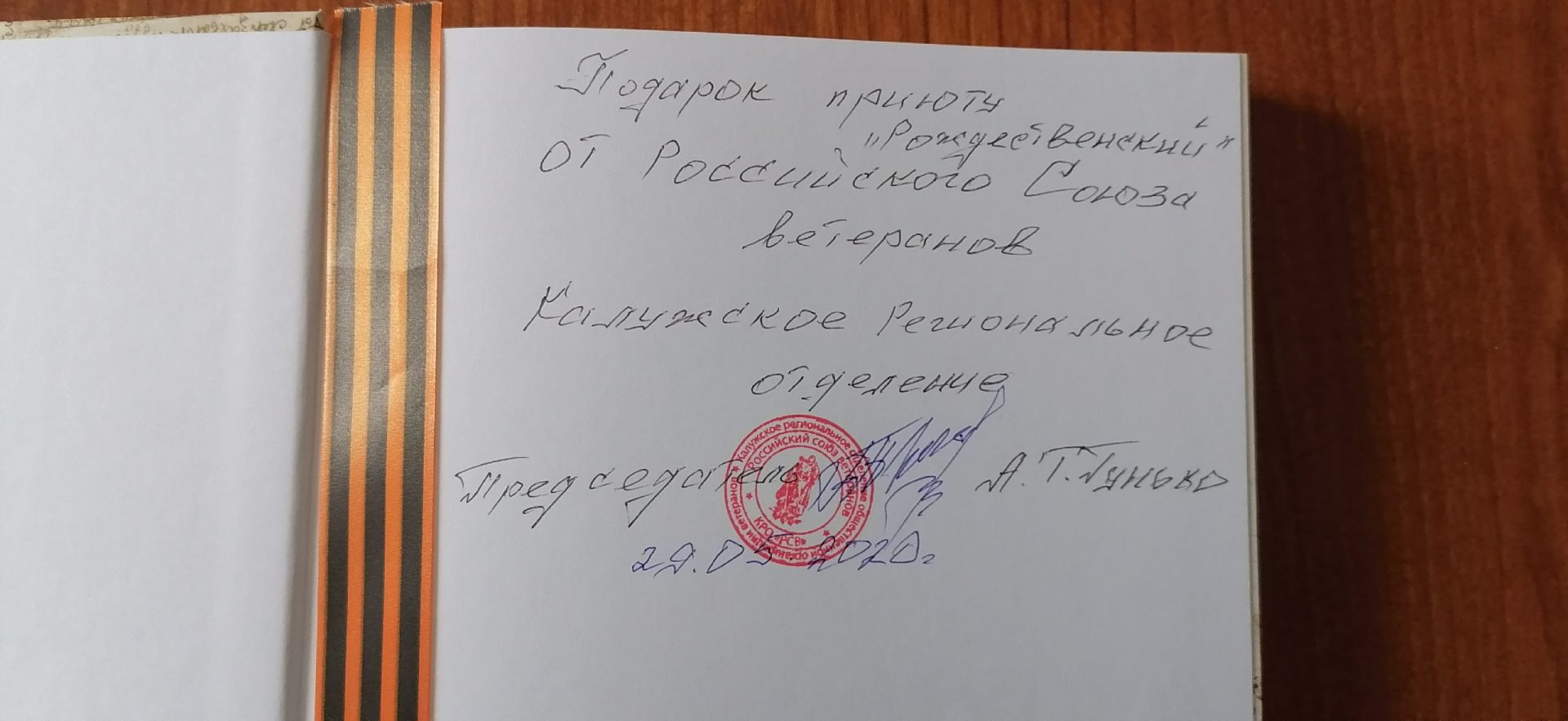 Также, председатель Калужского регионального отделения Российского Союза ветеранов, Алексей Гунько, вручил памятный знак «75 лет Победы» Куклиной Марине Владимировне и передал ей книгу «Письма с фронта».