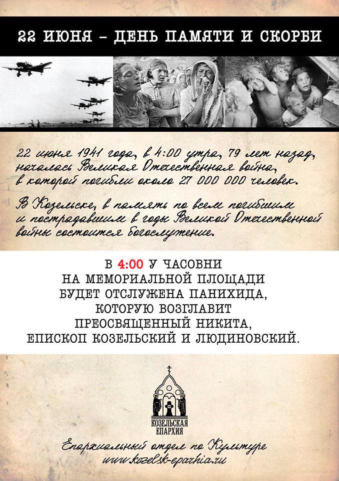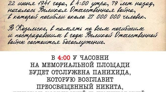 22 июня в 4 часа утра состоится панихида на Мемориальной площади Козельска