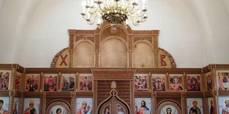 Иконостас имеет три яруса: местный ряд, праздничный и деисусный. Основной существенной его чертой является его пропорциональная схема, которая включает в себя множество цветных вырезных вставок.