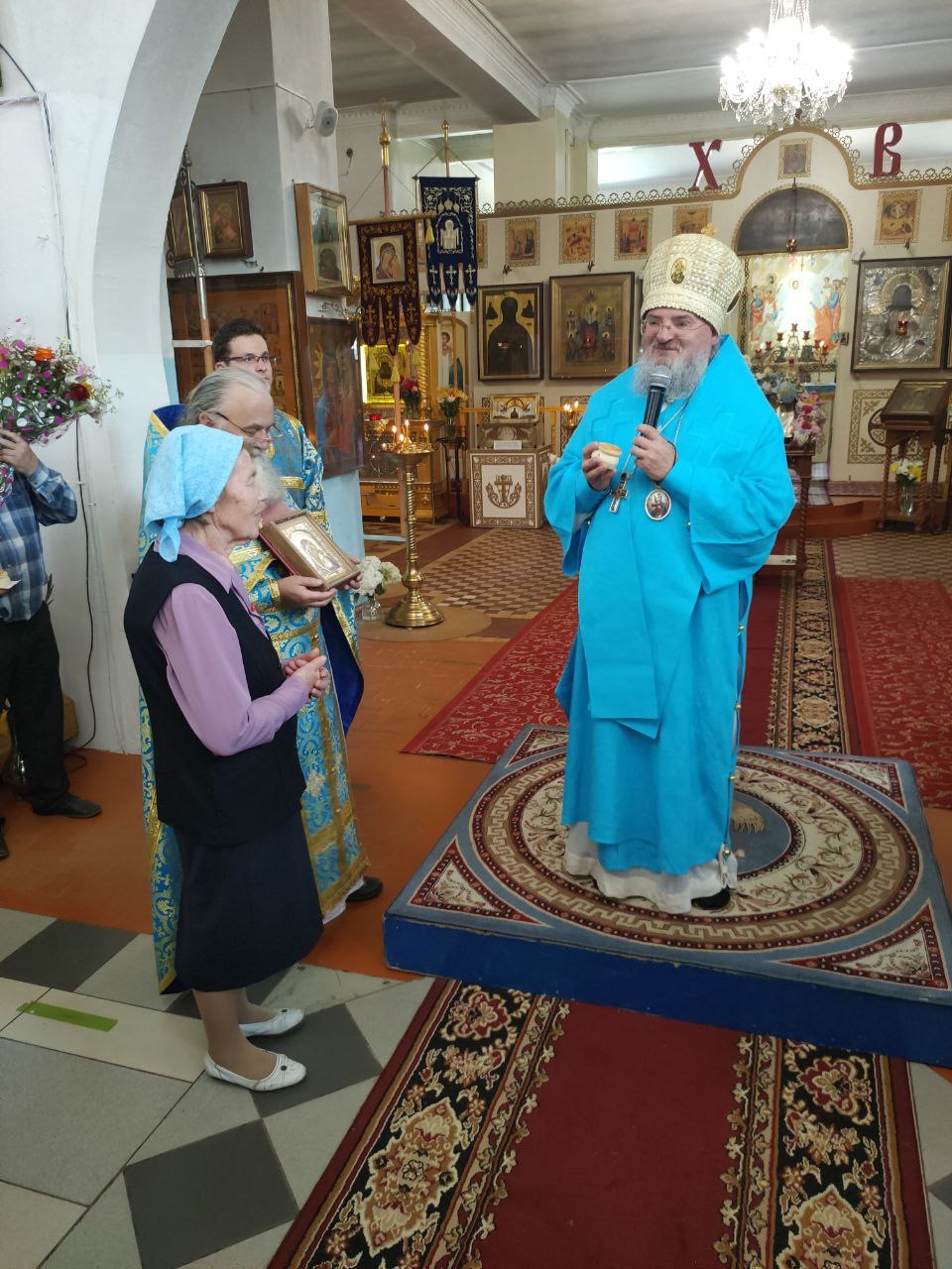 Архипастырь поздравил одну из старейших прихожанок собора  Соцкую Галину Васильевну с 80-летием и вручил ей святую просфору, икону Божией Матери и букет цветов.