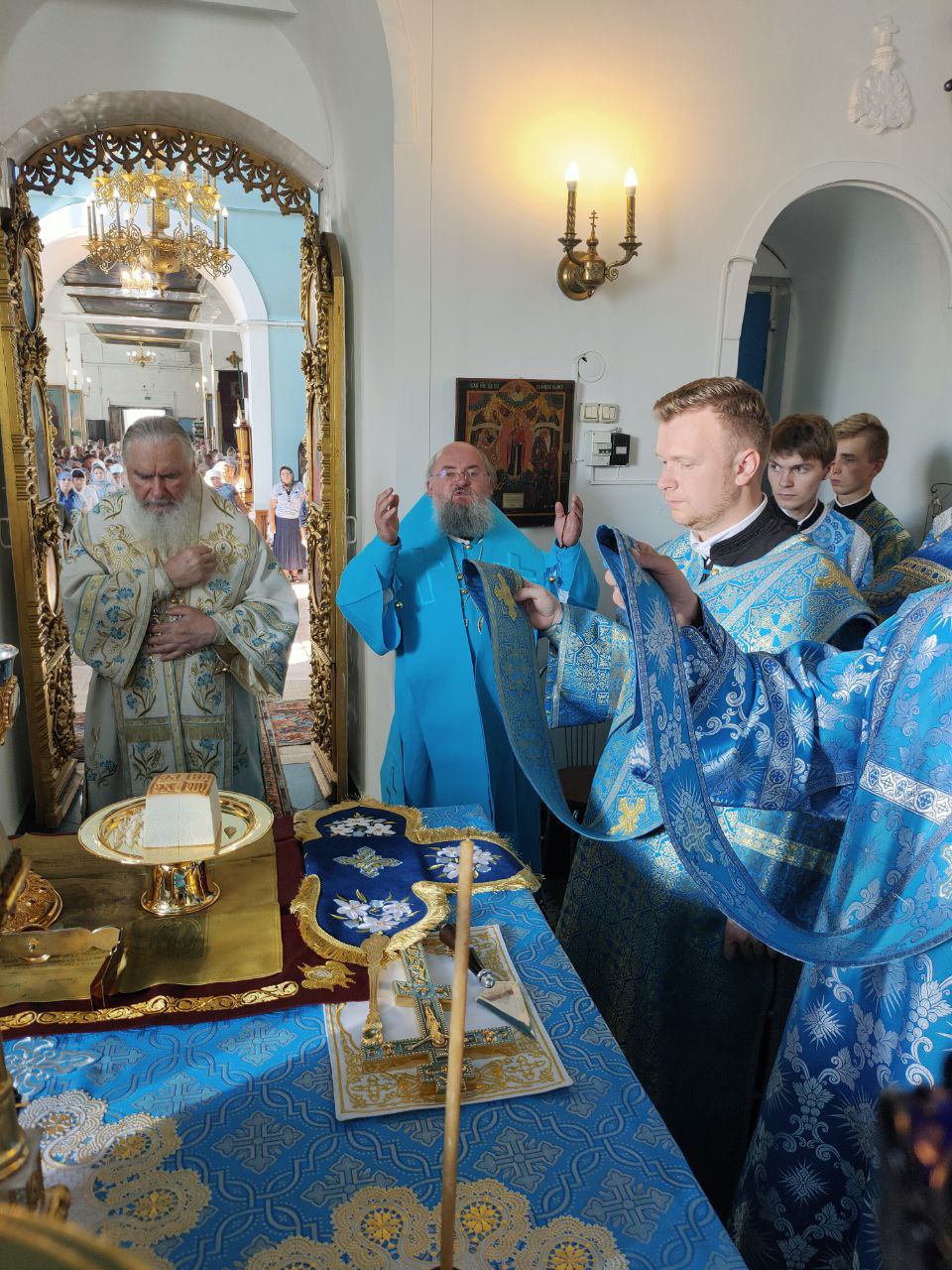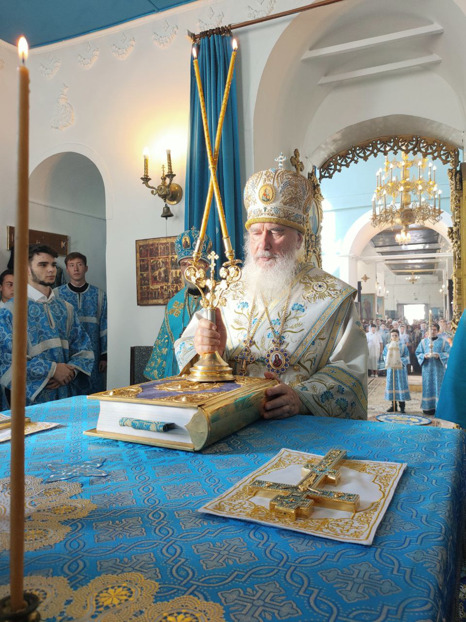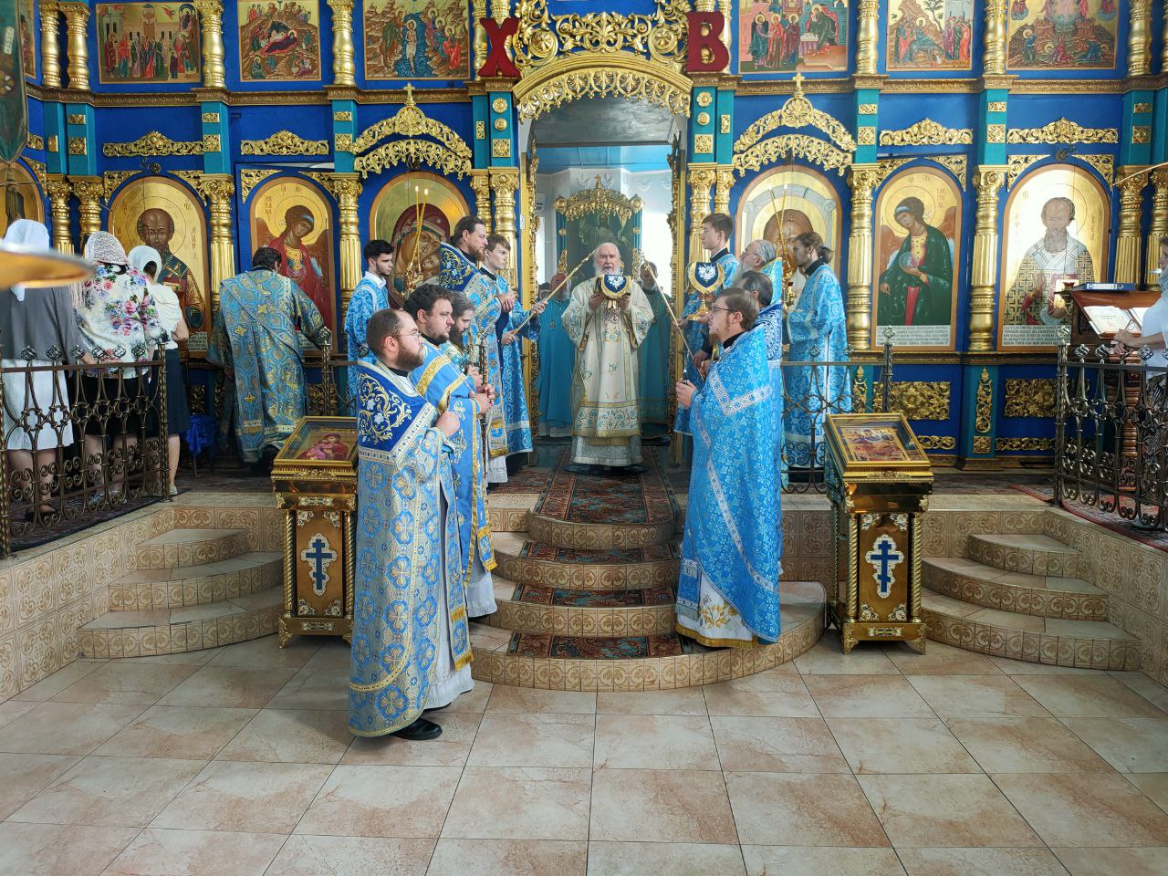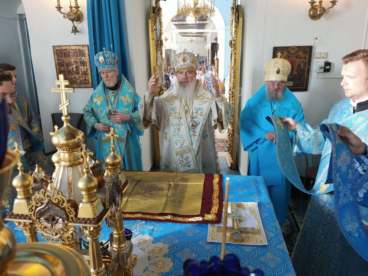 По отпусте литургии священнослужители совершили славление Божией Матери, а затем, сотворив молитву Пресвятой Богородице, архипастыри окропили молящихся святой водой.