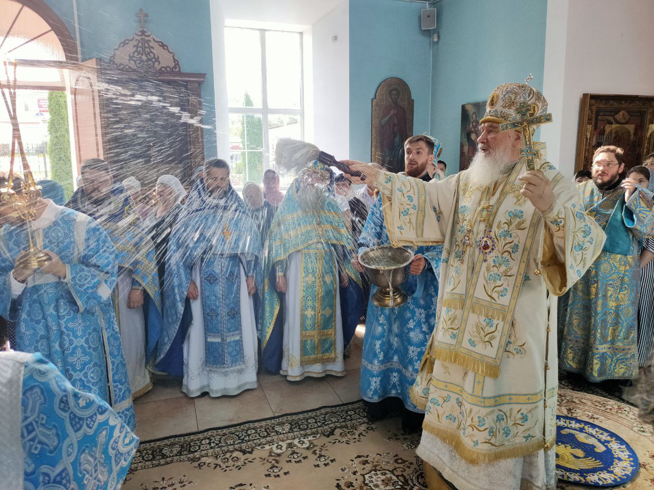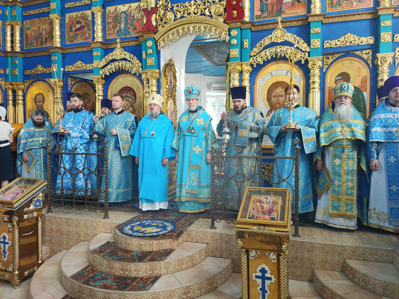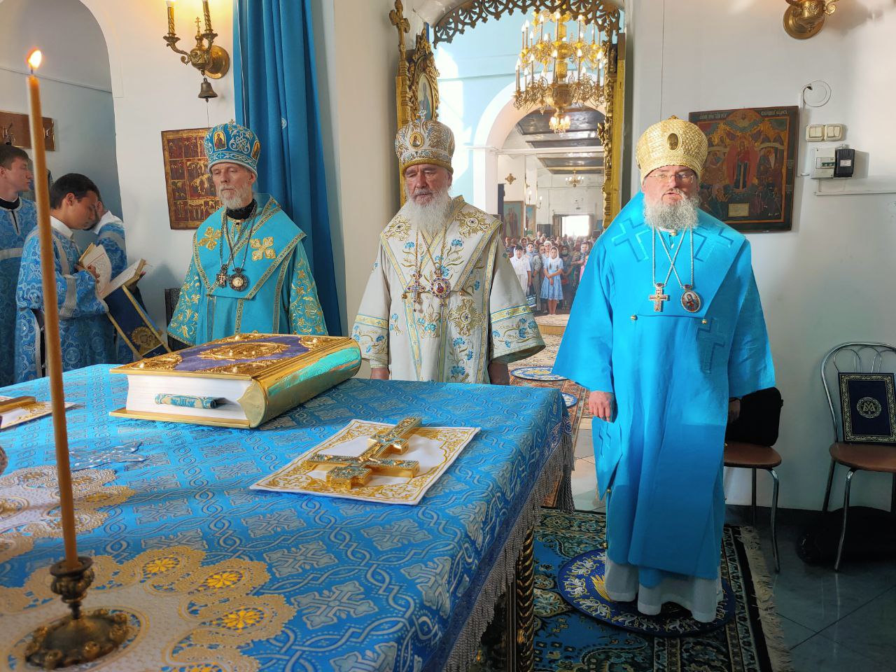 По отпусте литургии священнослужители совершили славление Божией Матери, а затем, сотворив молитву Пресвятой Богородице, архипастыри окропили молящихся святой водой.