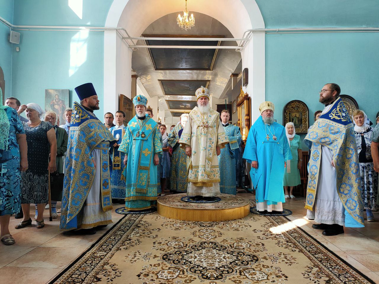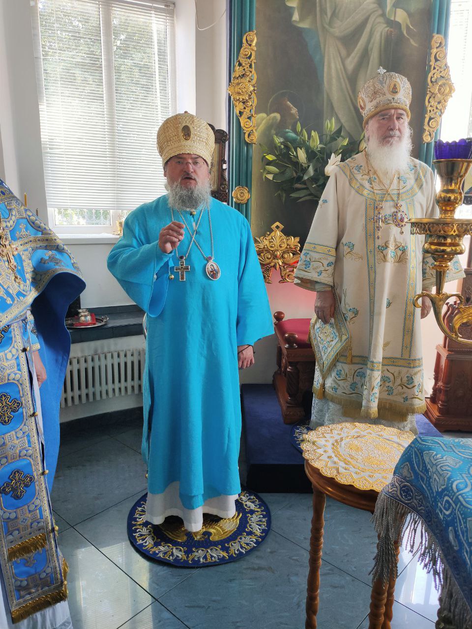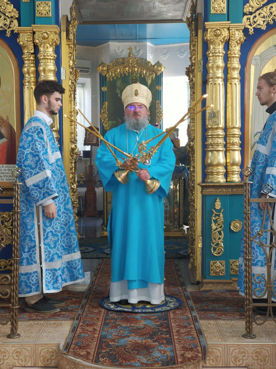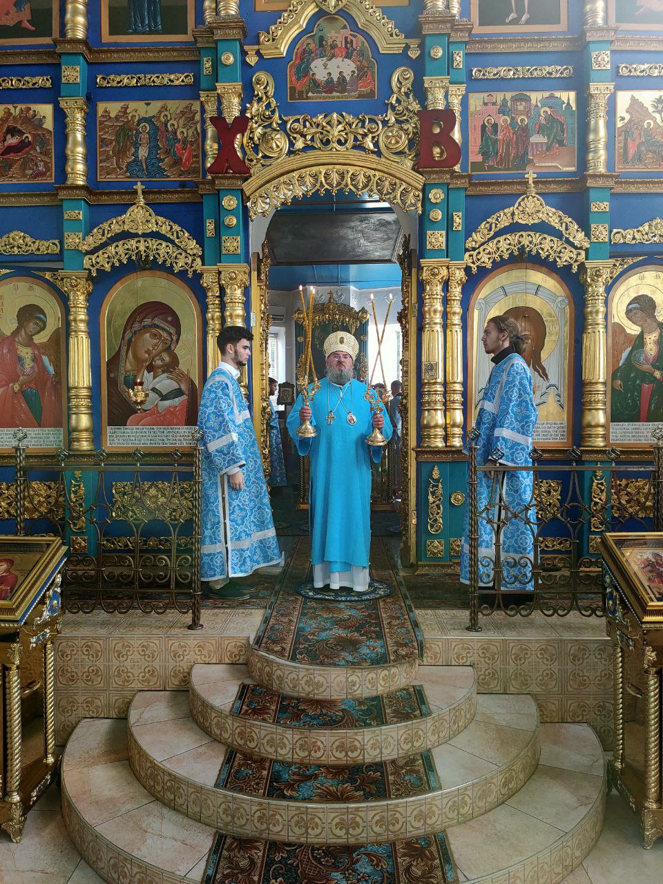 По отпусте литургии священнослужители совершили славление Божией Матери, а затем, сотворив молитву Пресвятой Богородице, архипастыри окропили молящихся святой водой.