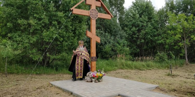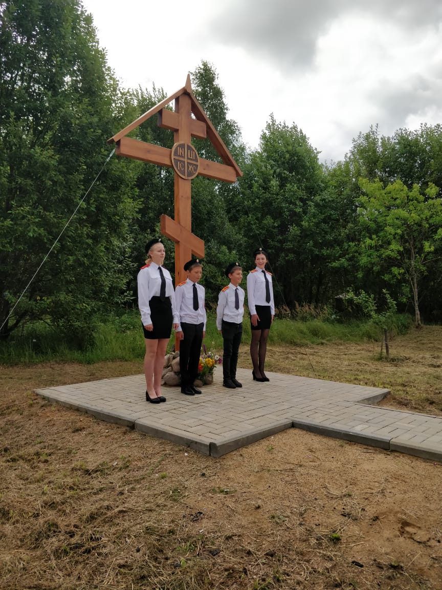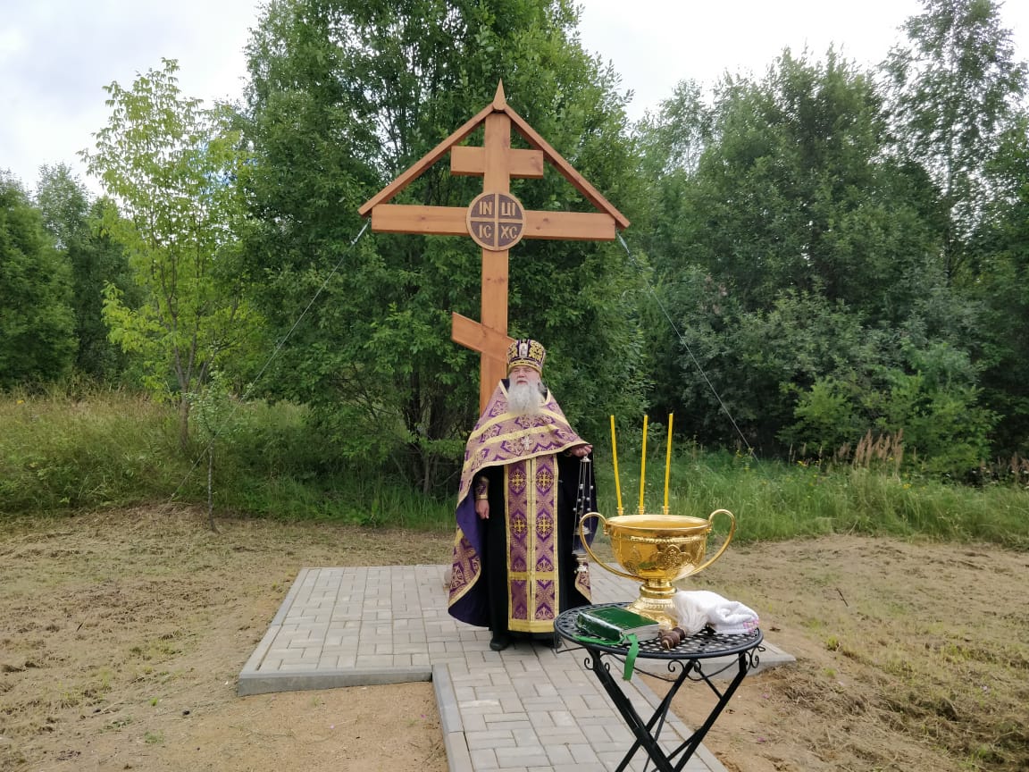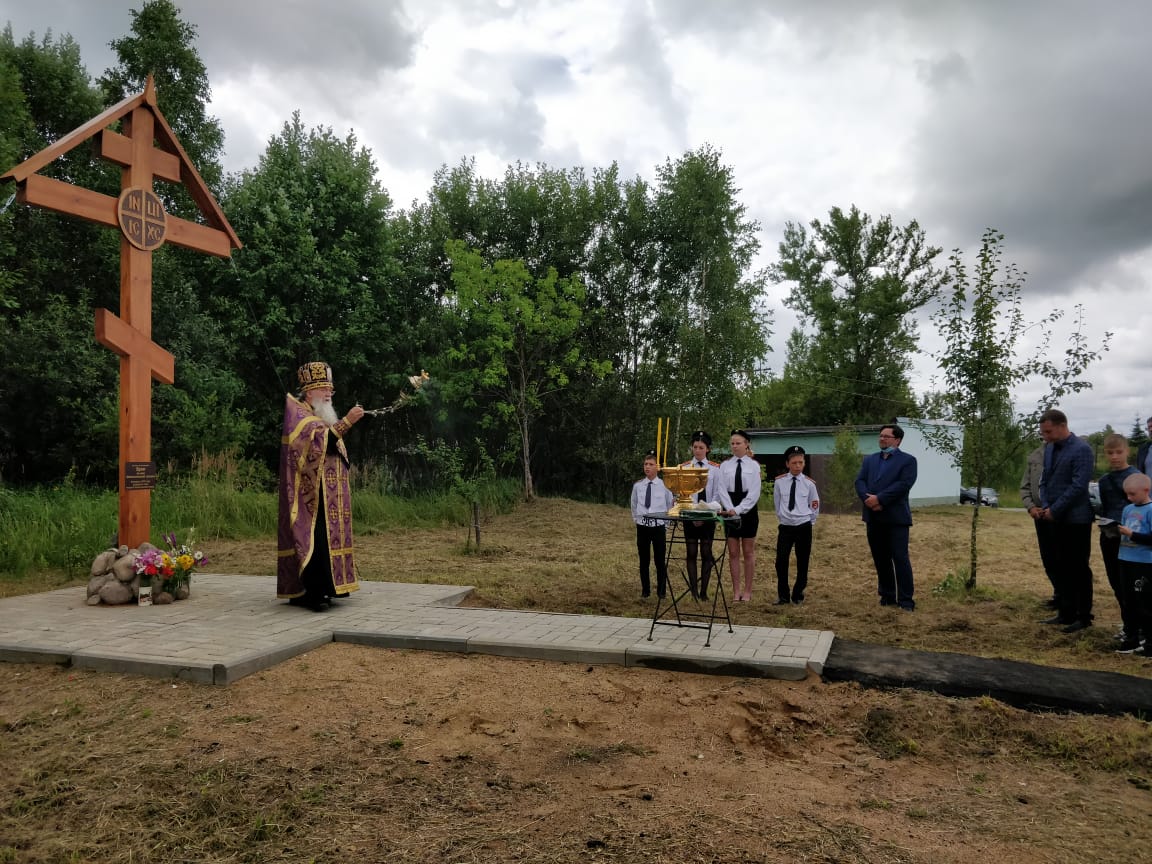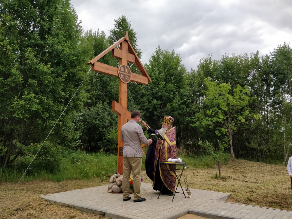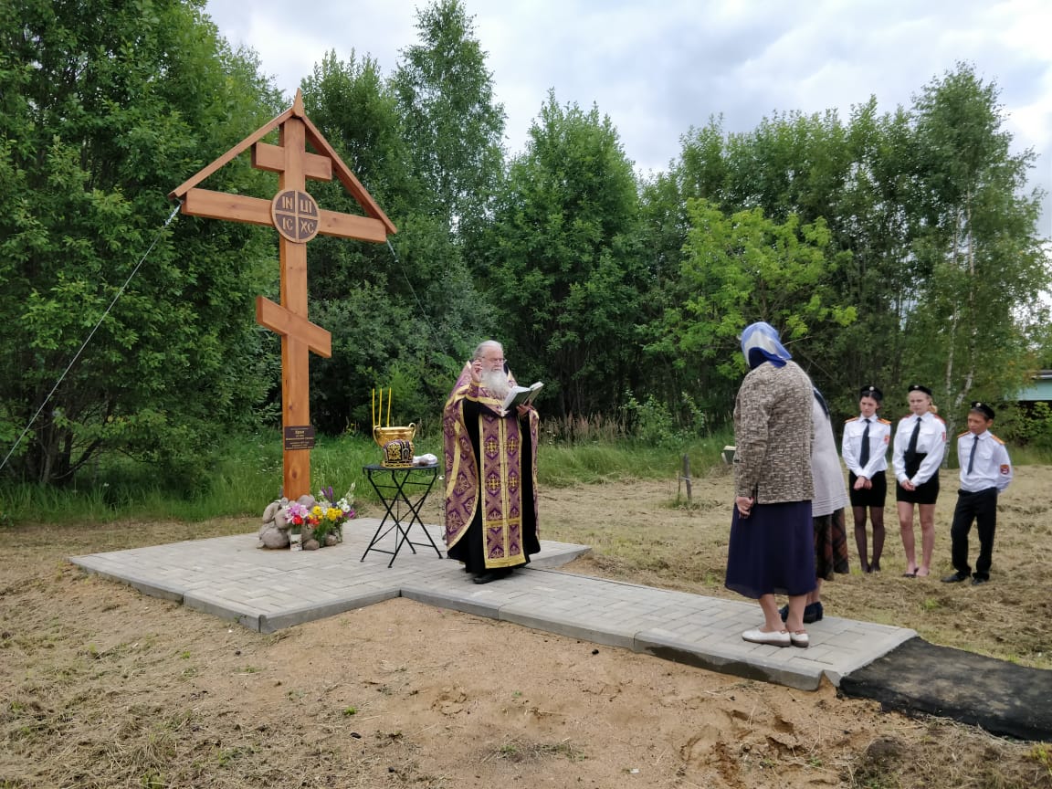 Крест установлен на месте ранее бывшей Троицкой церкви с двумя приделами в честь святого великомученика Димитрия Солунского (правый) и святых мучеников Флора и Лавра (левый). Закрыт храм был в 1937г, а в годы Великой Отечественной войны был разрушен фашистами.