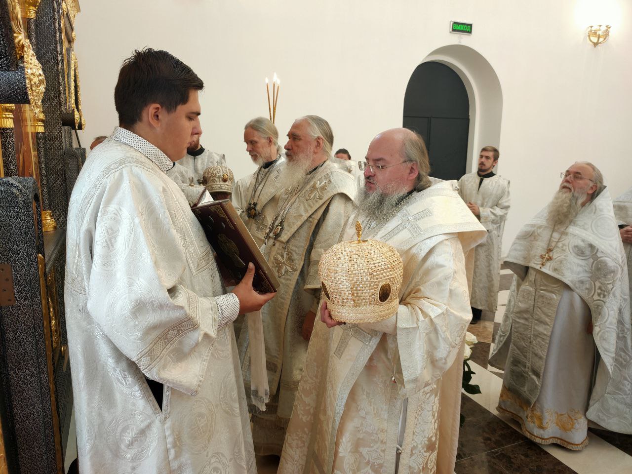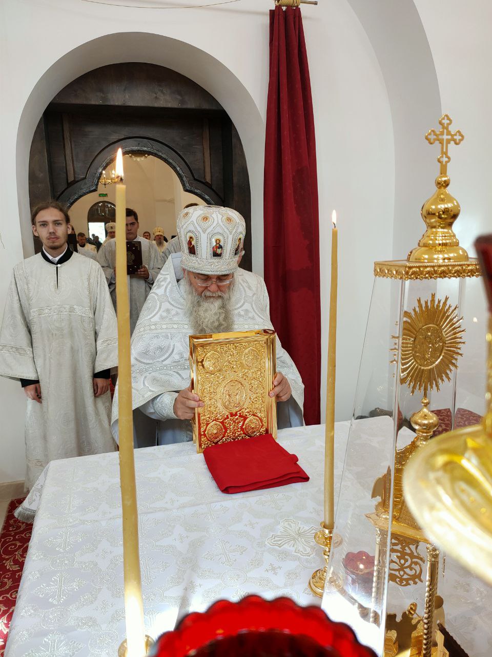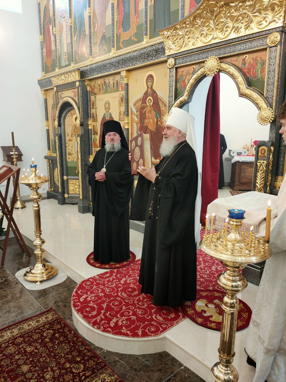 На память о состоявшемся торжественном богослужении Глава митрополии передал в храм Напрестольное Евангелие в кожаном переплёте.