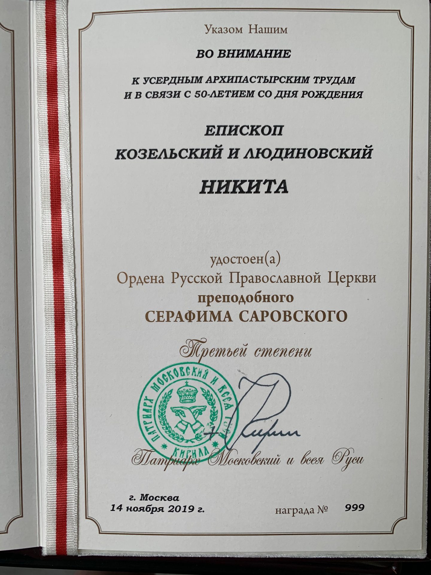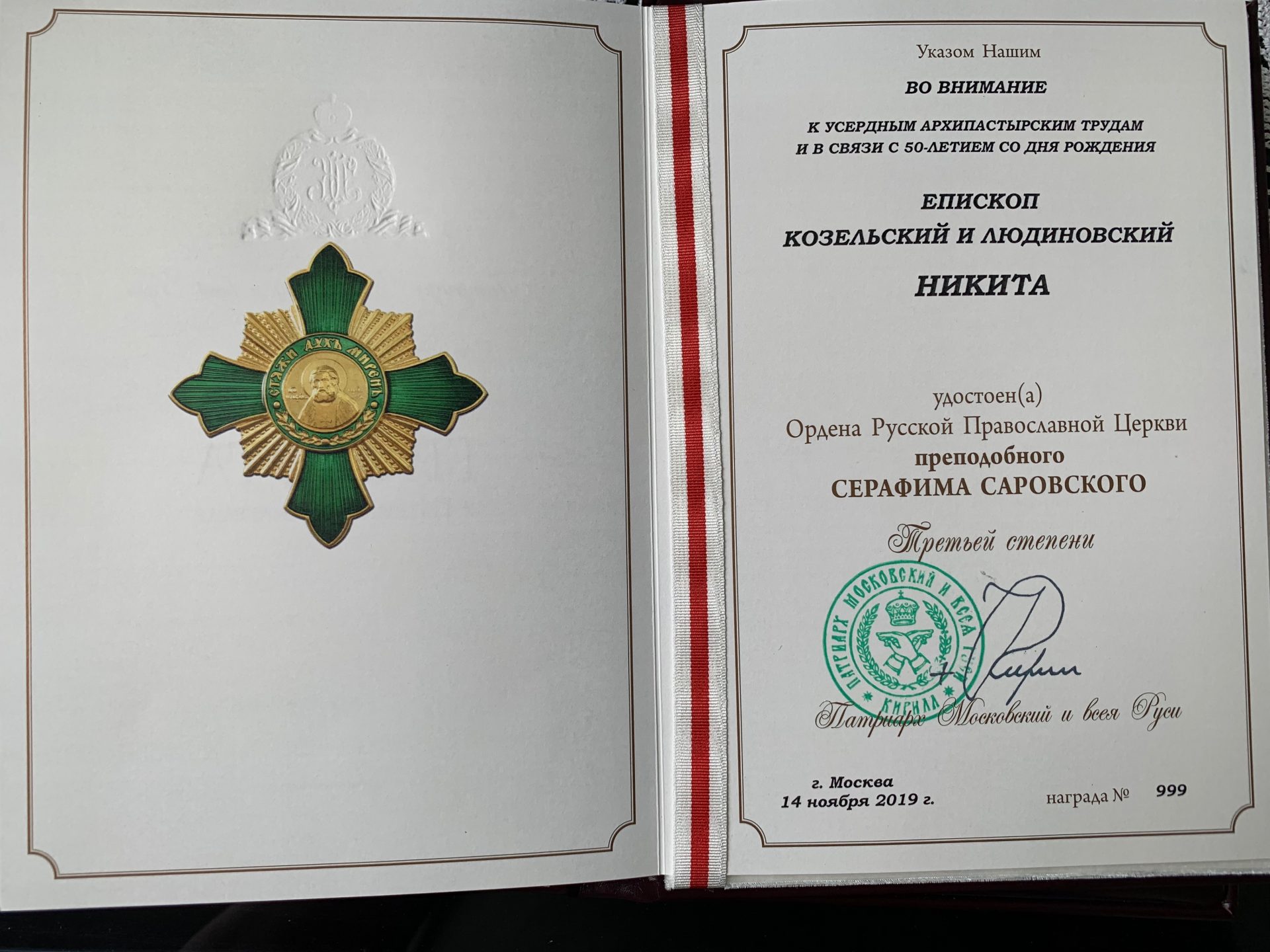 19 августа, в праздник Преображения Господа нашего Иисуса Христа в кафедральном соборном храме Христа Спасителя города Москвы, по окончании Божественной литургии, Святейший Патриарх Московский и всея Руси КИРИЛЛ, во внимание к усердным архипастырским трудам и в связи с 50-летием со дня рождения, вручил епископу Козельскому и Людиновскому Никите орден преподобного Серафима Саровского III степени.