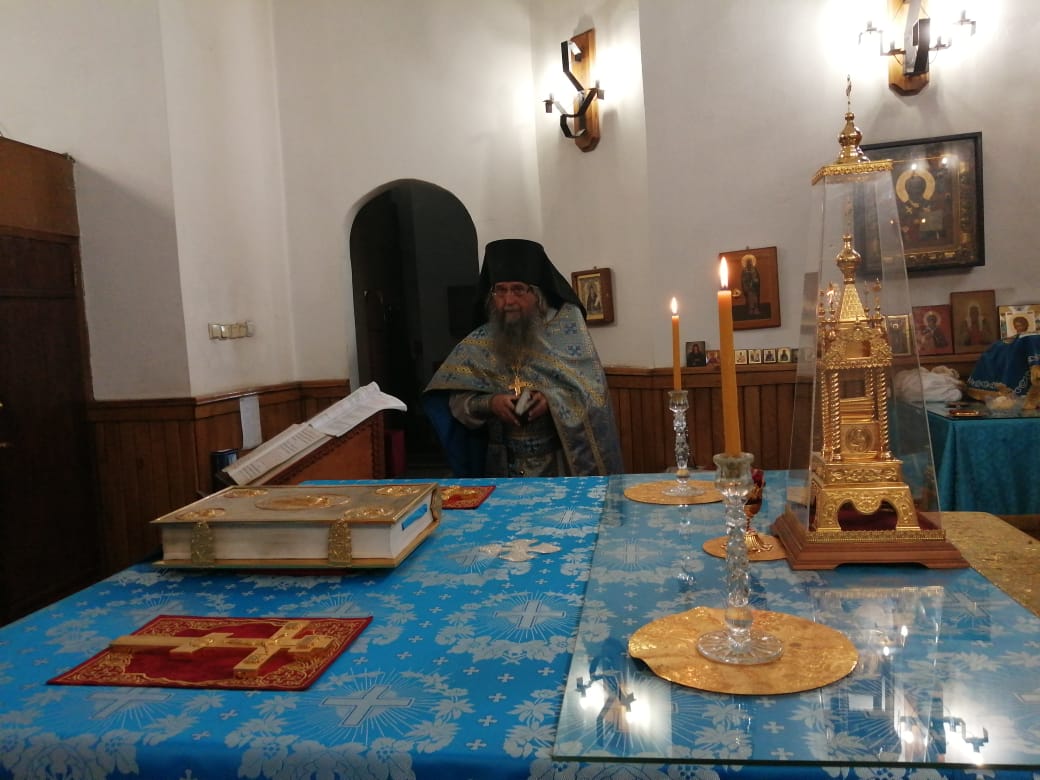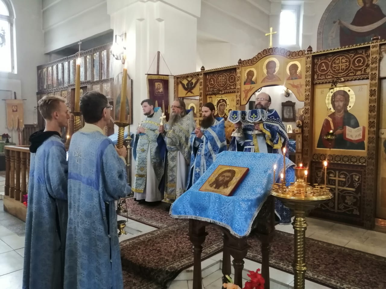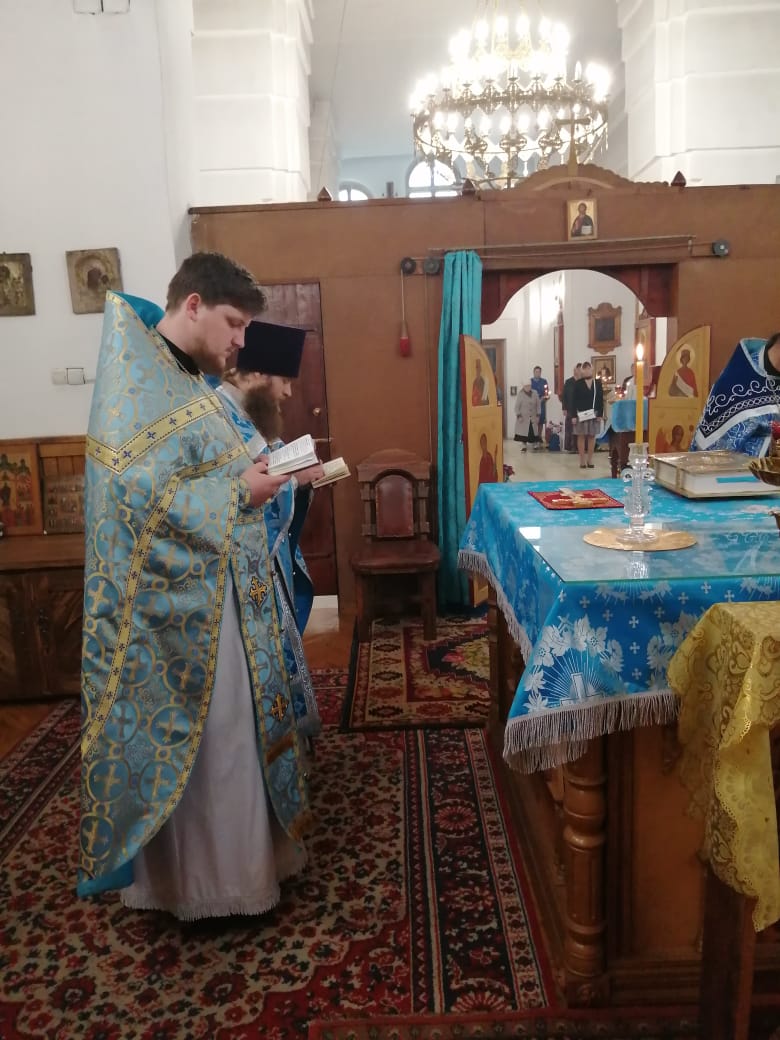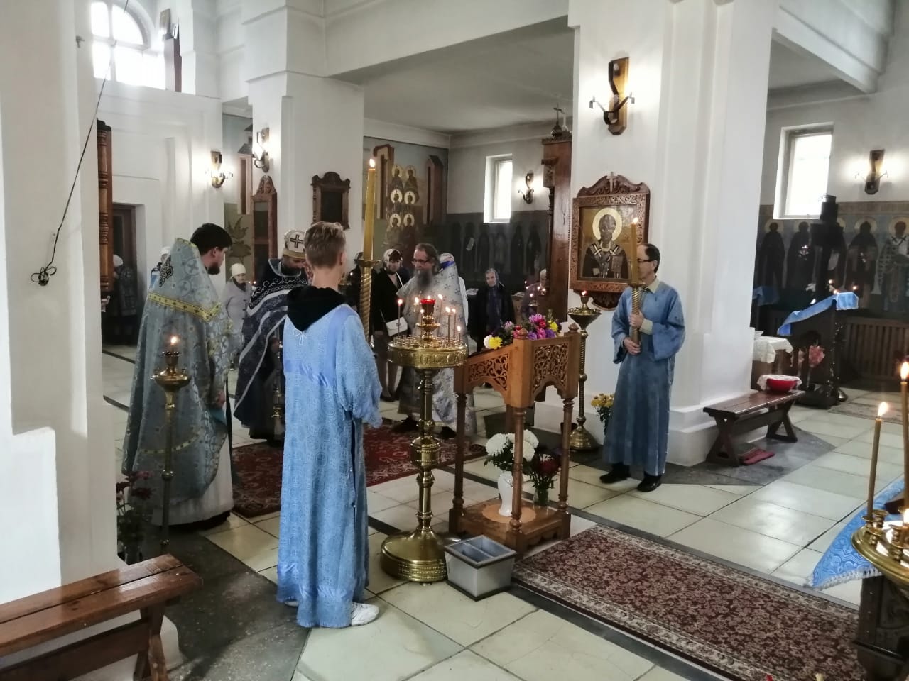 По отпусте Литургии священнослужители совершили славление Пресвятой Богородице пред Ее чудотворным образом. Затем настоятель храма протоиерей Константин обратился к богомольцам с праздничным словом.