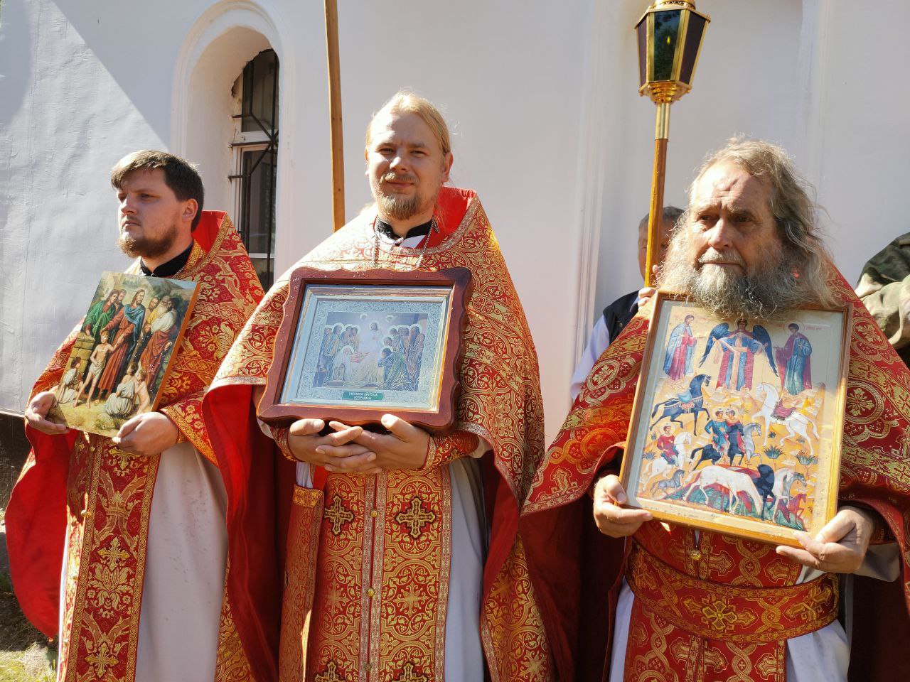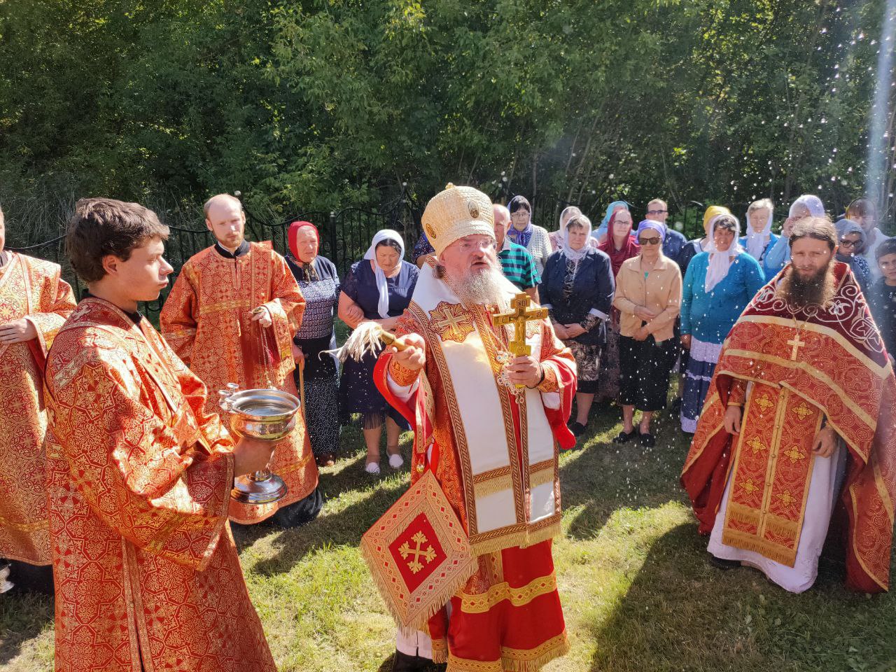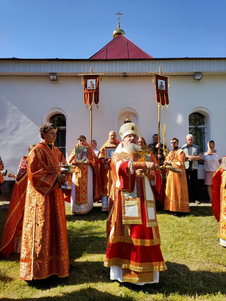 По отпусте литургии священнослужители совершили праздничный молебен святым мученикам Фролу и Лавру и крестный ход вокруг храма, в завершении которого, вознеся молитву угодникам Божиим, владыка обратился к богомольцам с проповедью.