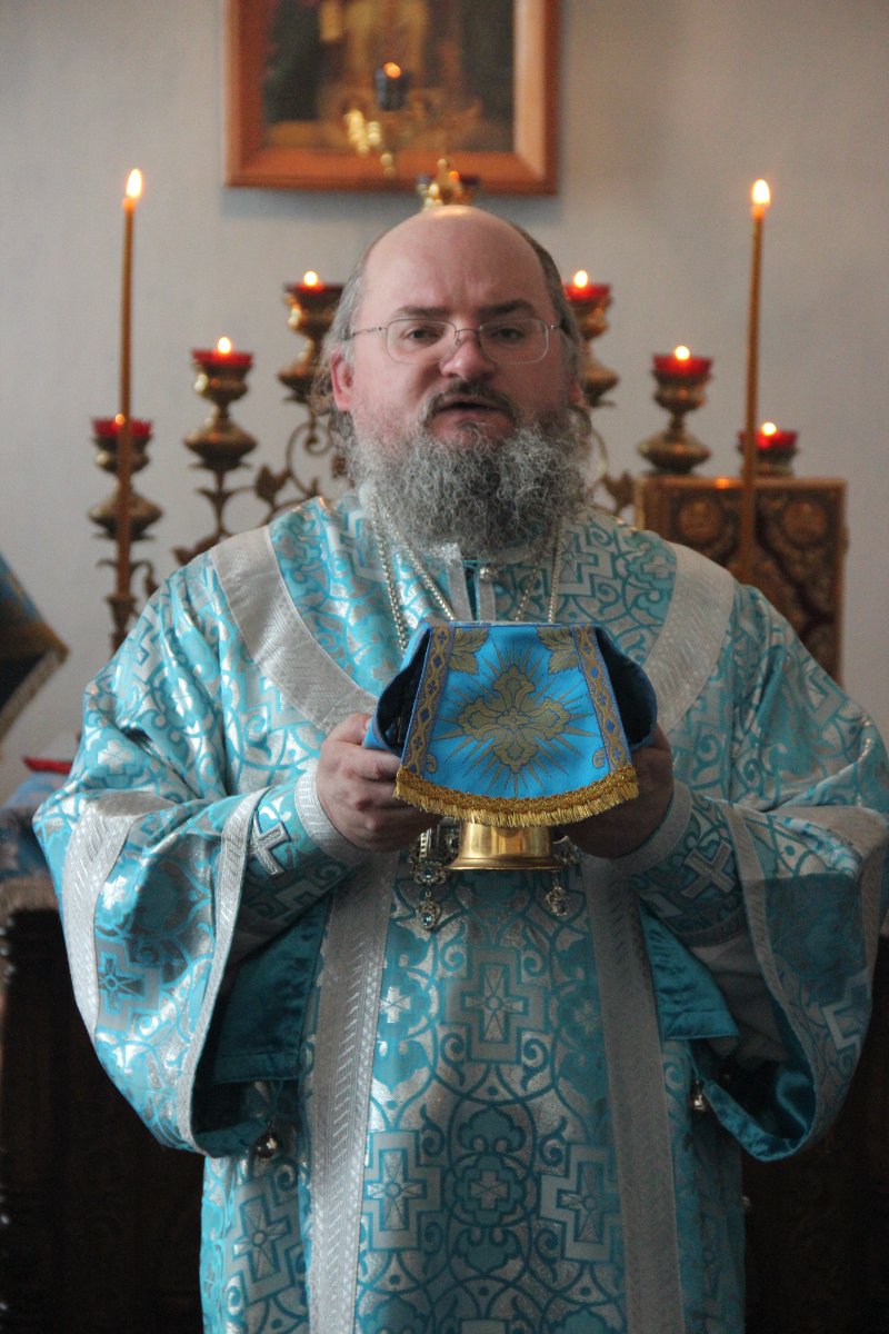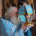 После отпуста литургии в центре храма, пред чтимым образом Божией Матери священнослужители совершили праздничное молебное пение Царице Небесной, а затем владыка обратился к молящимся с проповедью.