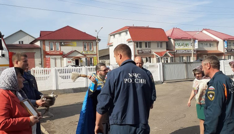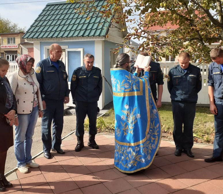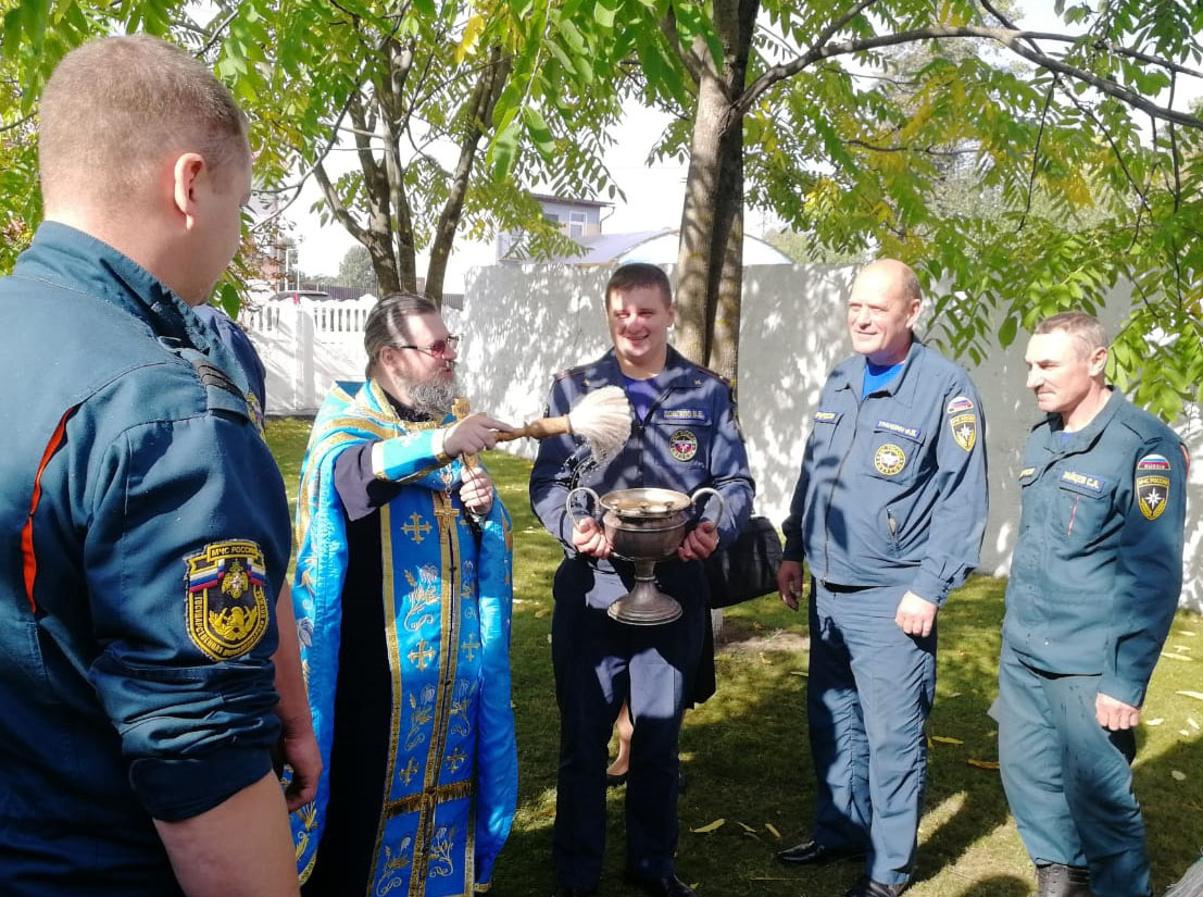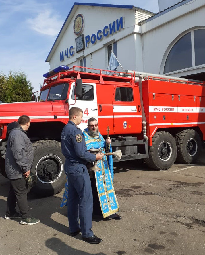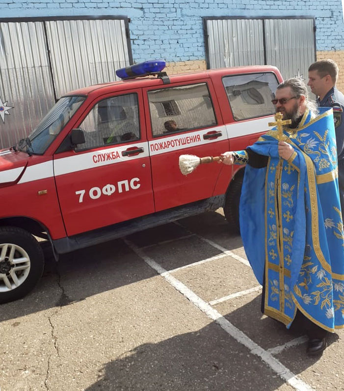 Затем, молящиеся со славлением Царице Небесной и Заступнице нашей прошли малым крестным ходом по территории МЧС, во время которого священник окропил святой водой технику и сотрудников спасательной организации.