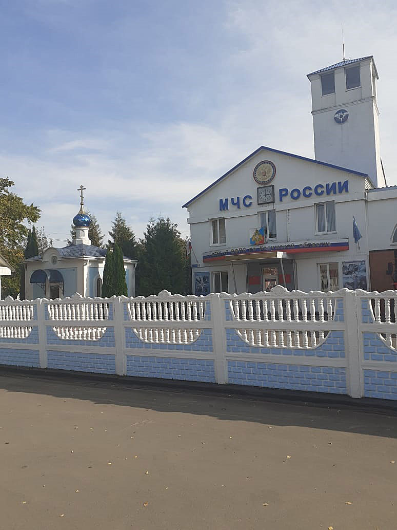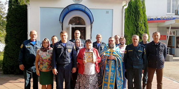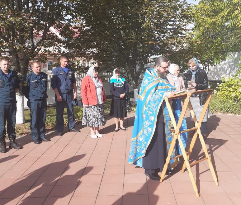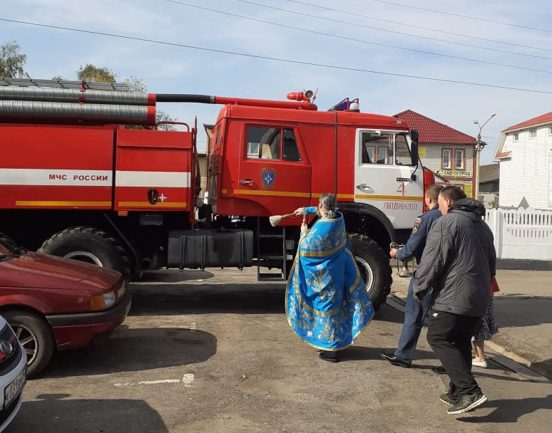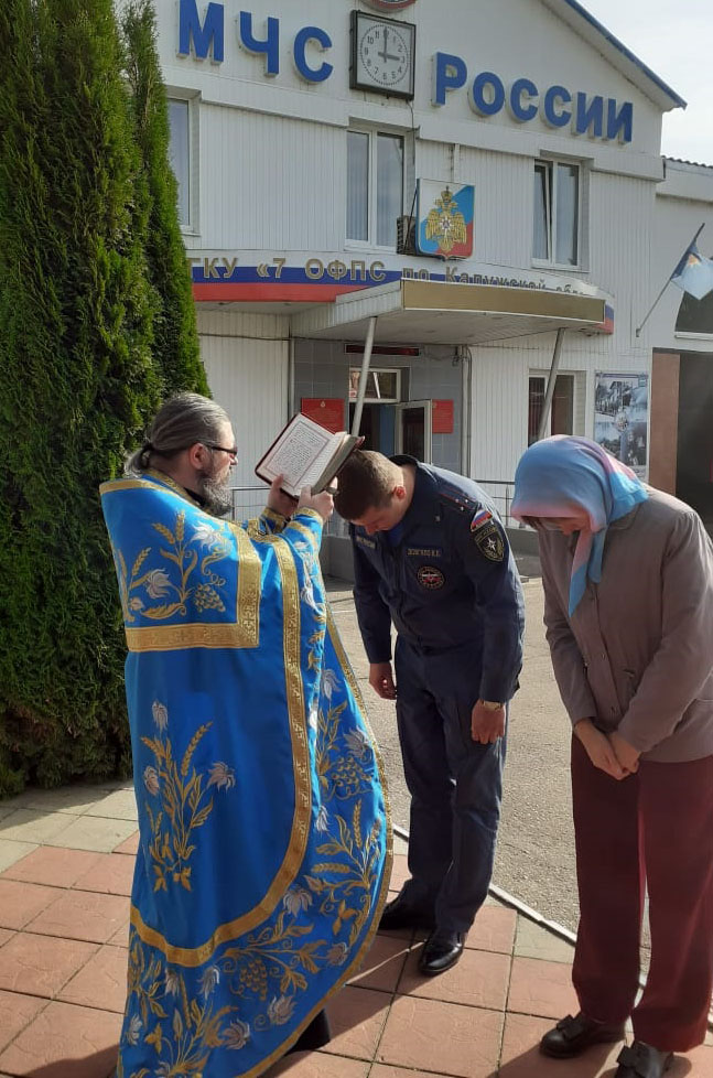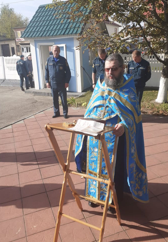 Затем, молящиеся со славлением Царице Небесной и Заступнице нашей прошли малым крестным ходом по территории МЧС, во время которого священник окропил святой водой технику и сотрудников спасательной организации.