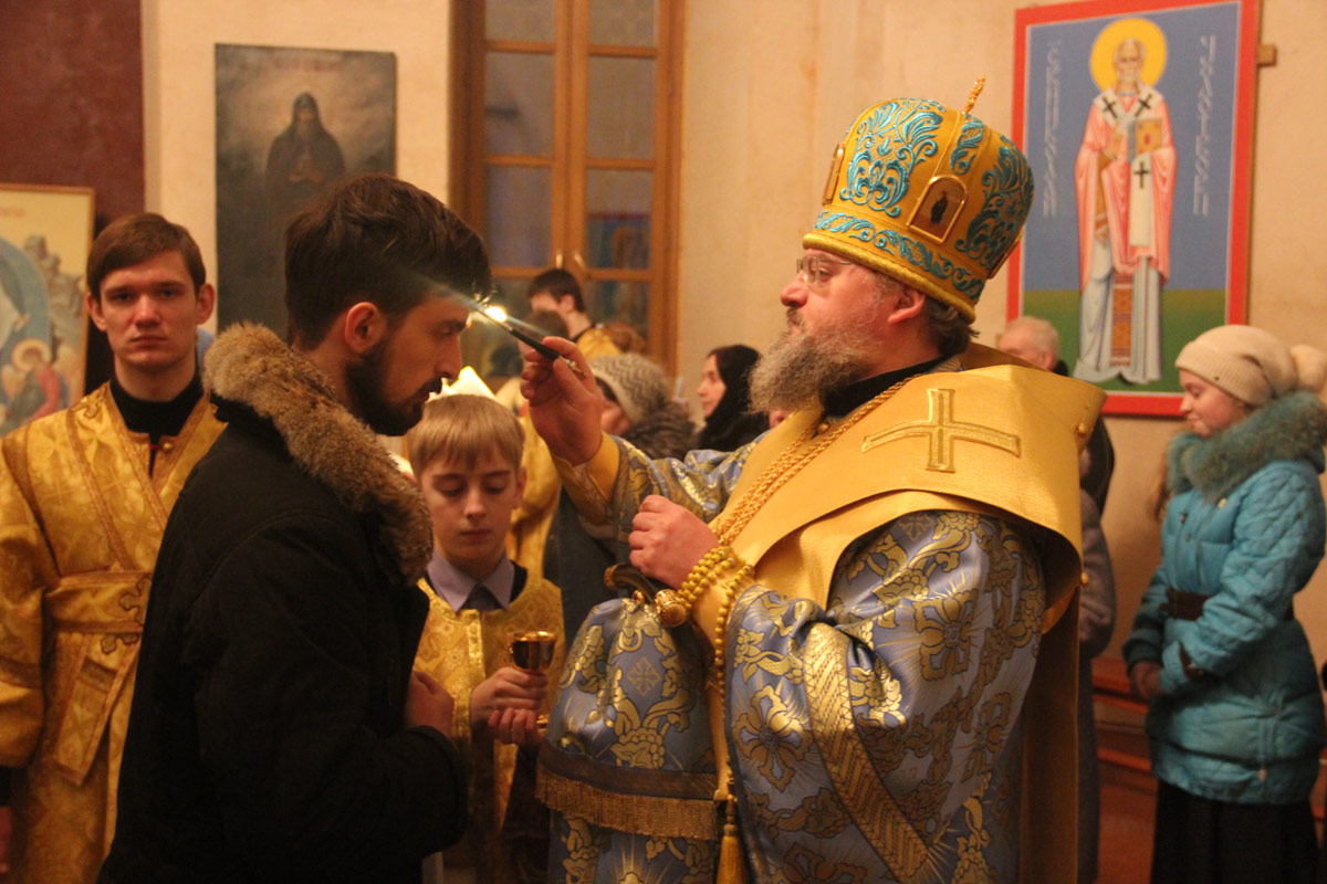 Накануне великого двунадесятого праздника Сретения Господа Бога и Спаса нашего Иисуса Христа епископ Козельский и Людиновский Никита управляющий Козельской епархией совершил праздничное всенощное бдение в Свято-Успенском кафедральном соборе города Козельска.