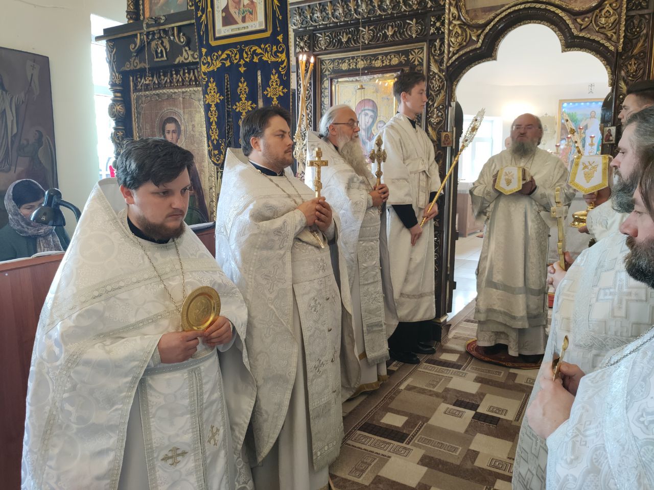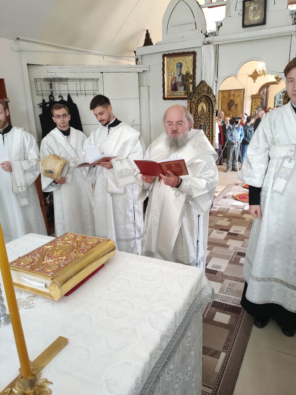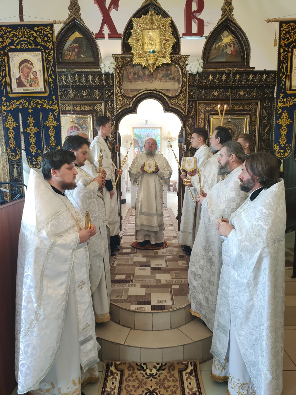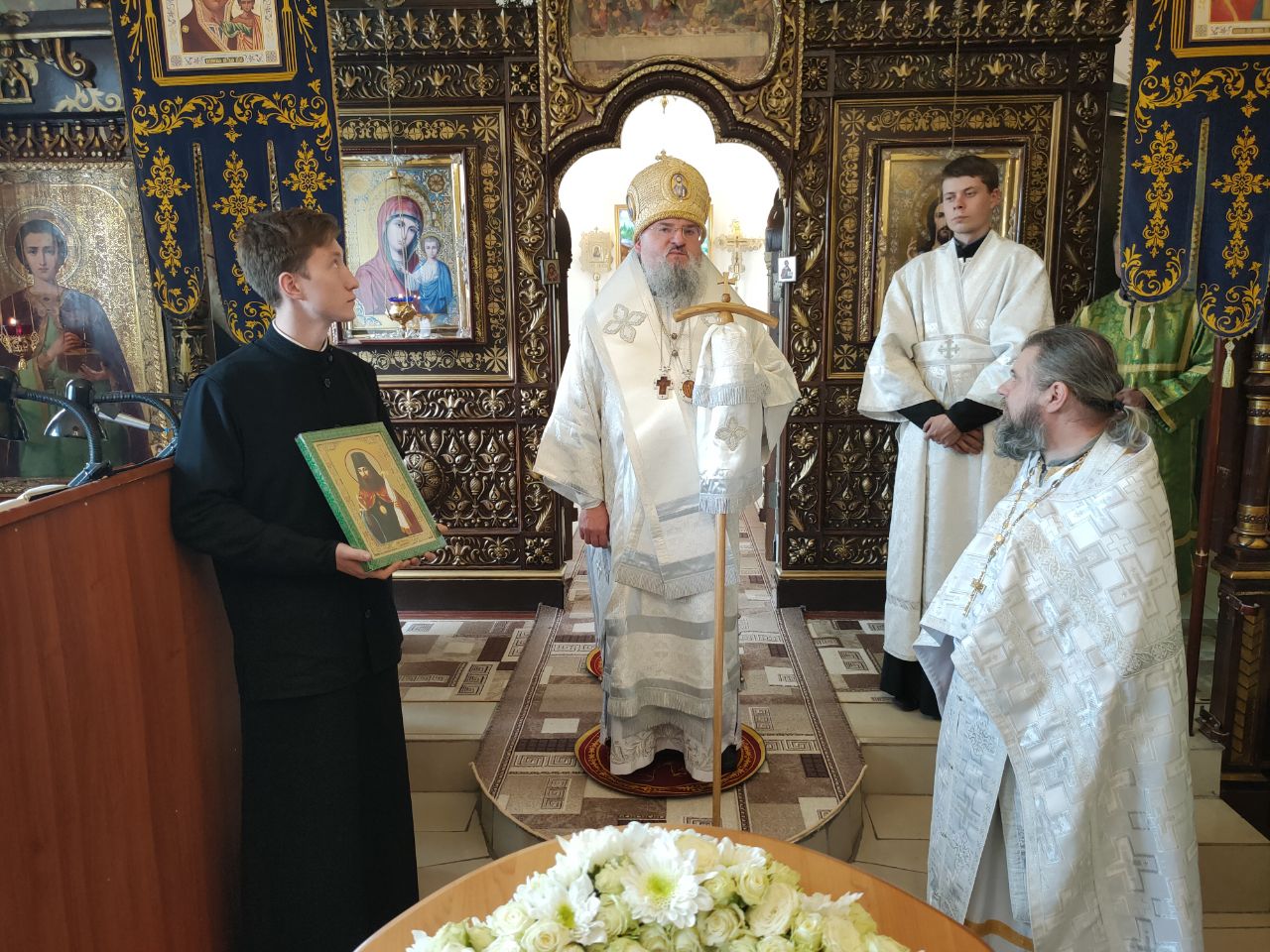 Его Преосвященство сослужили: благочинный округа протоиерей Василий Биляк, настоятель казанского кафедрального собора, митрофорный протоиерей Алексий Жиганов, протоиерей Михаил Карпенко — настоятель храма, протоиерей Антоний Хатунцев, иерей Георгий Краснов, иерей Иоанн Майоров, диакон Евгений Васильев и иеродиакон Лука (Старостин). За богослужением молился глава Людиновского района Аганичев Даниил Михайлович. После великого освящения храма была совершена Божественная литургия, в завершении который владыка обратился с проповедью к богомольцам. Архипастырь поздравил настоятеля храма протоиерей Михаила Карпенко со знаменательным событием жизни прихода и преподнес в дар храму икону святителя Тихона Задонского.