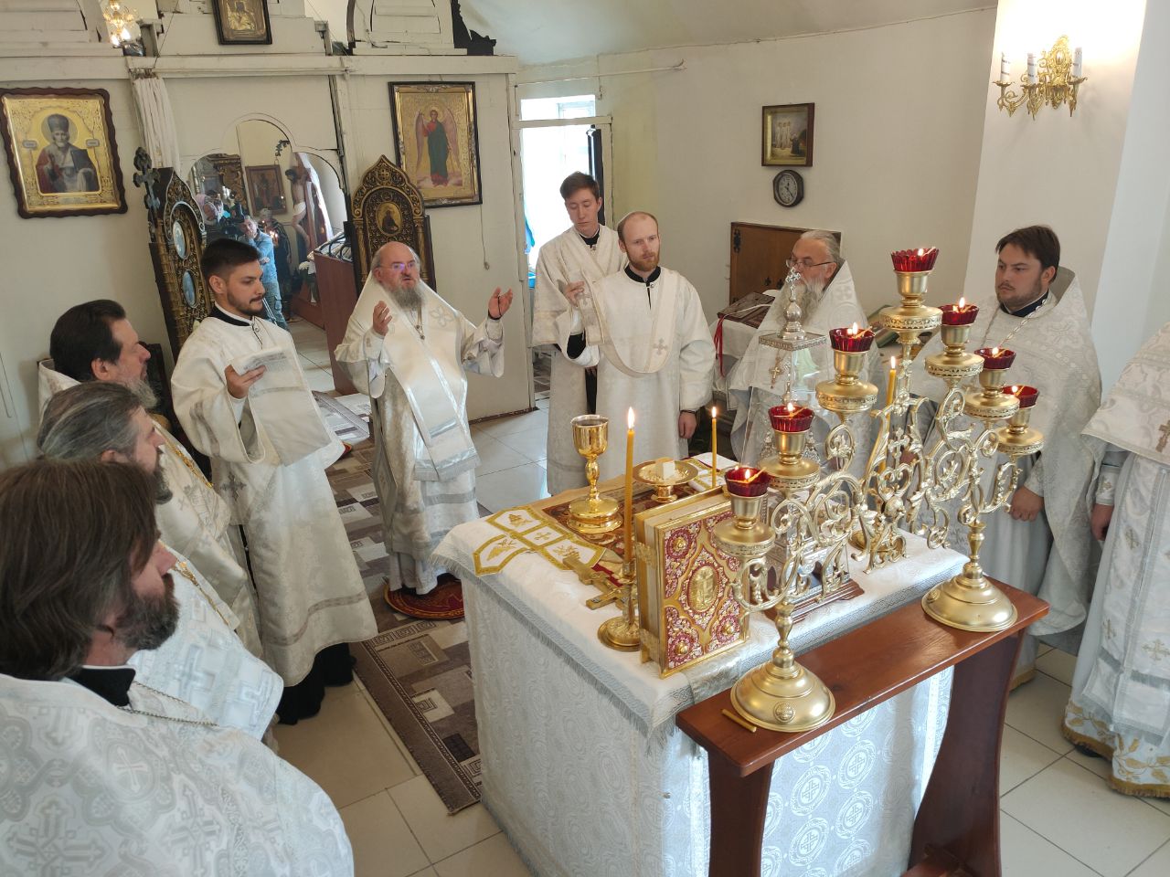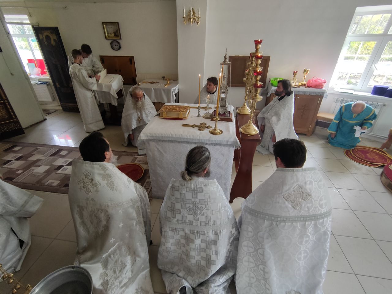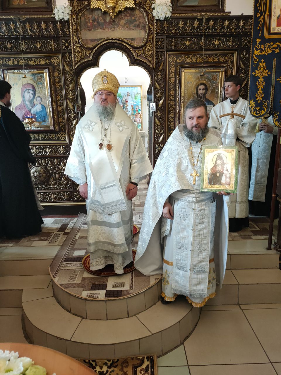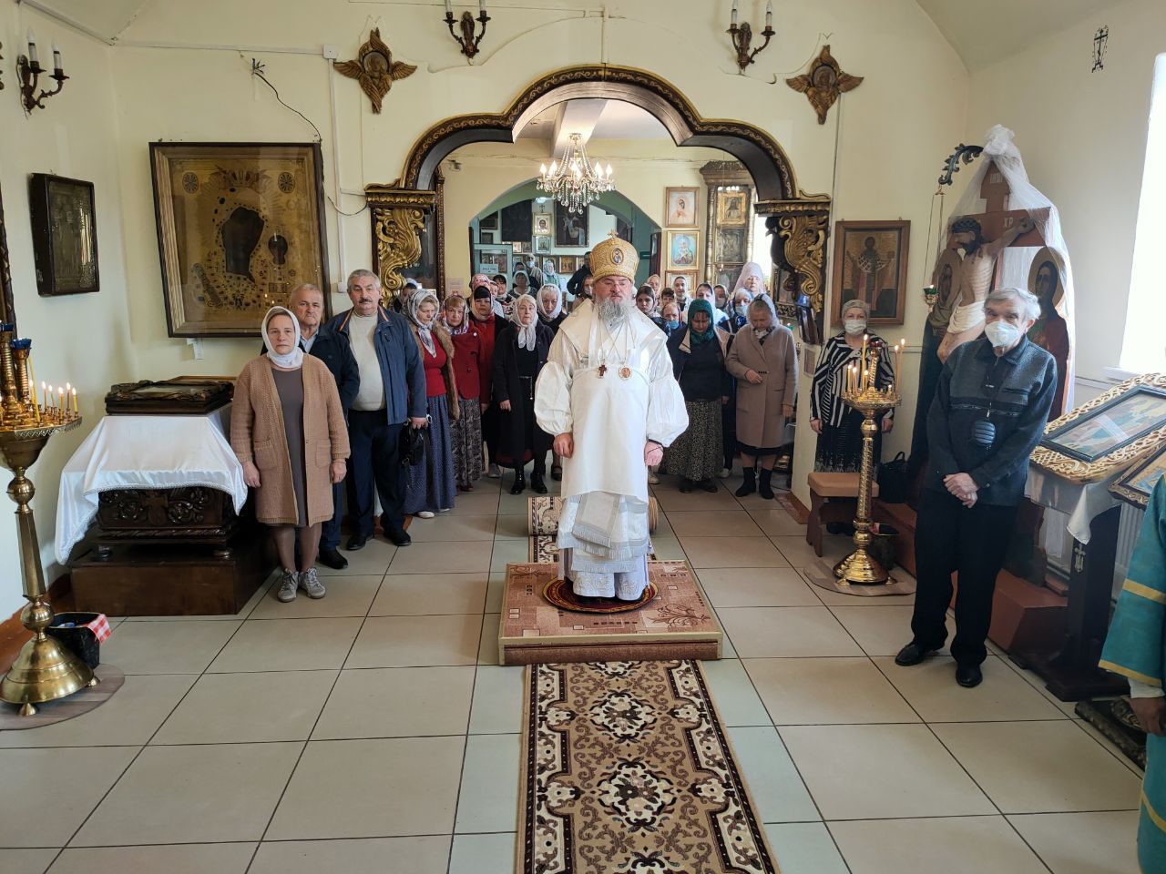 Его Преосвященство сослужили: благочинный округа протоиерей Василий Биляк, настоятель казанского кафедрального собора, митрофорный протоиерей Алексий Жиганов, протоиерей Михаил Карпенко — настоятель храма, протоиерей Антоний Хатунцев, иерей Георгий Краснов, иерей Иоанн Майоров, диакон Евгений Васильев и иеродиакон Лука (Старостин). За богослужением молился глава Людиновского района Аганичев Даниил Михайлович. После великого освящения храма была совершена Божественная литургия, в завершении который владыка обратился с проповедью к богомольцам. Архипастырь поздравил настоятеля храма протоиерей Михаила Карпенко со знаменательным событием жизни прихода и преподнес в дар храму икону святителя Тихона Задонского.