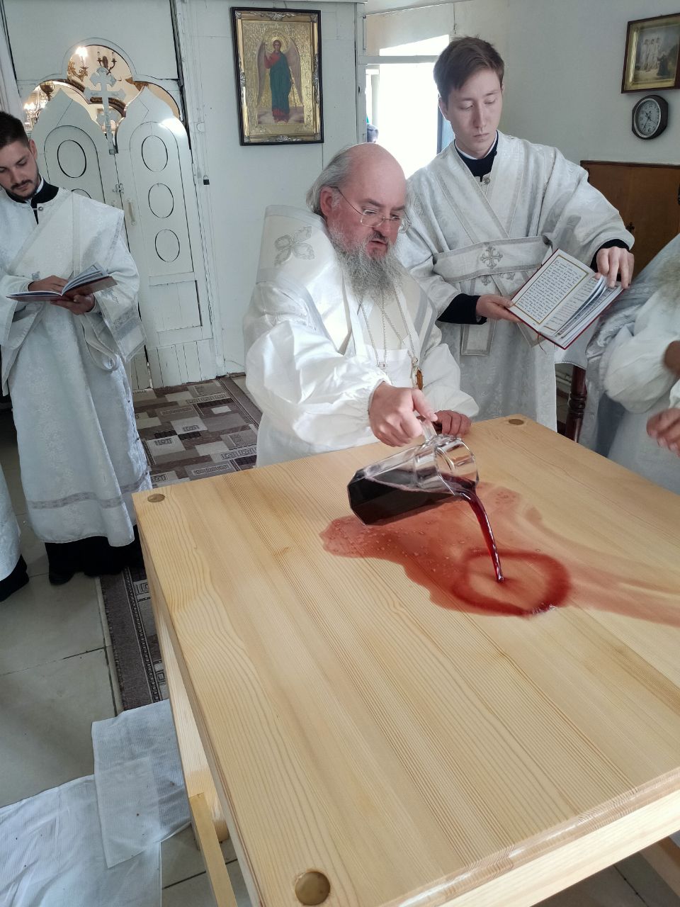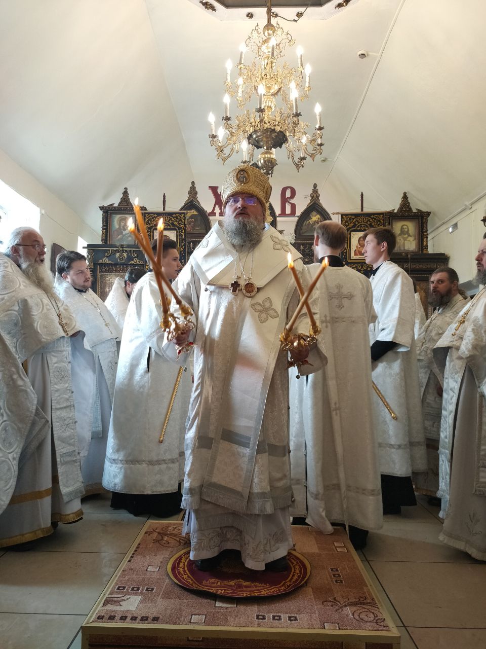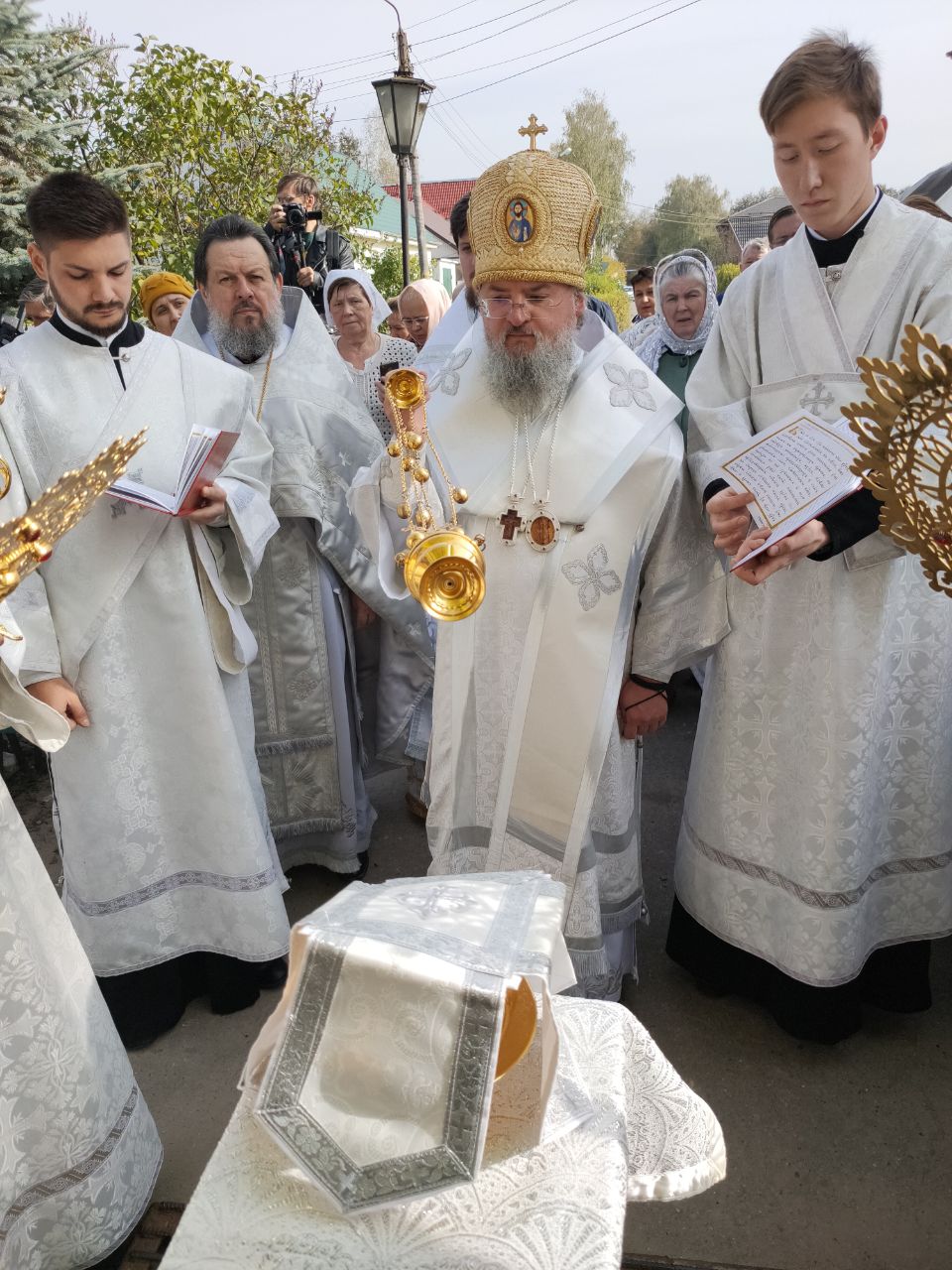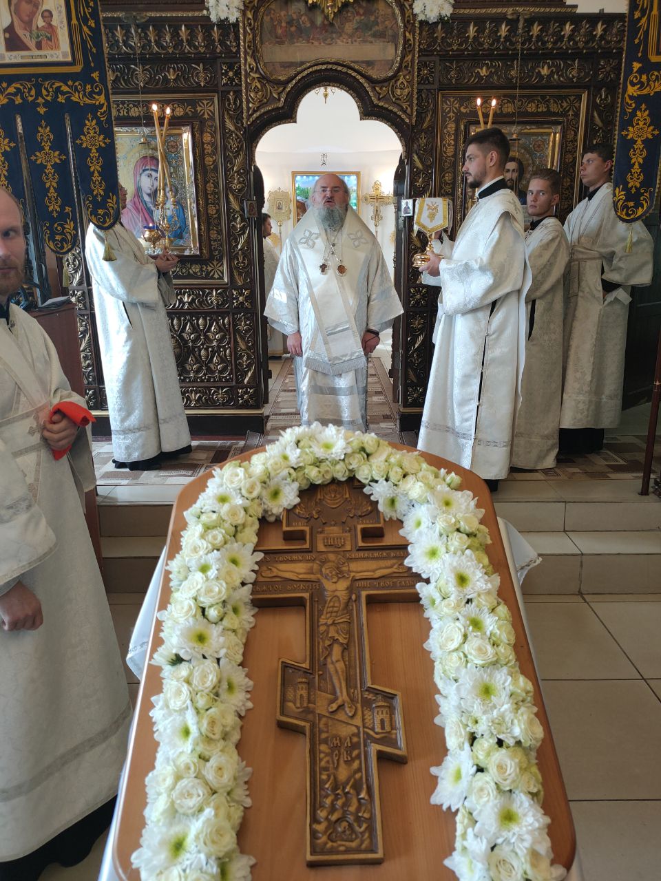Его Преосвященство сослужили: благочинный округа протоиерей Василий Биляк, настоятель казанского кафедрального собора, митрофорный протоиерей Алексий Жиганов, протоиерей Михаил Карпенко — настоятель храма, протоиерей Антоний Хатунцев, иерей Георгий Краснов, иерей Иоанн Майоров, диакон Евгений Васильев и иеродиакон Лука (Старостин). За богослужением молился глава Людиновского района Аганичев Даниил Михайлович. После великого освящения храма была совершена Божественная литургия, в завершении который владыка обратился с проповедью к богомольцам. Архипастырь поздравил настоятеля храма протоиерей Михаила Карпенко со знаменательным событием жизни прихода и преподнес в дар храму икону святителя Тихона Задонского.