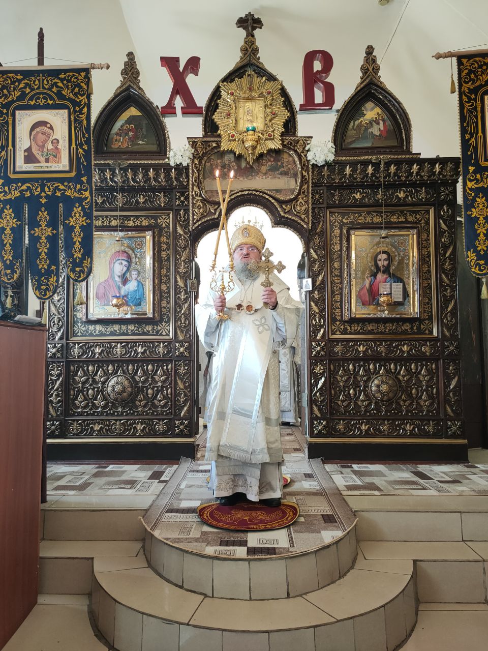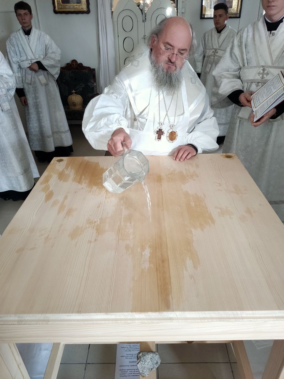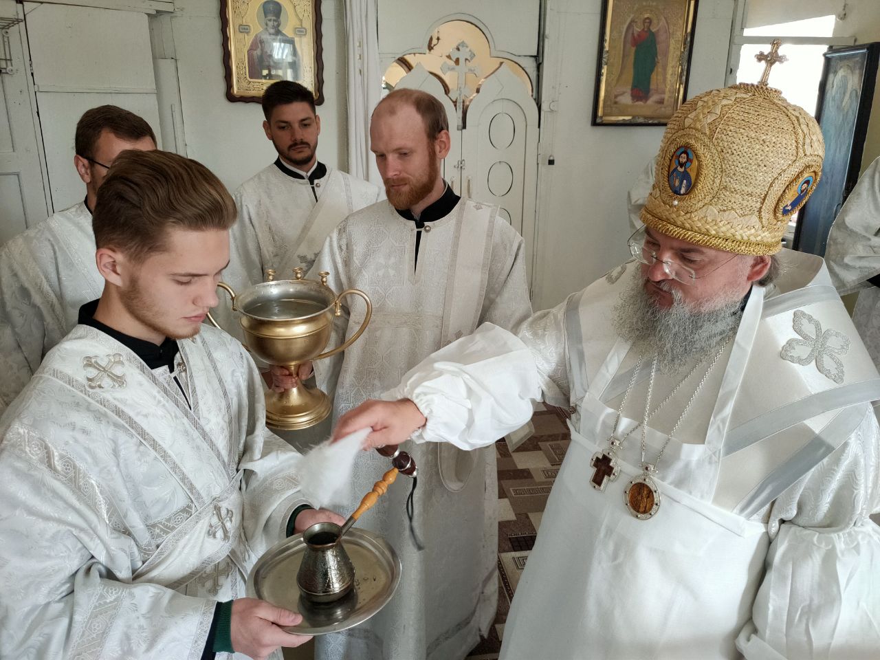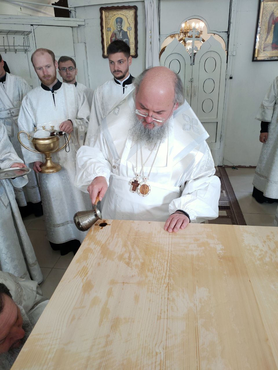 Его Преосвященство сослужили: благочинный округа протоиерей Василий Биляк, настоятель казанского кафедрального собора, митрофорный протоиерей Алексий Жиганов, протоиерей Михаил Карпенко — настоятель храма, протоиерей Антоний Хатунцев, иерей Георгий Краснов, иерей Иоанн Майоров, диакон Евгений Васильев и иеродиакон Лука (Старостин). За богослужением молился глава Людиновского района Аганичев Даниил Михайлович. После великого освящения храма была совершена Божественная литургия, в завершении который владыка обратился с проповедью к богомольцам. Архипастырь поздравил настоятеля храма протоиерей Михаила Карпенко со знаменательным событием жизни прихода и преподнес в дар храму икону святителя Тихона Задонского.