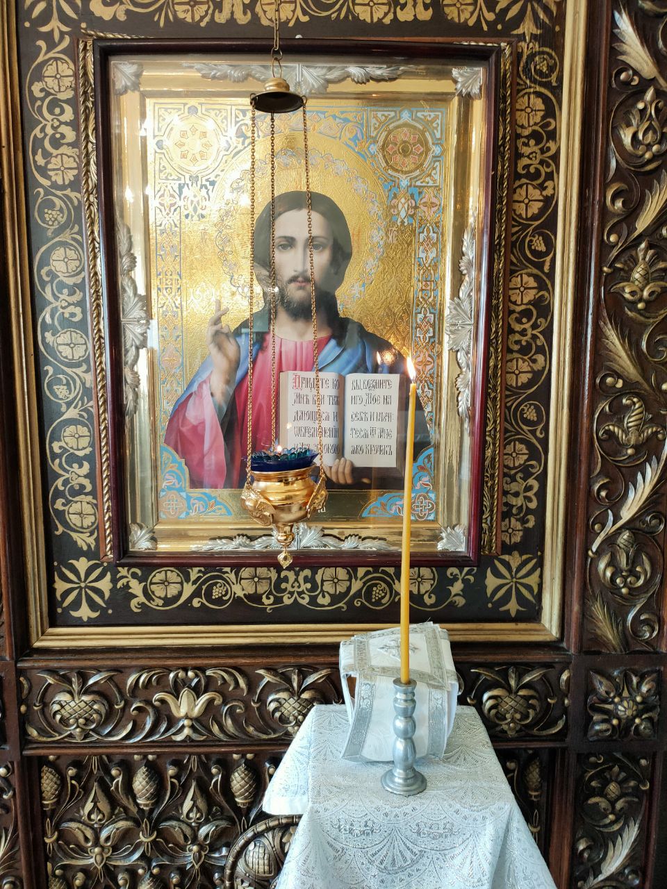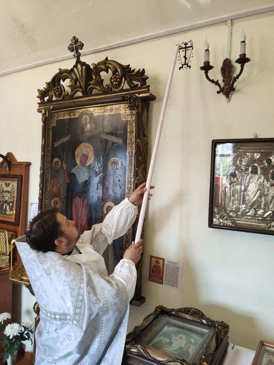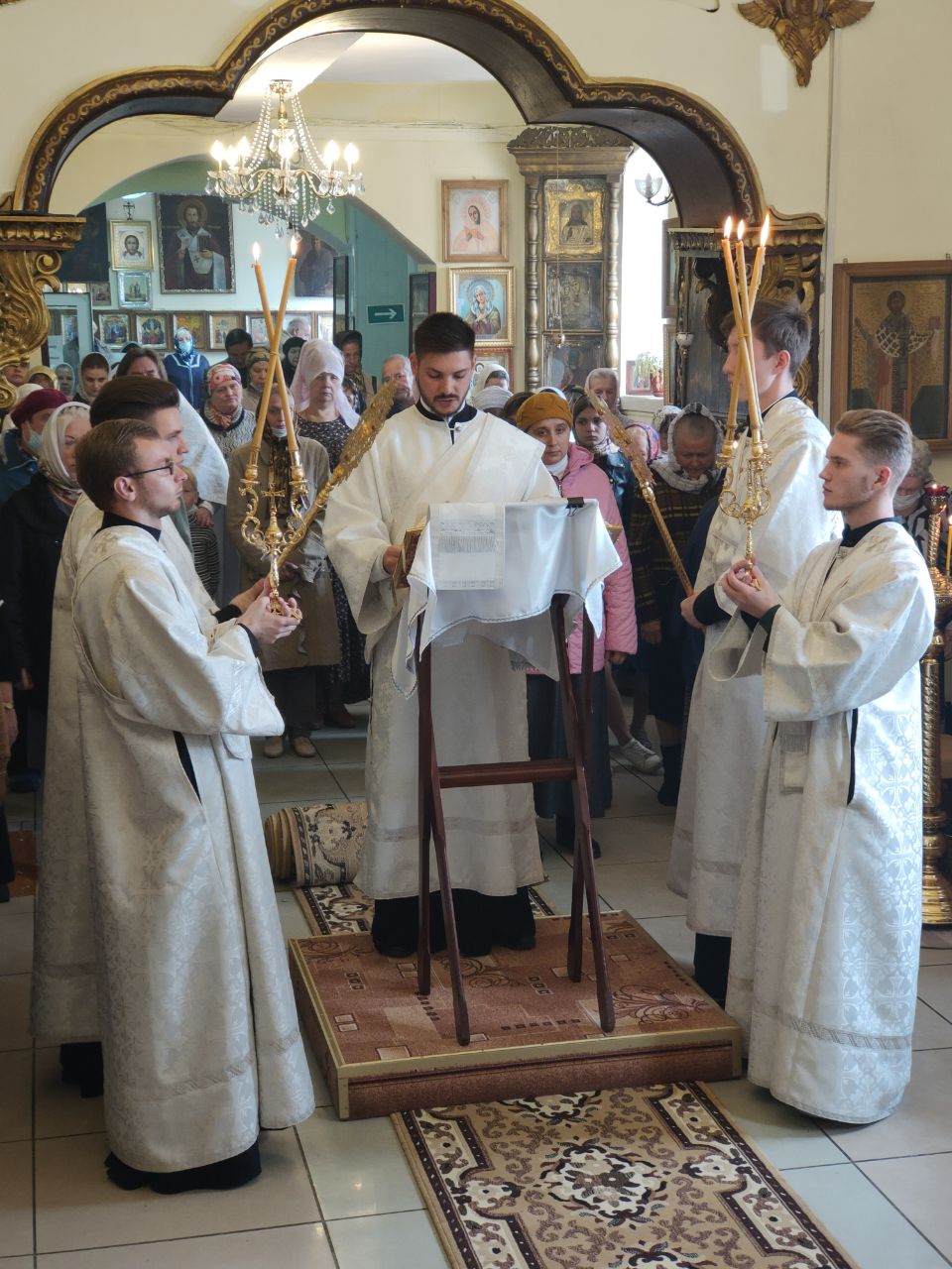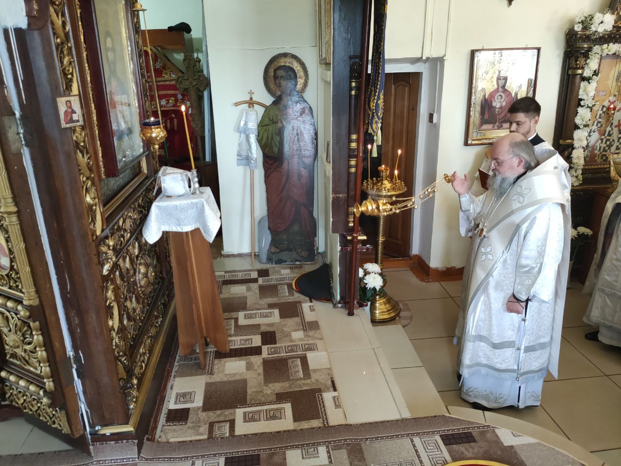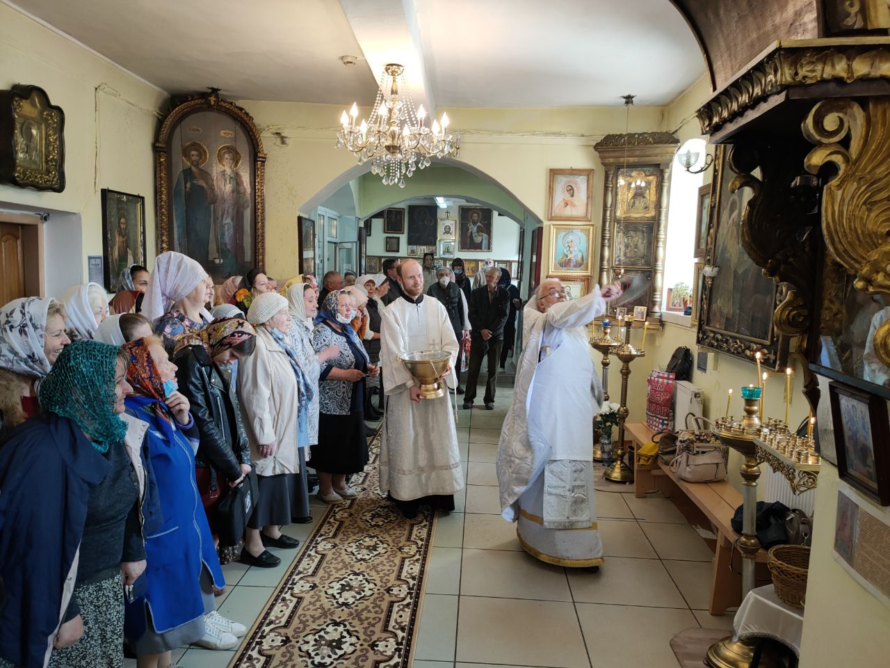 В храме был установлен дубовый иконостас, и иконы в дубовых киотах, переданные из храма в селе Роща Боровского района.
