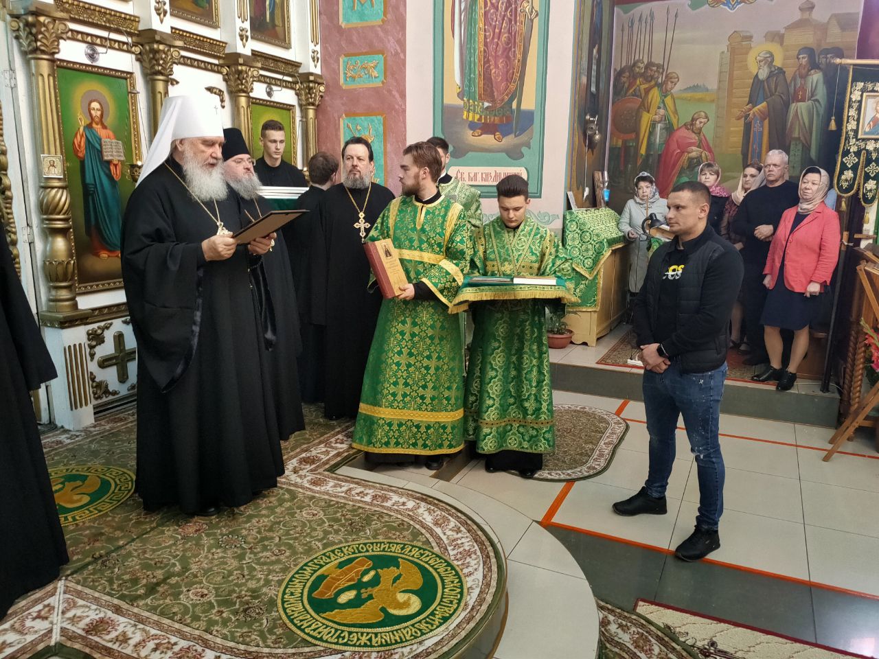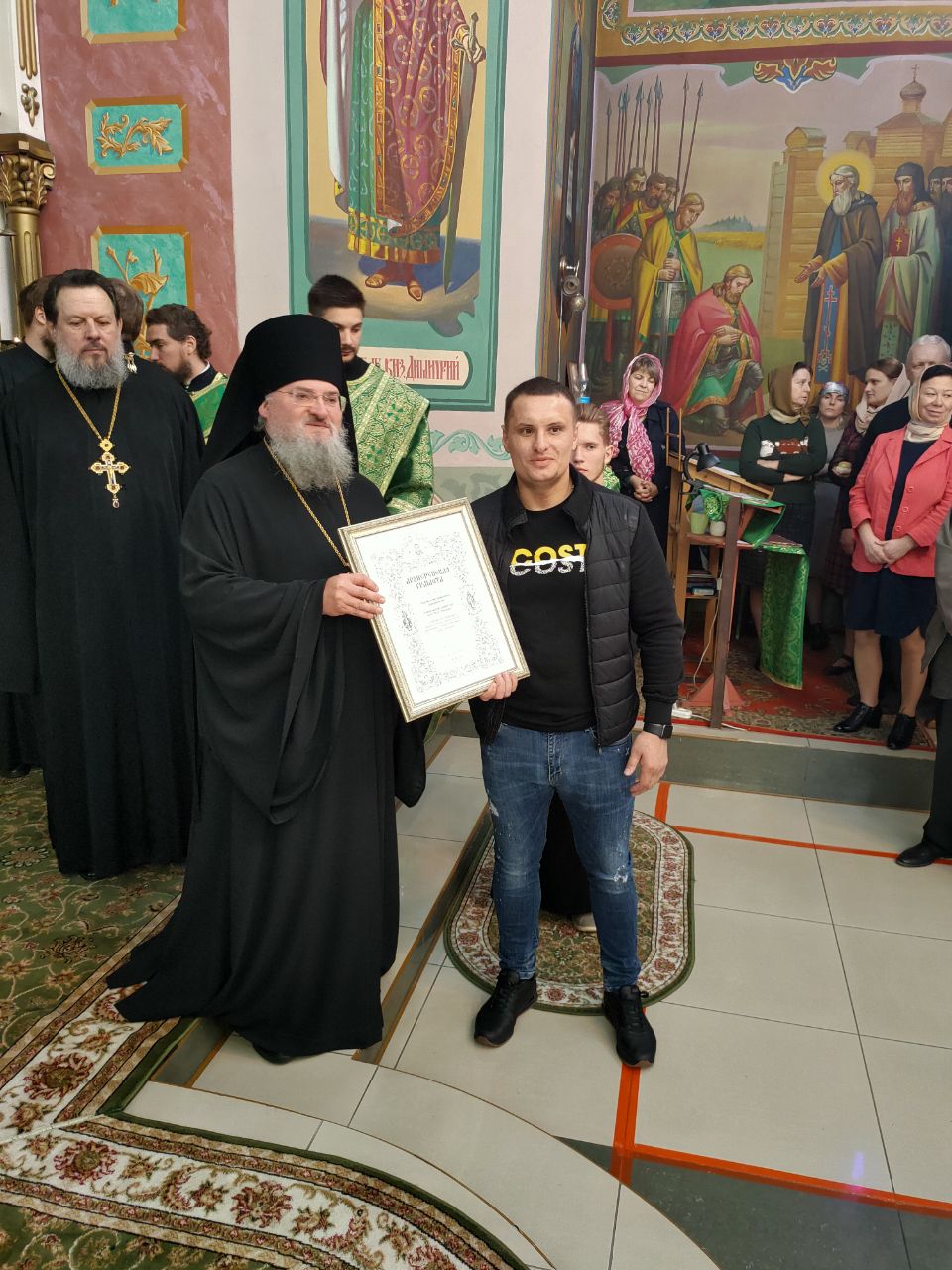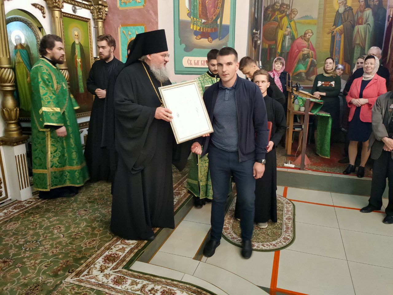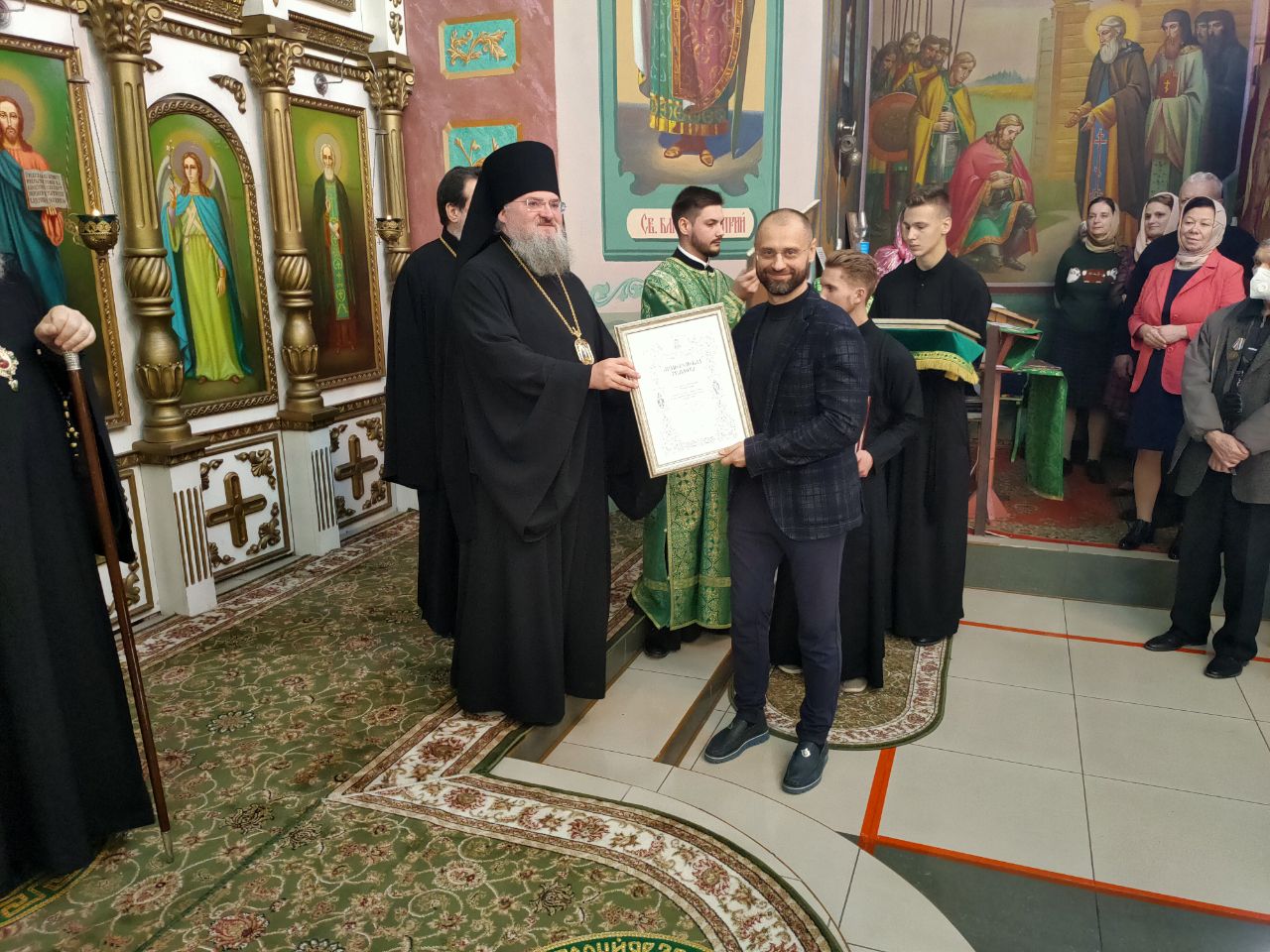Со словами поздравления к настоятелю храма отцу Василию обратился  епископ  Козельский и Людиновский Никита. В своих словах владыка отметил колоссальный труд батюшки по восстановлению храма. Так же владыка отметил тех людей, которые помогают настоятелю в его трудах по реставрации храма и наградил Архиерейскими грамотами Моисеенкова Алексия Владимировича, Гайдукова Александра Николаевича, Дорошенкова Сергия Александровича, Панову Галину Викторовна, Шиварутиных  Маргариту Викторовна и Андрея Анатольевича, Быковых Елену Валентиновну и Игоря Анатольевича. Владыка Никита так же отметил особые заслуги Воскресной школы «Радонеж» и преподнес в дар школе в лице руководителя Клячиной Татьяны Ивановны ценный подарок