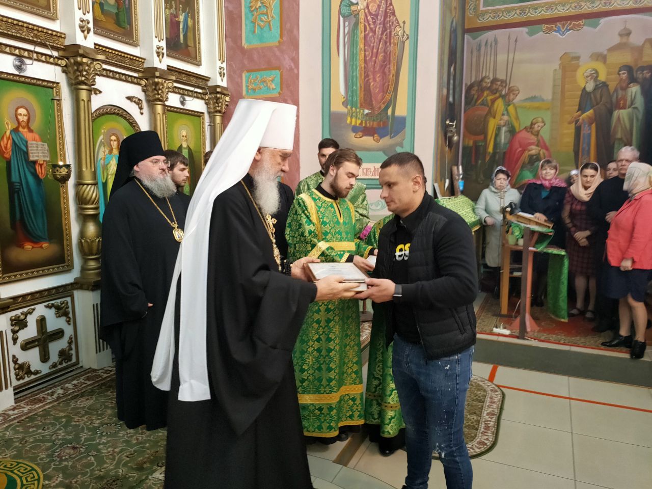 Затем  Глава Калужской митрополии – митрополит Калужский и Боровский Климент поздравил  отца Василия с 30- летним юбилеем храма и, во внимание к усердным трудам во славу Святой Церкви, отметил благодарственными письмами  прихожан храма Гайдукова Александра Николаевича и Дорошенкова Сергия Александровича, вручив им так же памятные подарки.