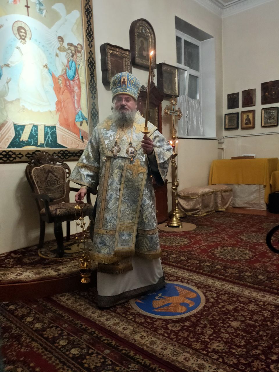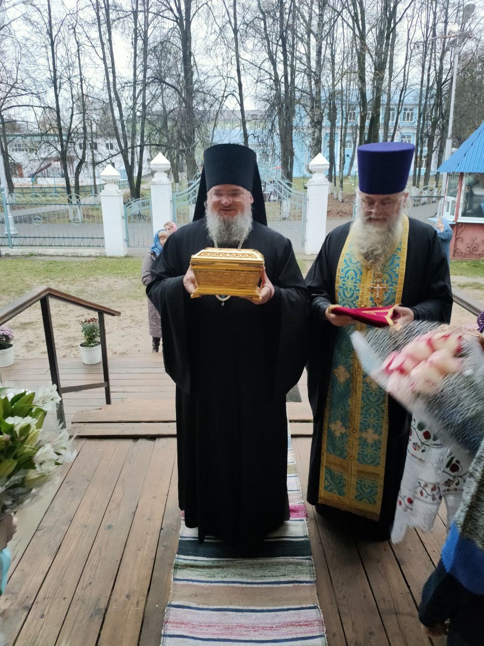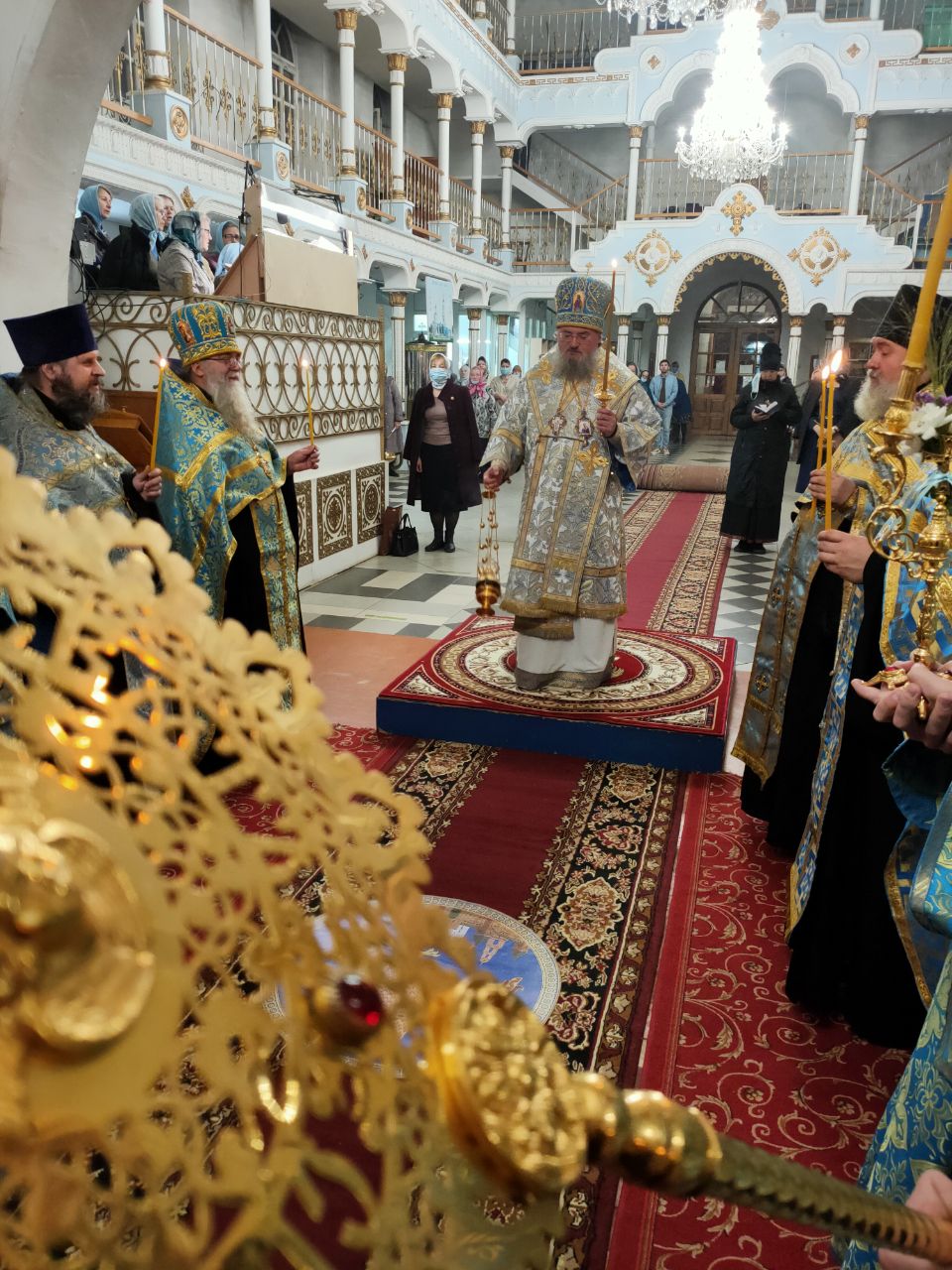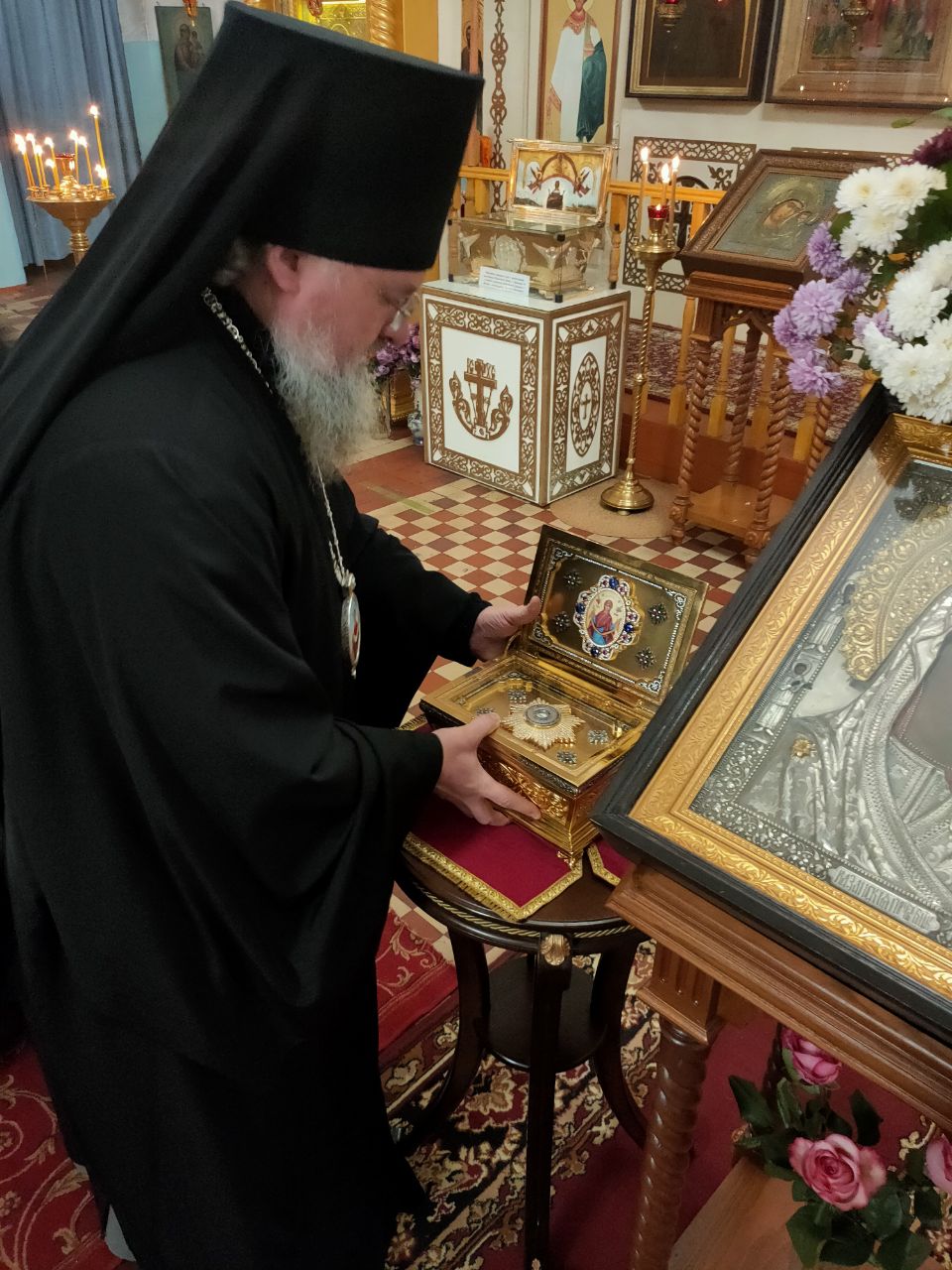 Перед началом богослужения владыка внес в собор, доставленный для поклонения богомольцев, ковчег с частицей пояса Пресвятой Богородицы, хранящейся в Благовещенском храме города Козельска.