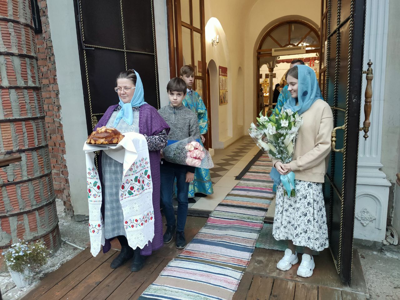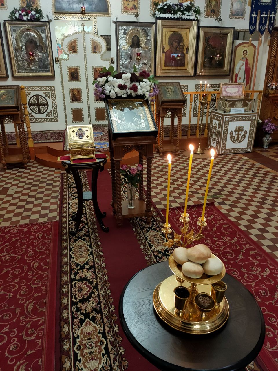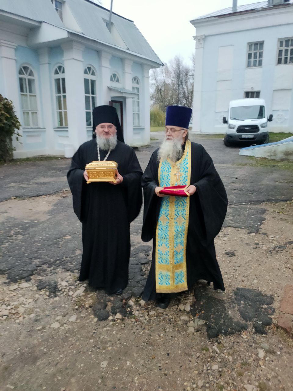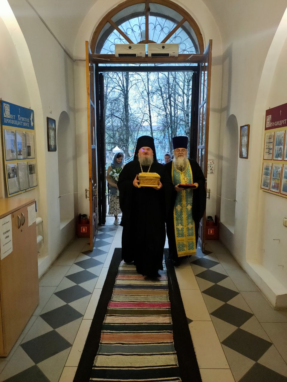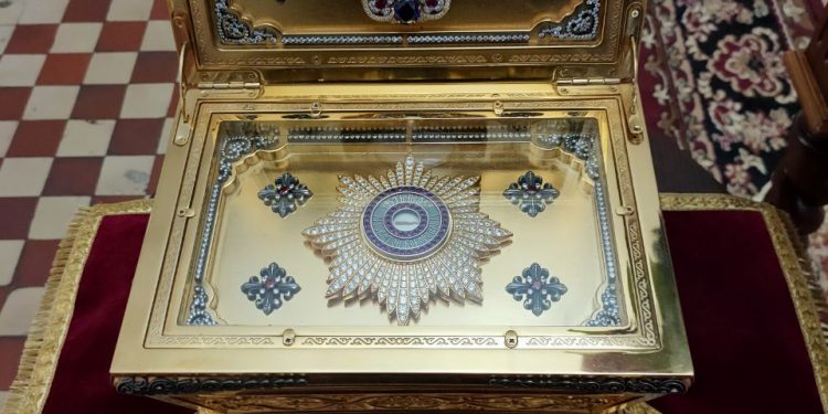 Перед началом богослужения владыка внес в собор, доставленный для поклонения богомольцев, ковчег с частицей пояса Пресвятой Богородицы, хранящейся в Благовещенском храме города Козельска.