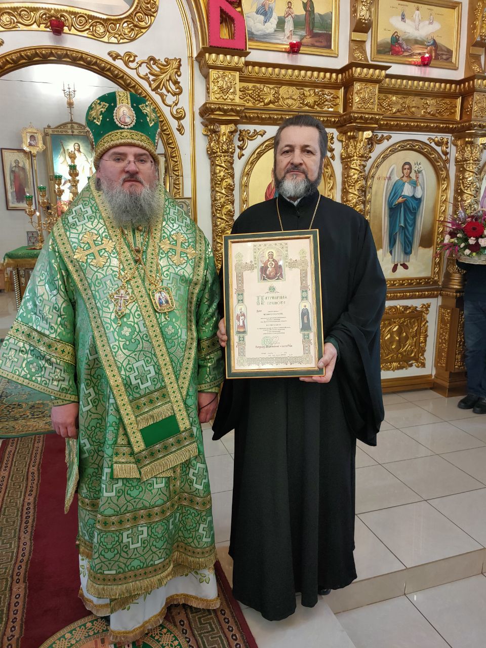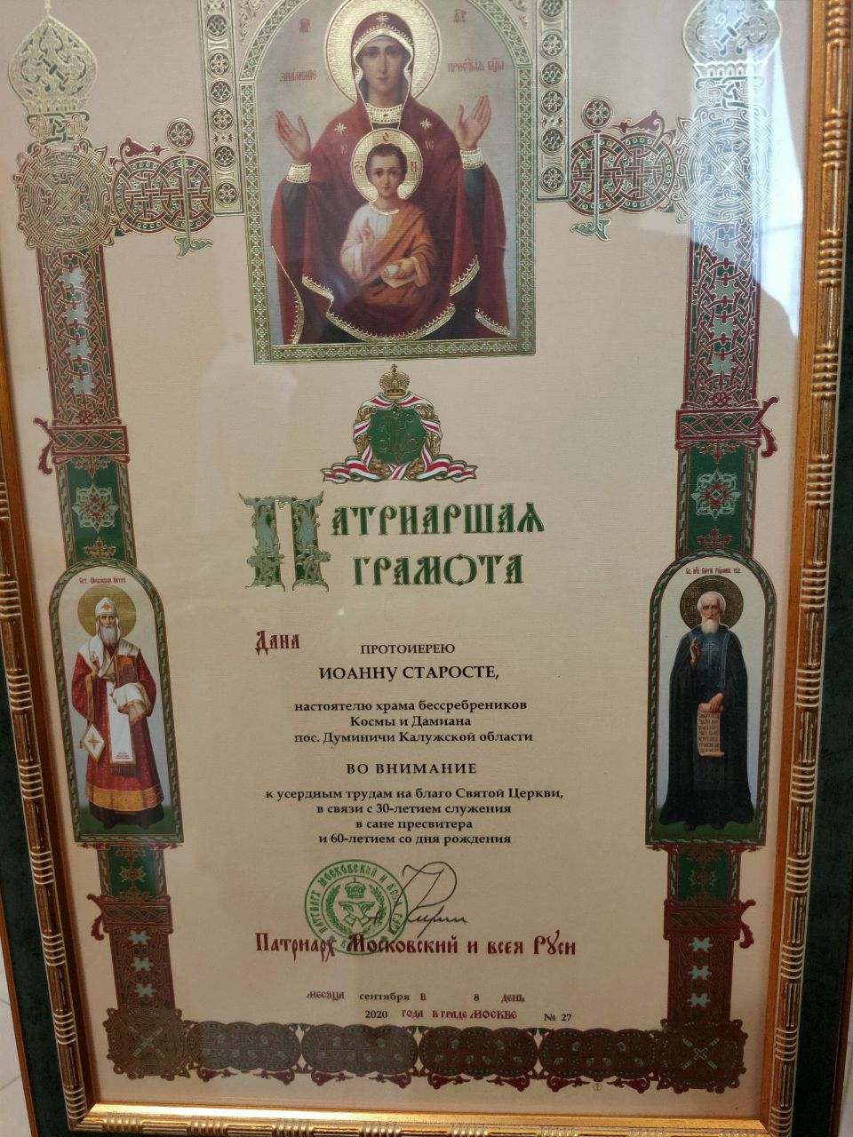Во внимание к усердным трудам во славу Святой Православной Церкви и в связи с 60-летим со дня рождения и 30-летием служение в священном сане архипастырь вручил настоятелю храма протоиерею Иоанну Старосте благословенную грамоту Святейшего Патриарха Московского и всея Руси КИРИЛЛА.