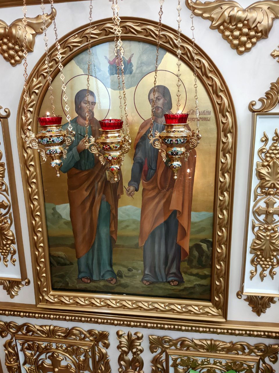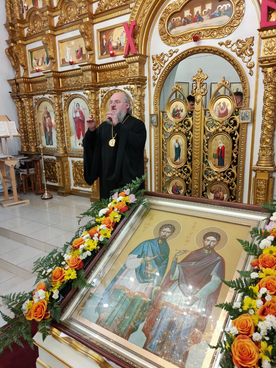 По отпусте литургии священнослужители совершили праздничный молебен и крестный ход вокруг храма, в завершение которого, вознеся молитву святым бессребреникам, владыка обратился к богомольцам с проповедью.