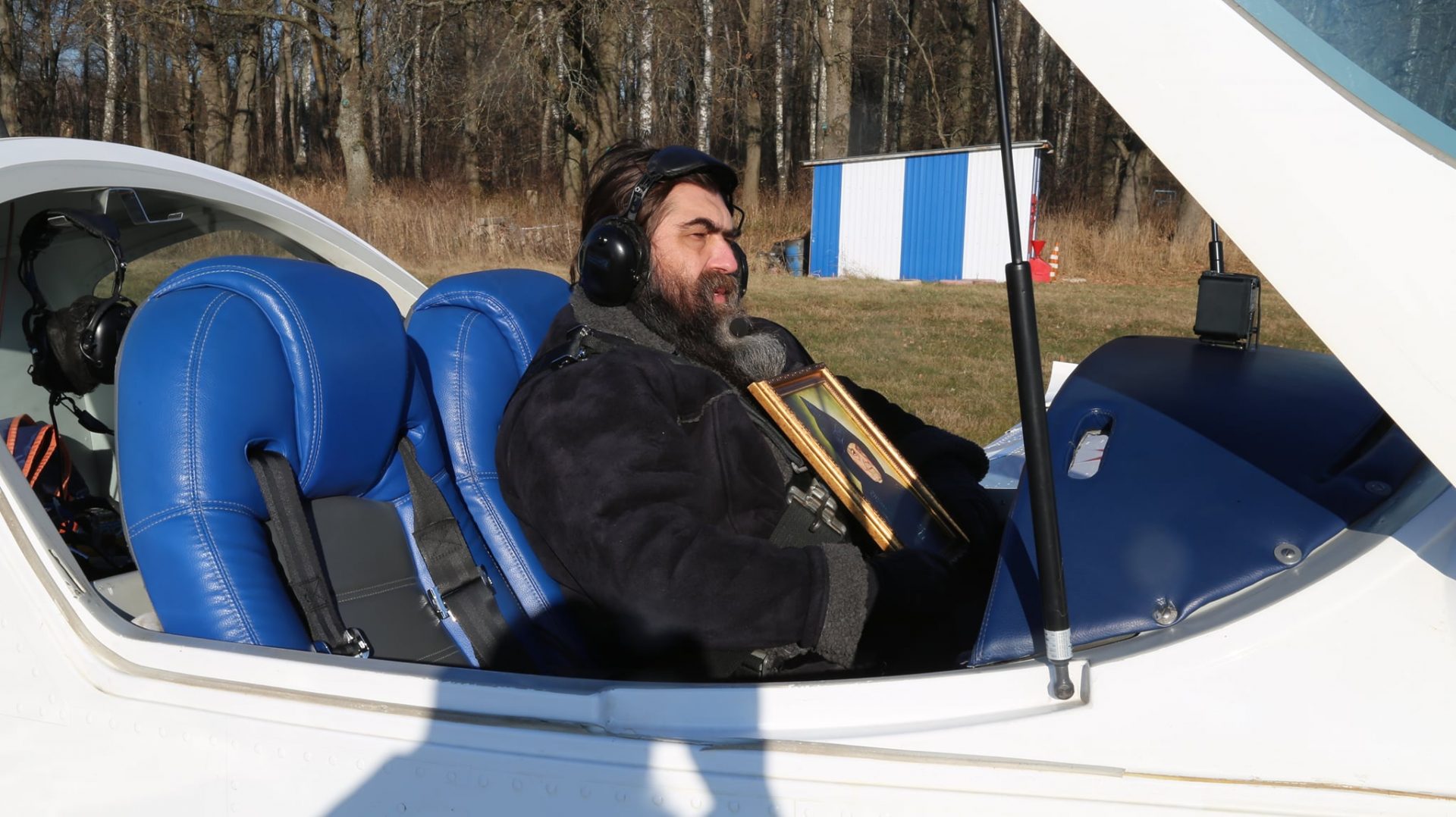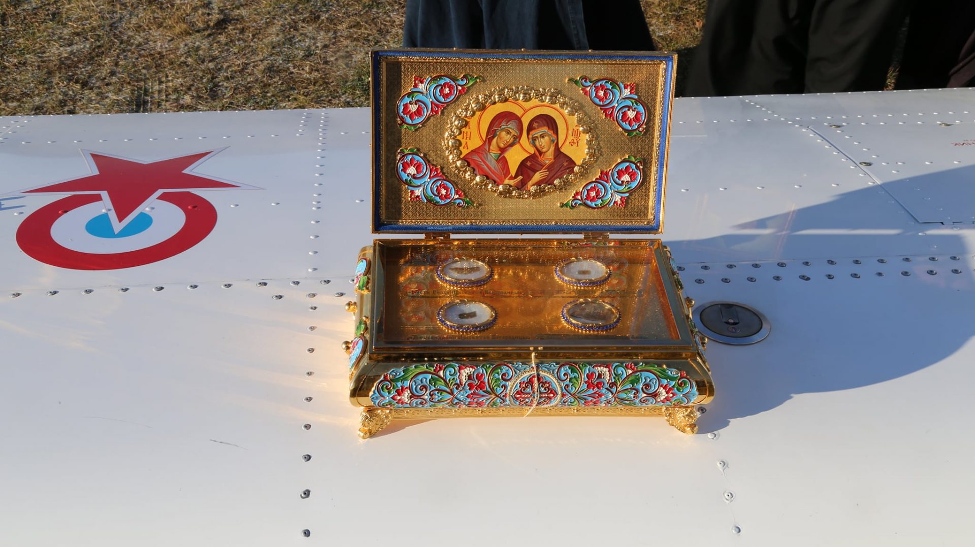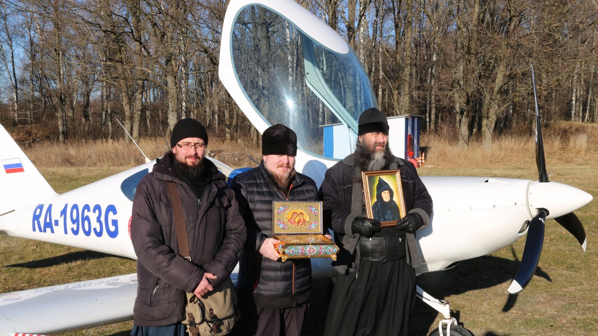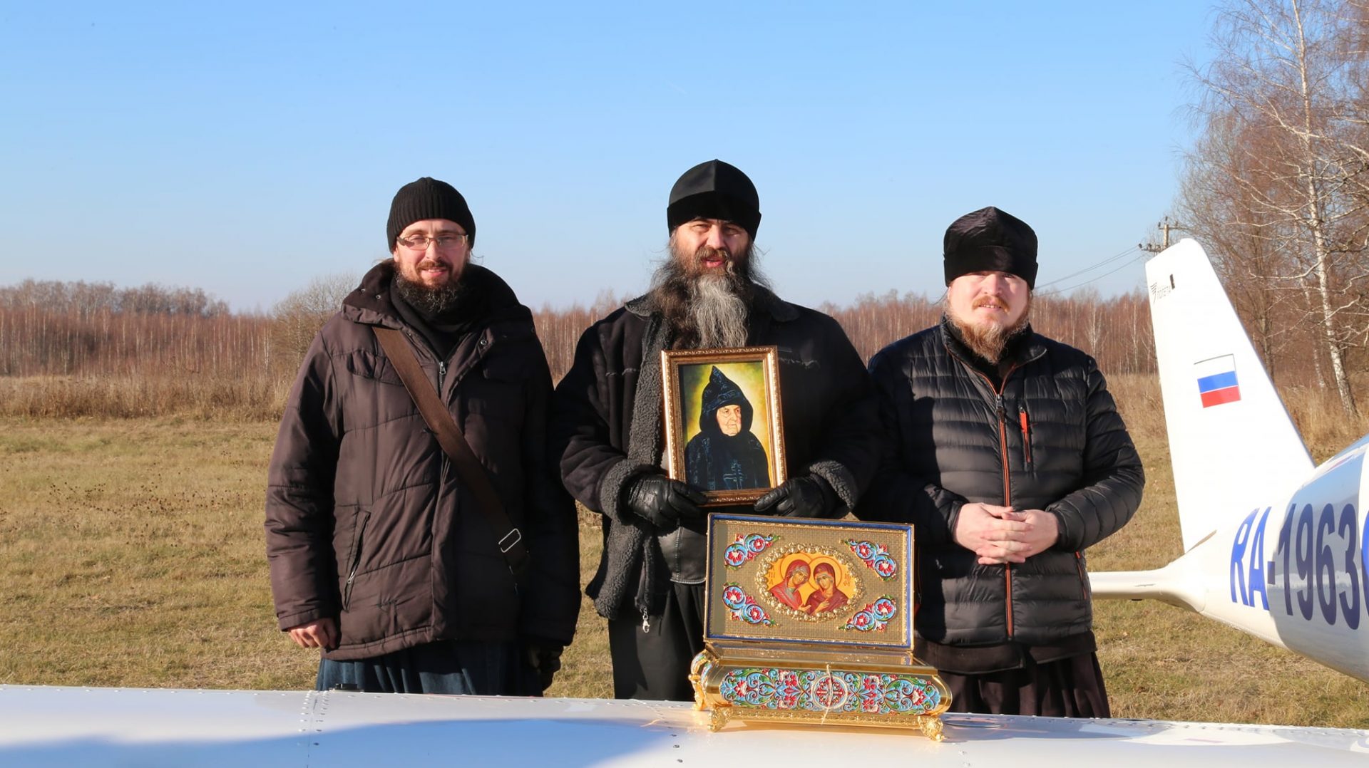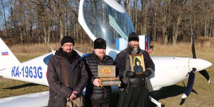 Молитва началась в храме в честь Преображения Господня в селе Нижние Прыски Козельского района вместе с настоятелем храма иереем Тихоном Худяковым. По прибытие на аэродром Хатенки «Аэроклуба Нормандия — Неман» игумен Михаил, взяв на борт самолета мощевик с частицами Ризы, Пояса и Сандалии Пресвятой Богородицы и частицей мощей святой праведной Анны, а также портрет покровительницы монастыря схимонахини Сепфоры (Шнякиной), облетел Козельский район, продолжая молитву в небе.