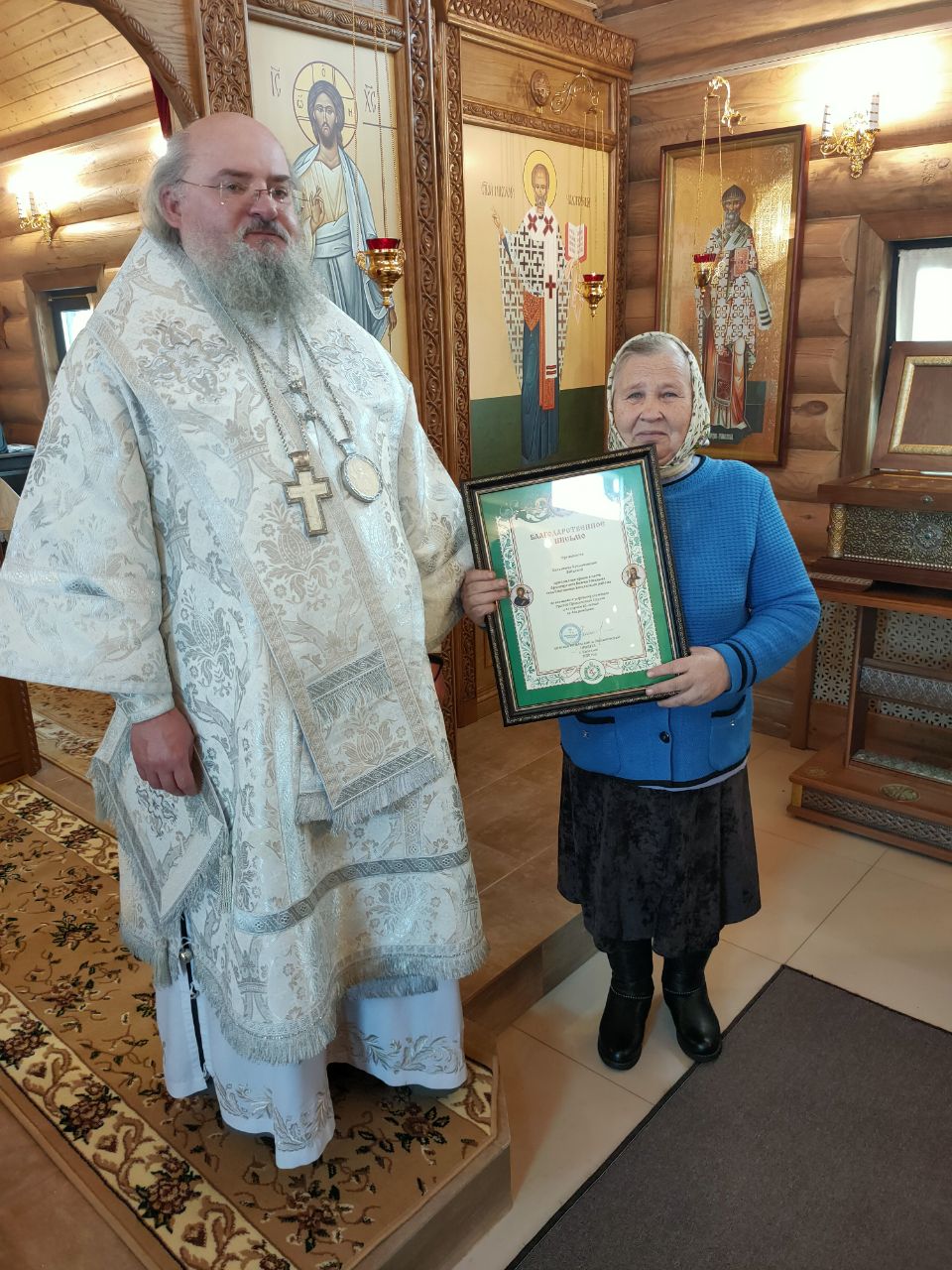 Благодарственное архиерейское письмо было также вручено прихожанке храма Валентине Кузминичне Зайцевой во внимание к трудам в приходе и в связи с шестидесятипятилетием со дня рождения.