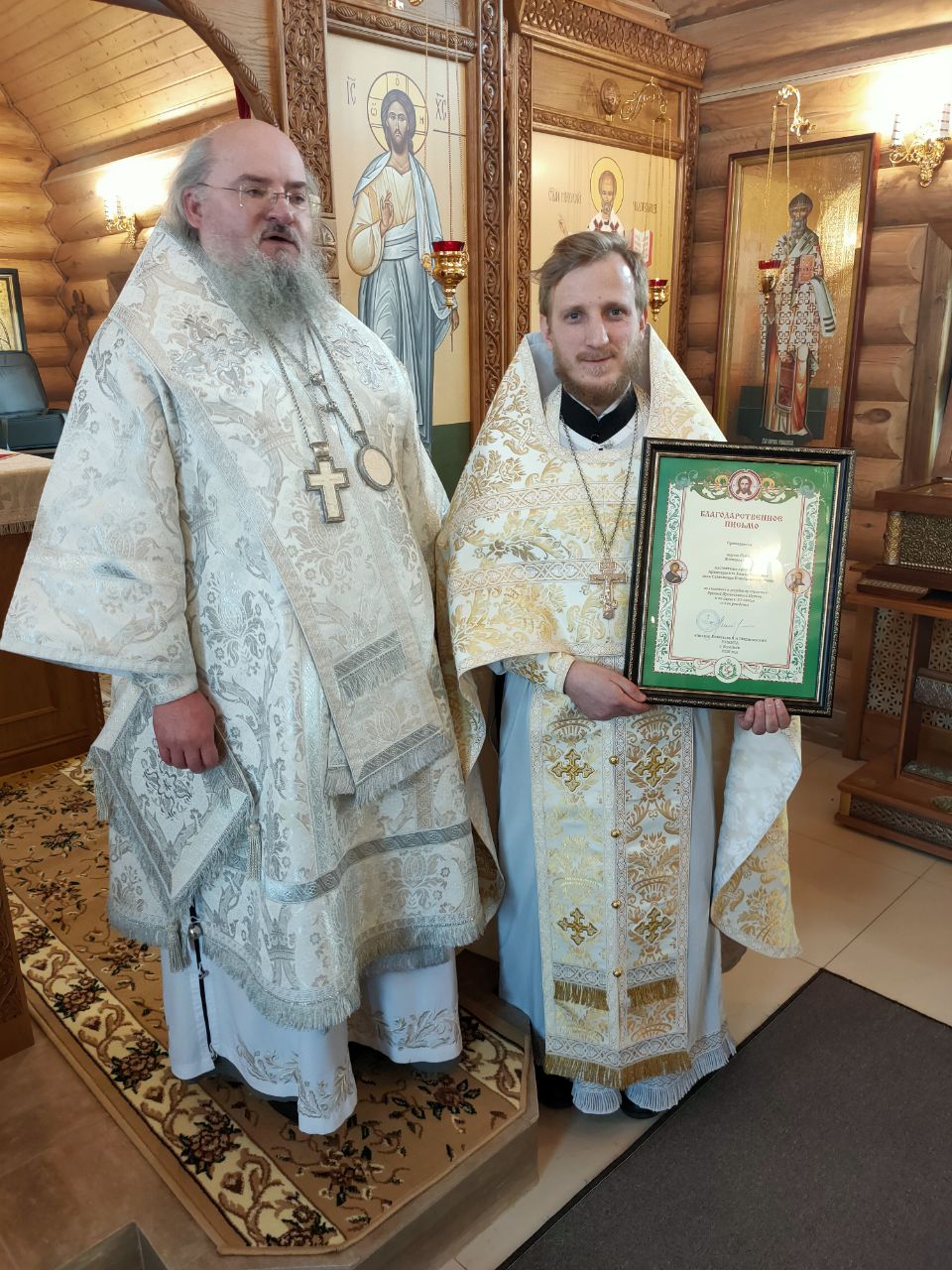 Владыка поздравил настоятеля прихода иерея Льва Шиповского с тридцатилетием со дня рождения и вручил ему благодарственное письма и памятный подарок.